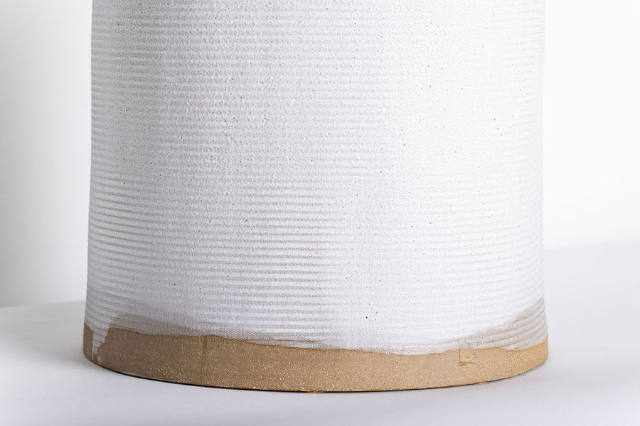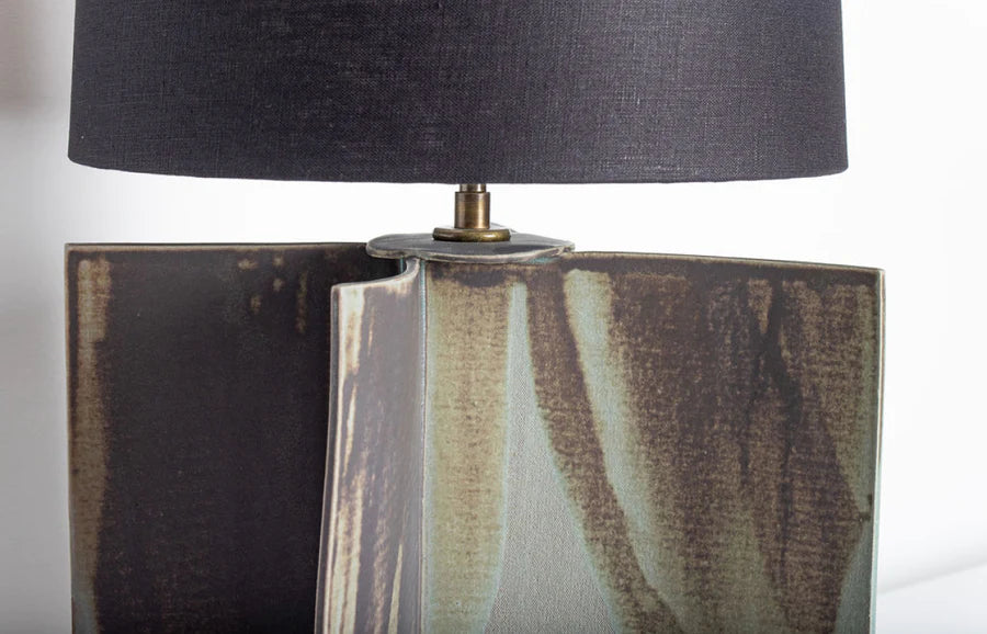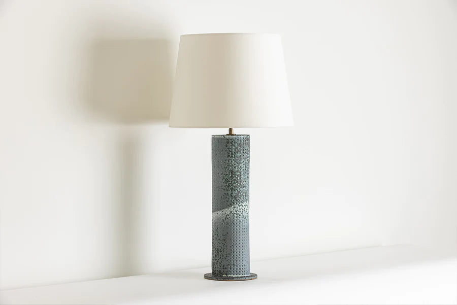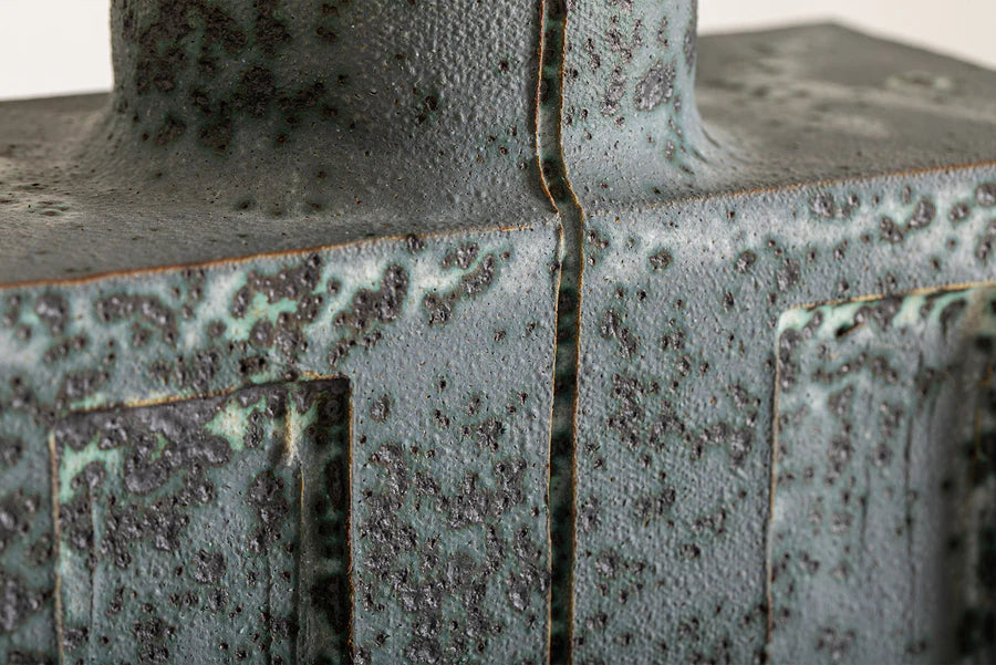 Verdigris takes its name from the vivid green pigment that is created when copper oxidizes. However, green is not the only color this glaze is capable of. A single layer of Verdigris gives you a coppery green. A few more layers and it becomes more vibrant. And, after a long heavy dip, it fires matte and grey. Due to this range, we tend to use it on its own, as seen on the poured Truro lamp, which looks as if it has rivulets of oxidized copper streaming across its surface.