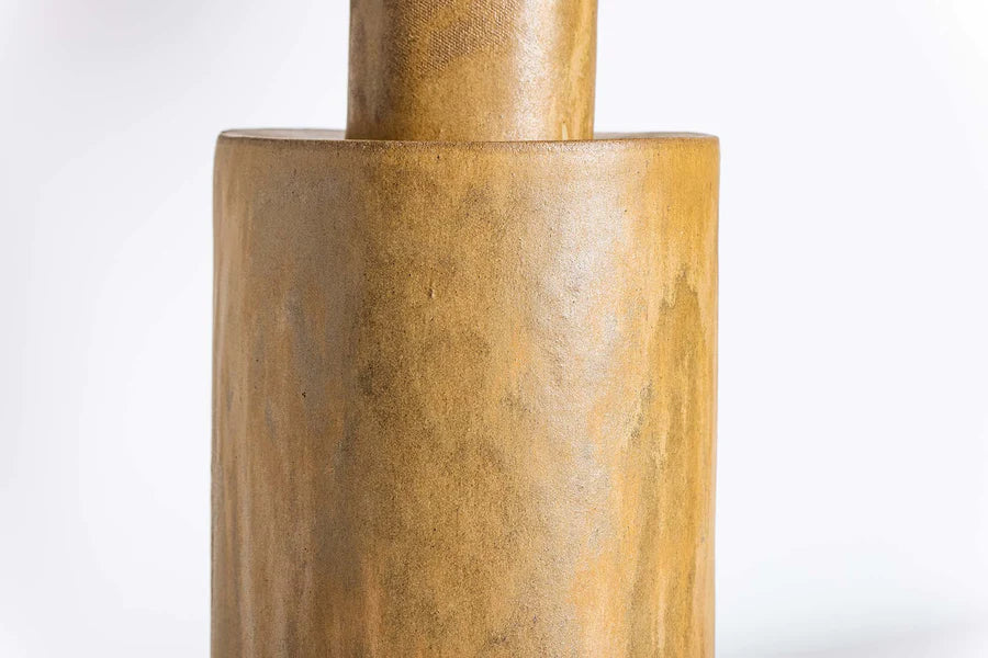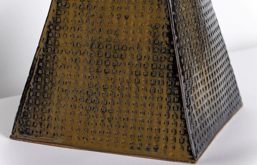 The mycological-like finish of this glaze is achieved through the overlap of our Lead and Ochre glazes and is an effect that can be varied. Thinner, more even overlaps result in a more lustrous finish but a more mottled coloration. While thicker overlaps create a rich golden color with red-brown undertones.