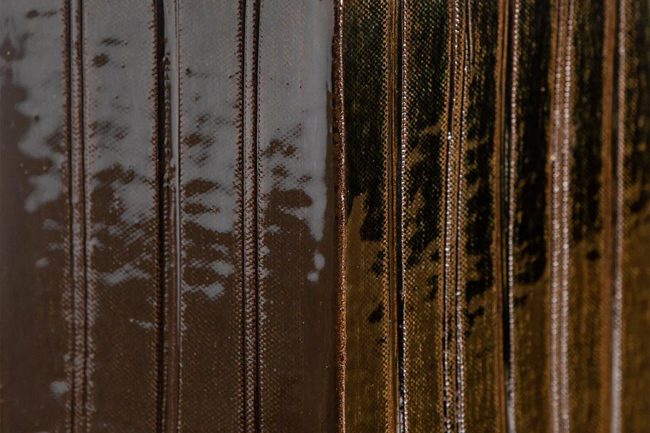 Hide is a nod to the leather-like finish that is created with thicker applications of the glaze. On textured surfaces and edges, this matte-satin glaze intensifies, burnishing its buff tone to a warm umber. It also contains a subtle fleck, which shimmers gently under direct light