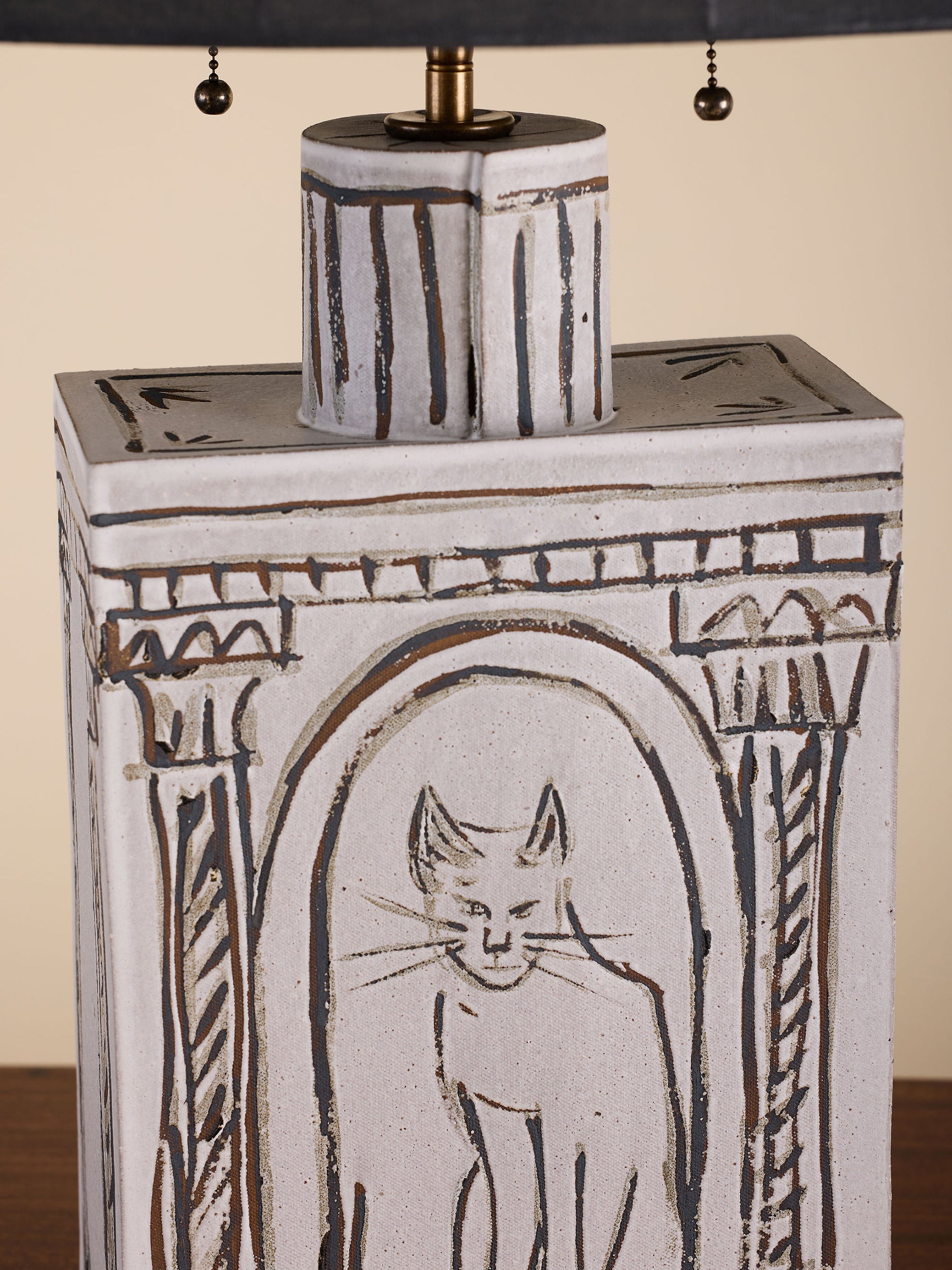Pictured here in black iron oxide and chalk glazes, antique brass fittings, a black cloth cord, two-light cluster with pull-chain, and a smoke linen shade.