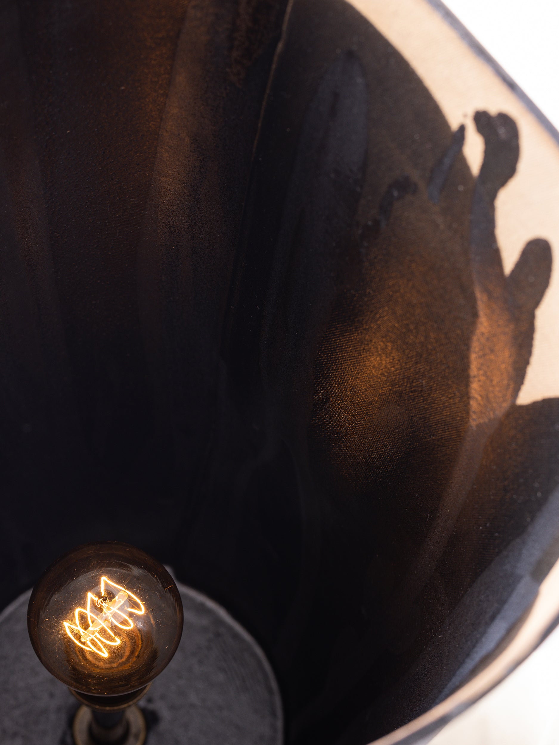 Pictured here in matte-black & lead poured glaze, antique brass fittings, a black-cloth cord, and an in-line paddle switch.