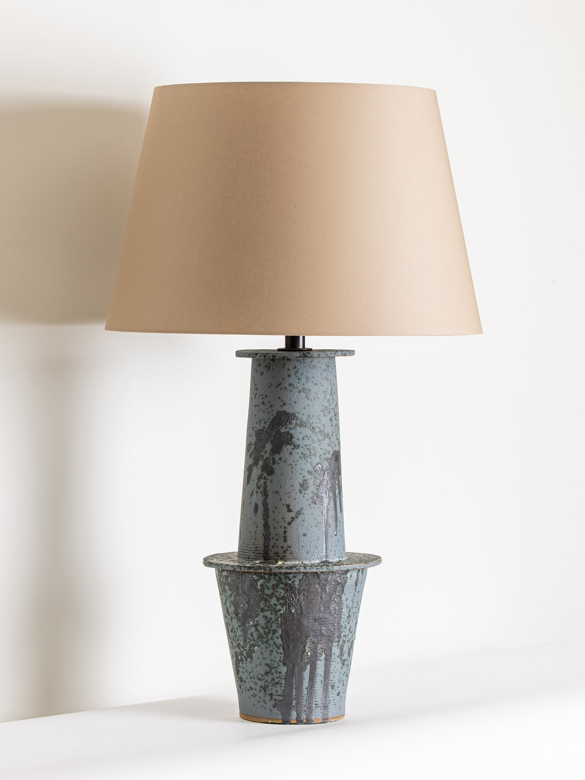 Pictured here in lichen poured glaze, antique brass fittings, beige cloth cord, full range dimmer socket and a wheat handkerchief linen shade.