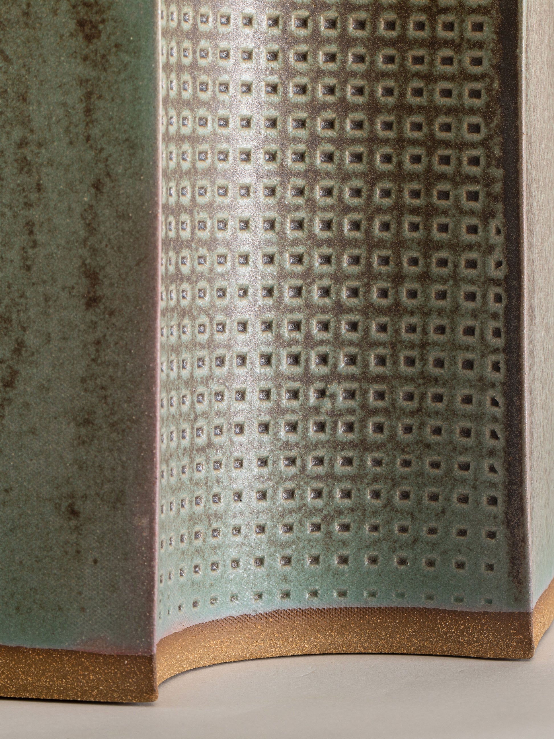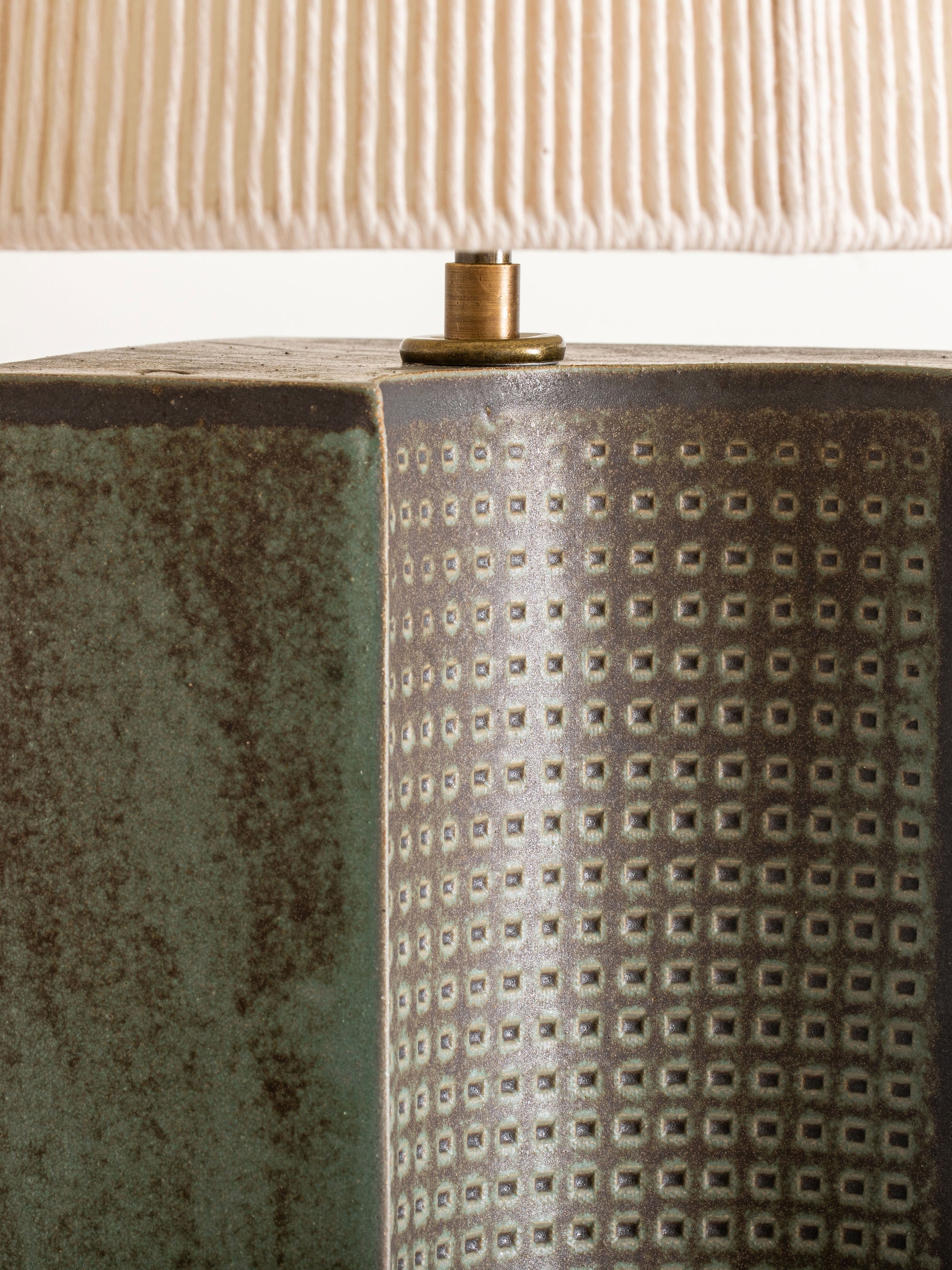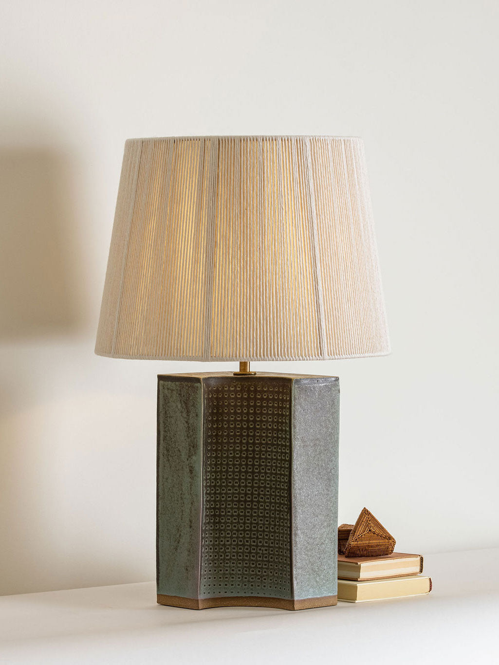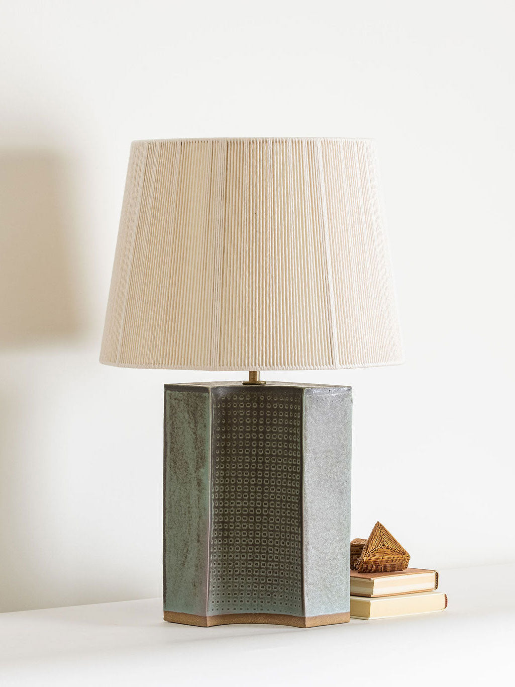 Our stoneware Clark Lamp is handcrafted using slab-construction techniques. The lamp’s pattern is created by rolling the surface with textured rolling pins and rods.