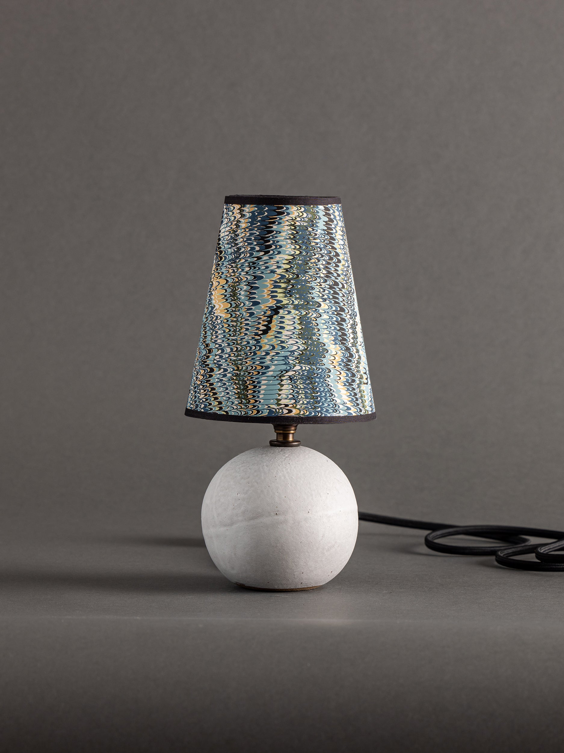 Pictured here in chalk dipped glaze, antique brass fittings, black cloth cord, in-line switch, and a marine nonpareil pattern hand-marbled paper shade