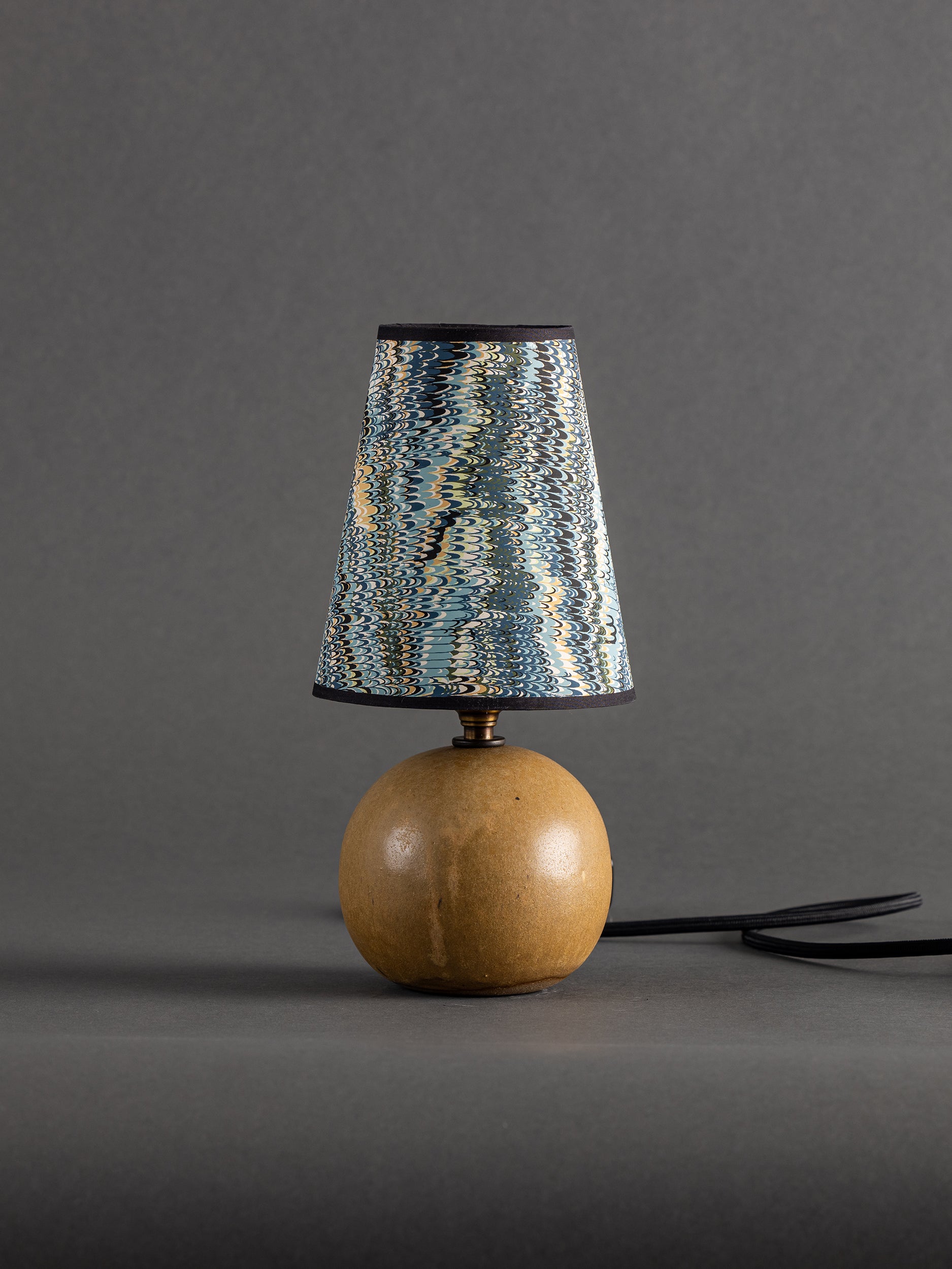 Pictured here in hide dipped glaze, antique brass fittings, black cloth cord, in-line switch, and a marine nonpareil pattern hand-marbled paper shade.