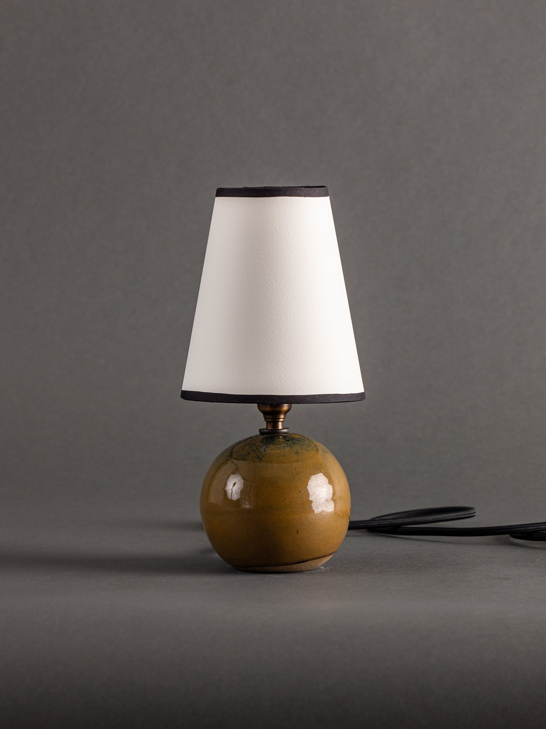 Pictured here in mushroom dipped glaze, antique brass fittings, black cloth cord, in-line switch, and an archival watercolor paper shade.