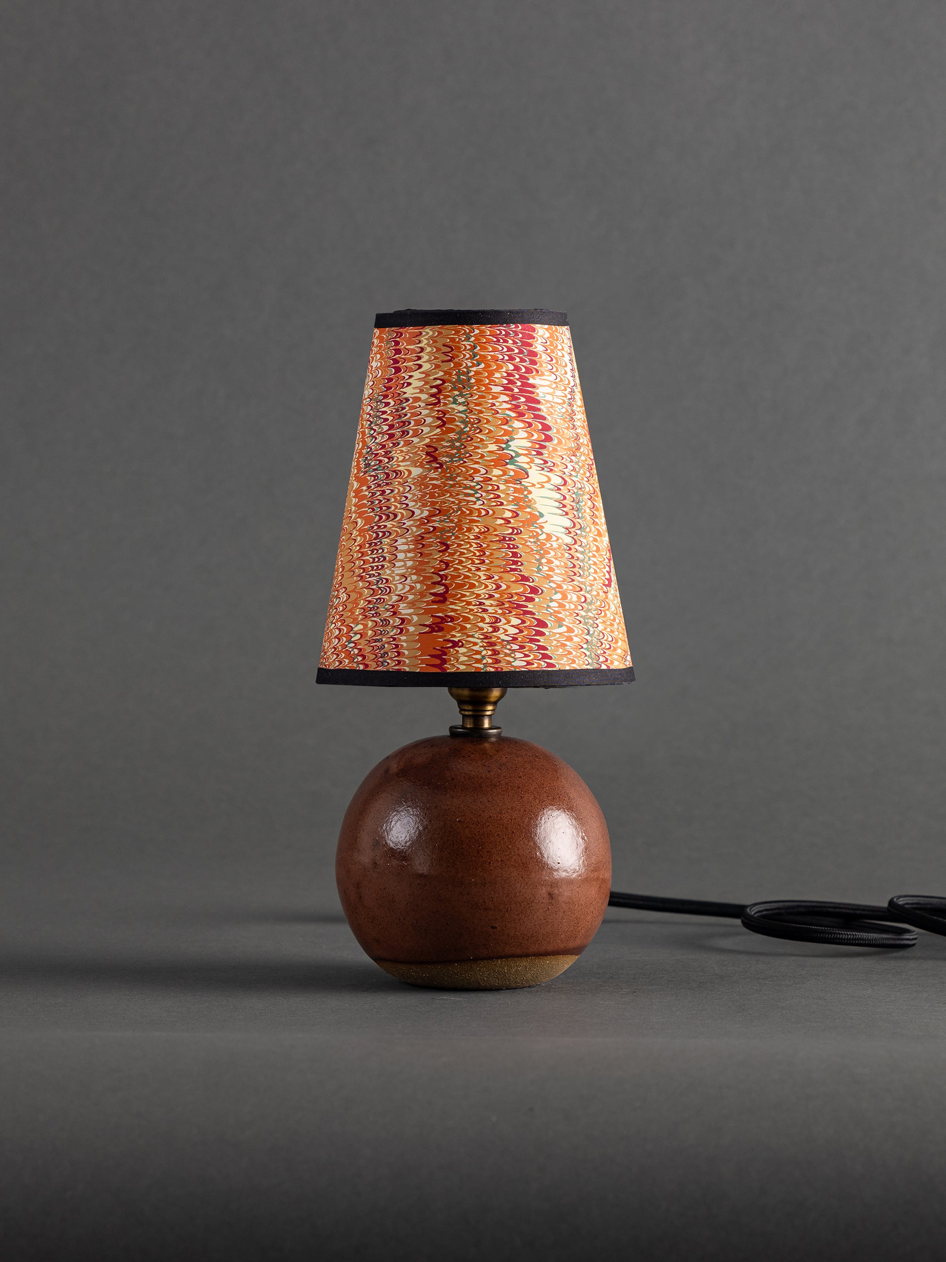 Pictured here in red clay dipped glaze, antique brass fittings, black cloth cord, in-line switch, and a persimmon nonpareil pattern hand-marbled paper shade