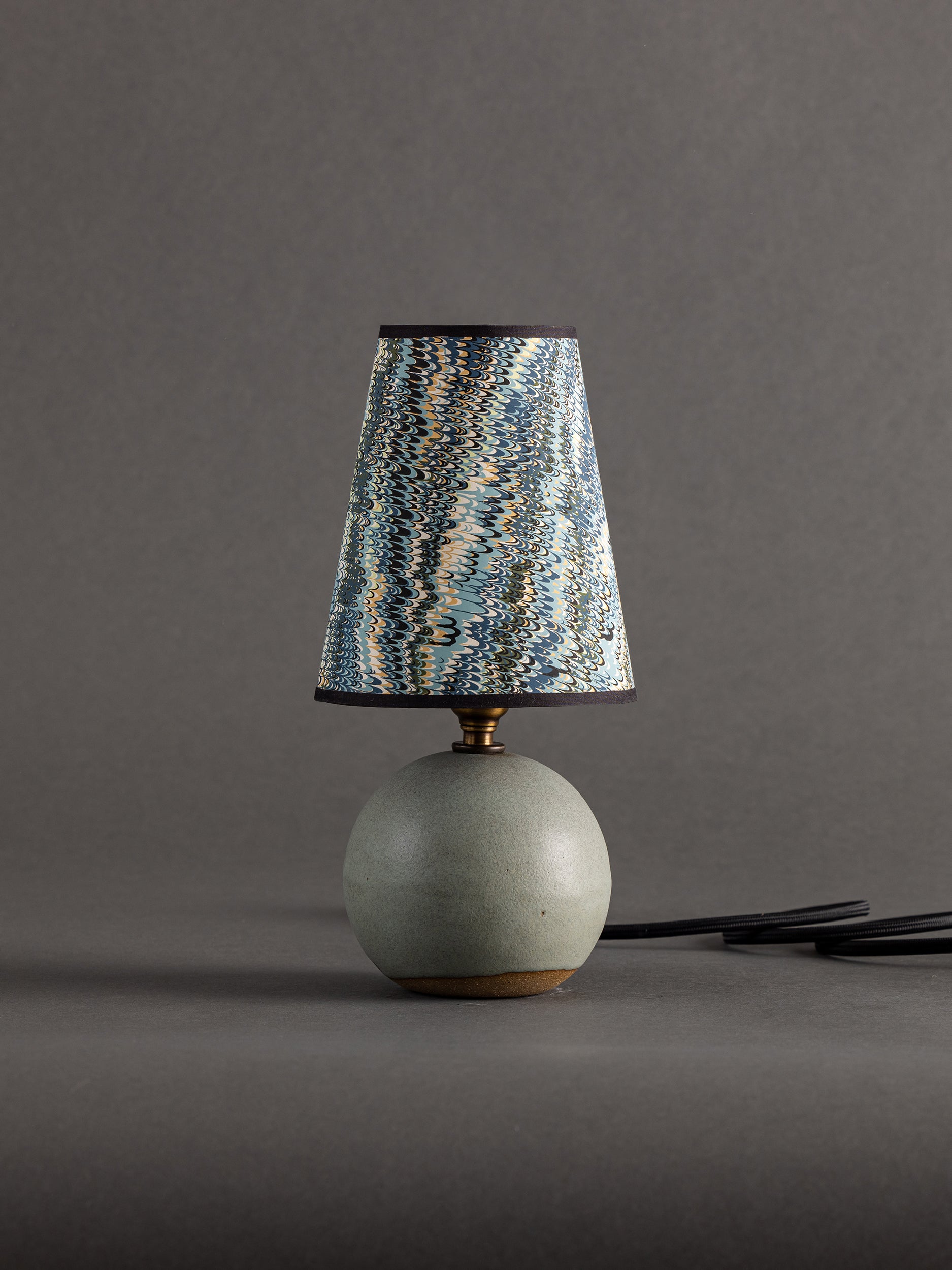 Pictured here in sea dipped glaze, antique brass fittings, black cloth cord, in-line switch, and a marine nonpareil pattern hand-marbled paper shade.
