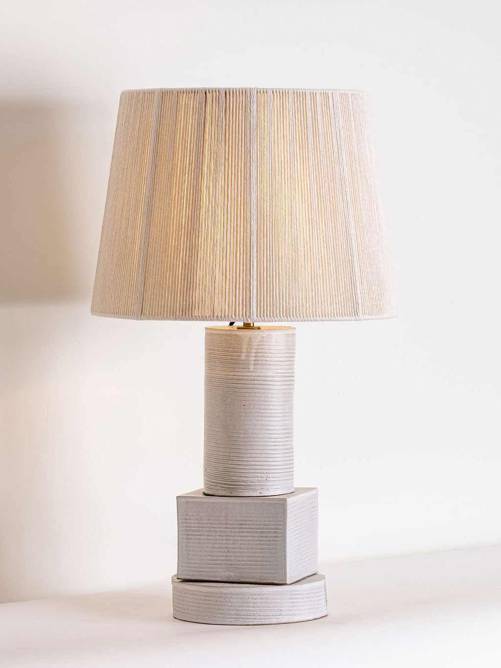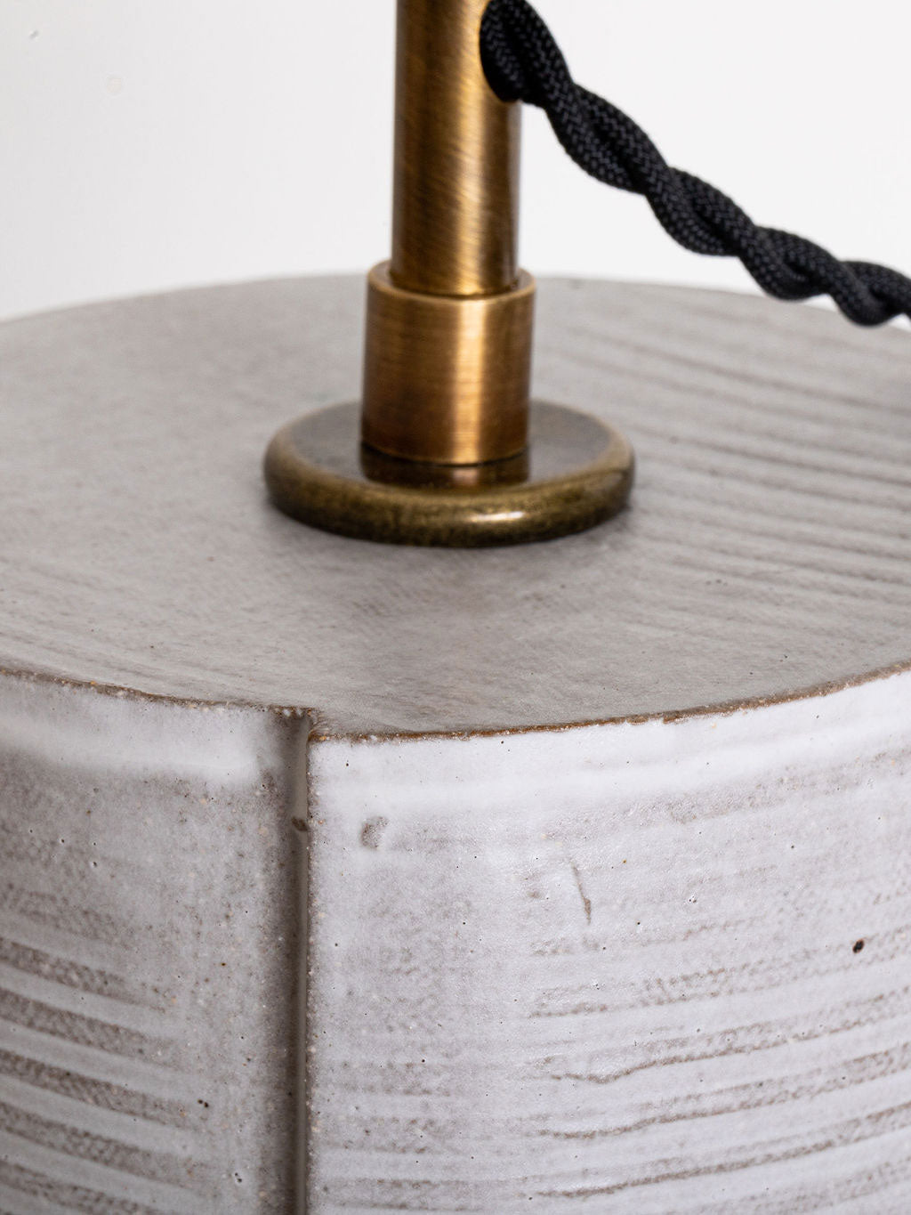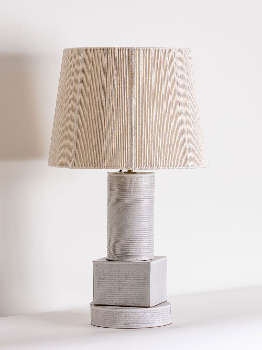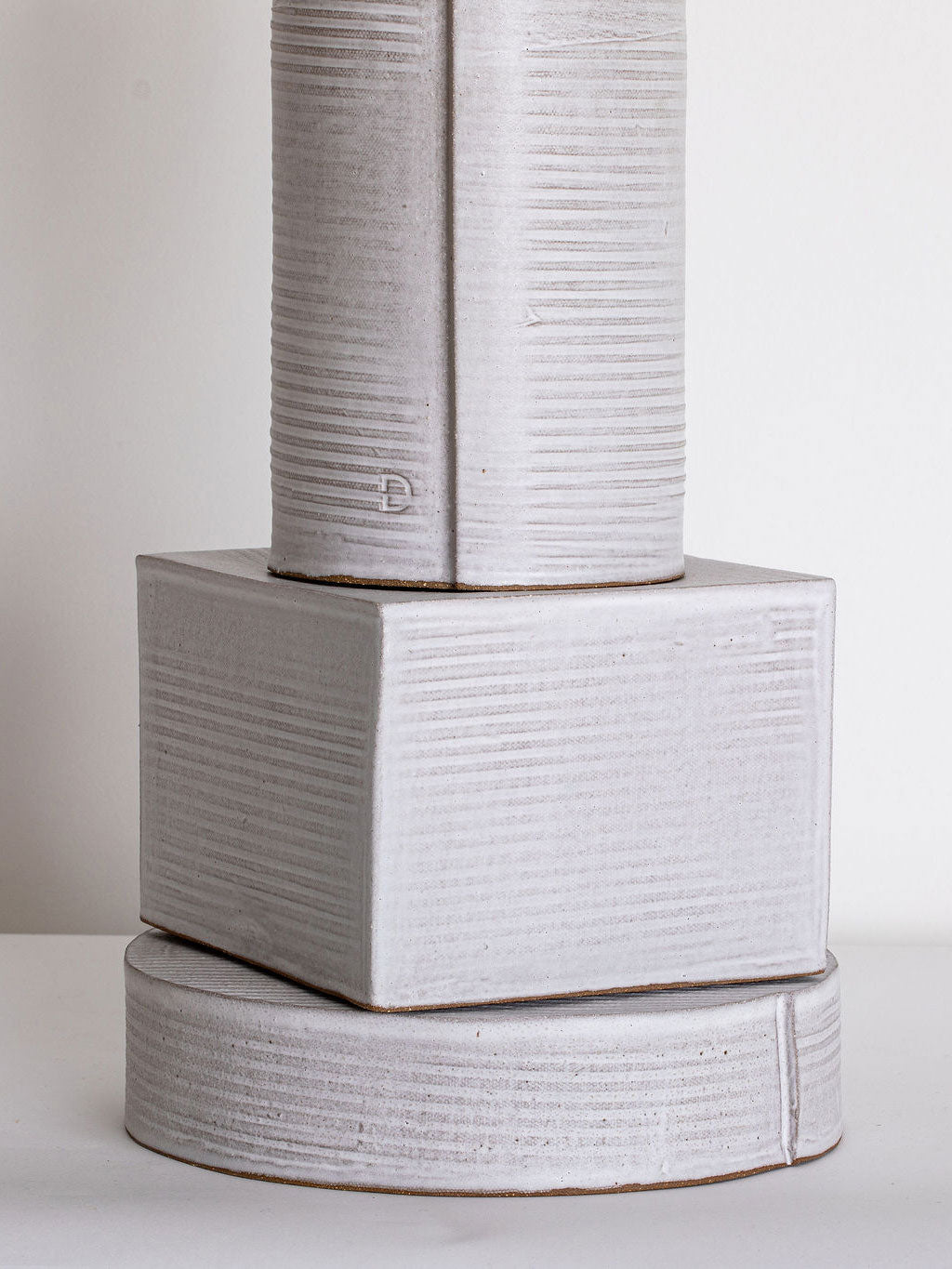 Our stoneware Column Lamp is handcrafted using slab-construction techniques. The lamp’s pattern is created by rolling the surface with textured rolling pins and rods.