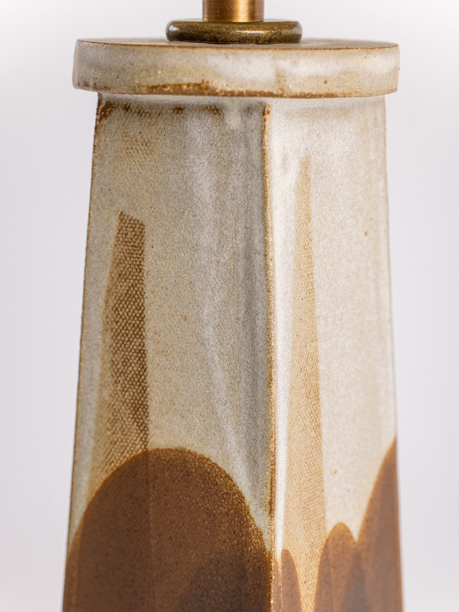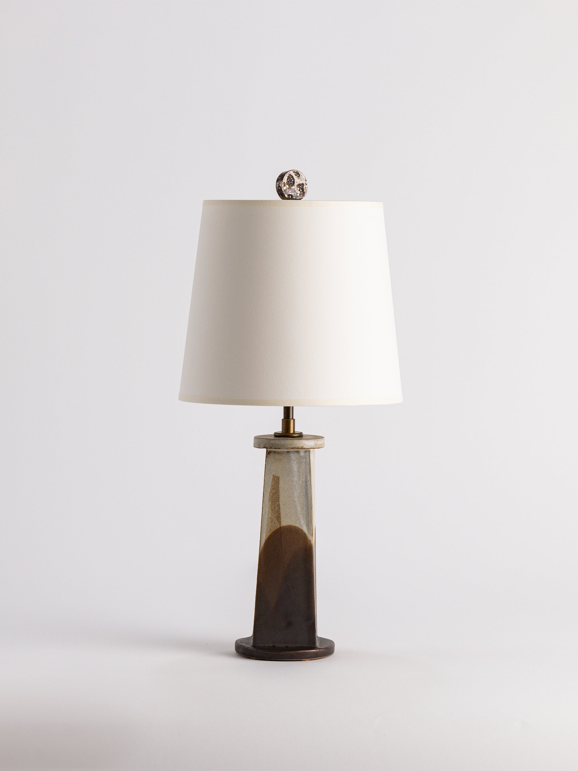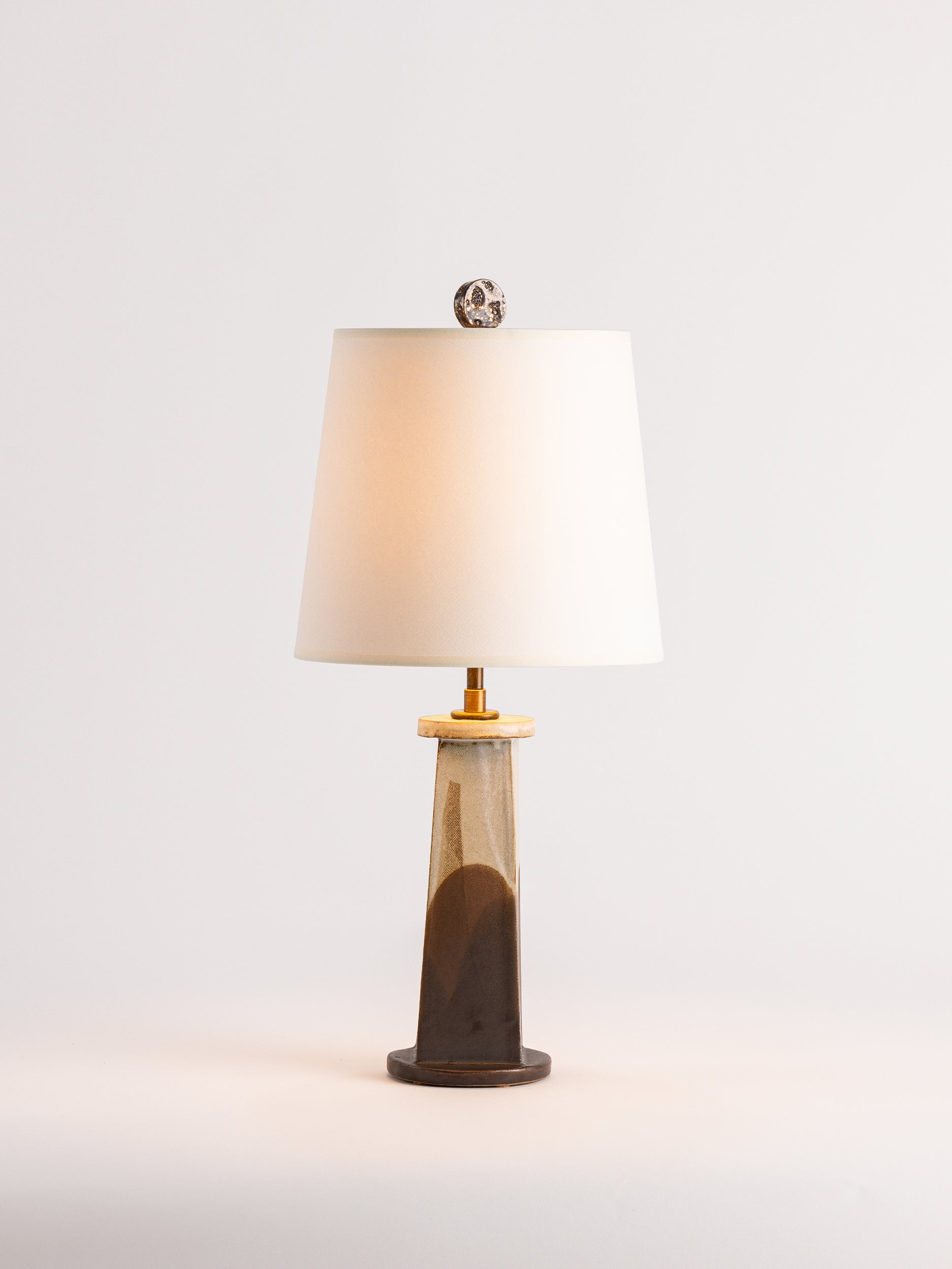 Pictured here in parchment and walnut poured glaze, antique brass fittings, beige cloth cord, full-range dimmer socket, a cracked gold finial, and an archival paper shade.