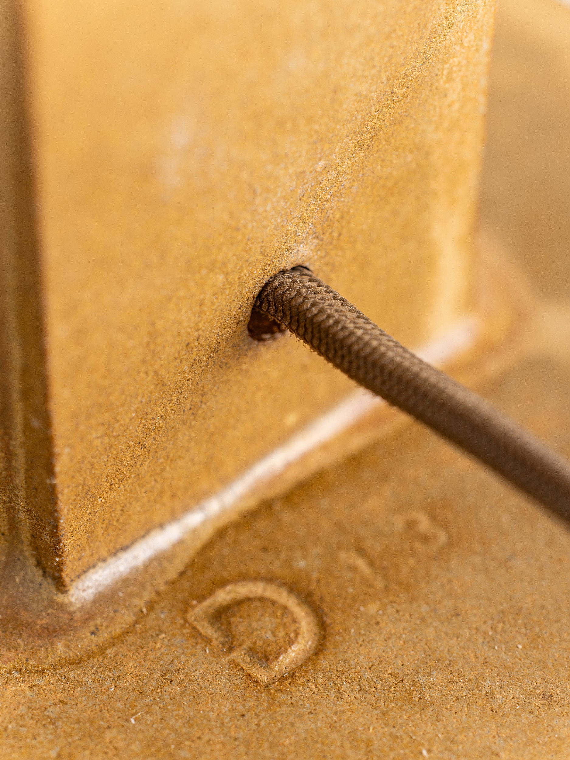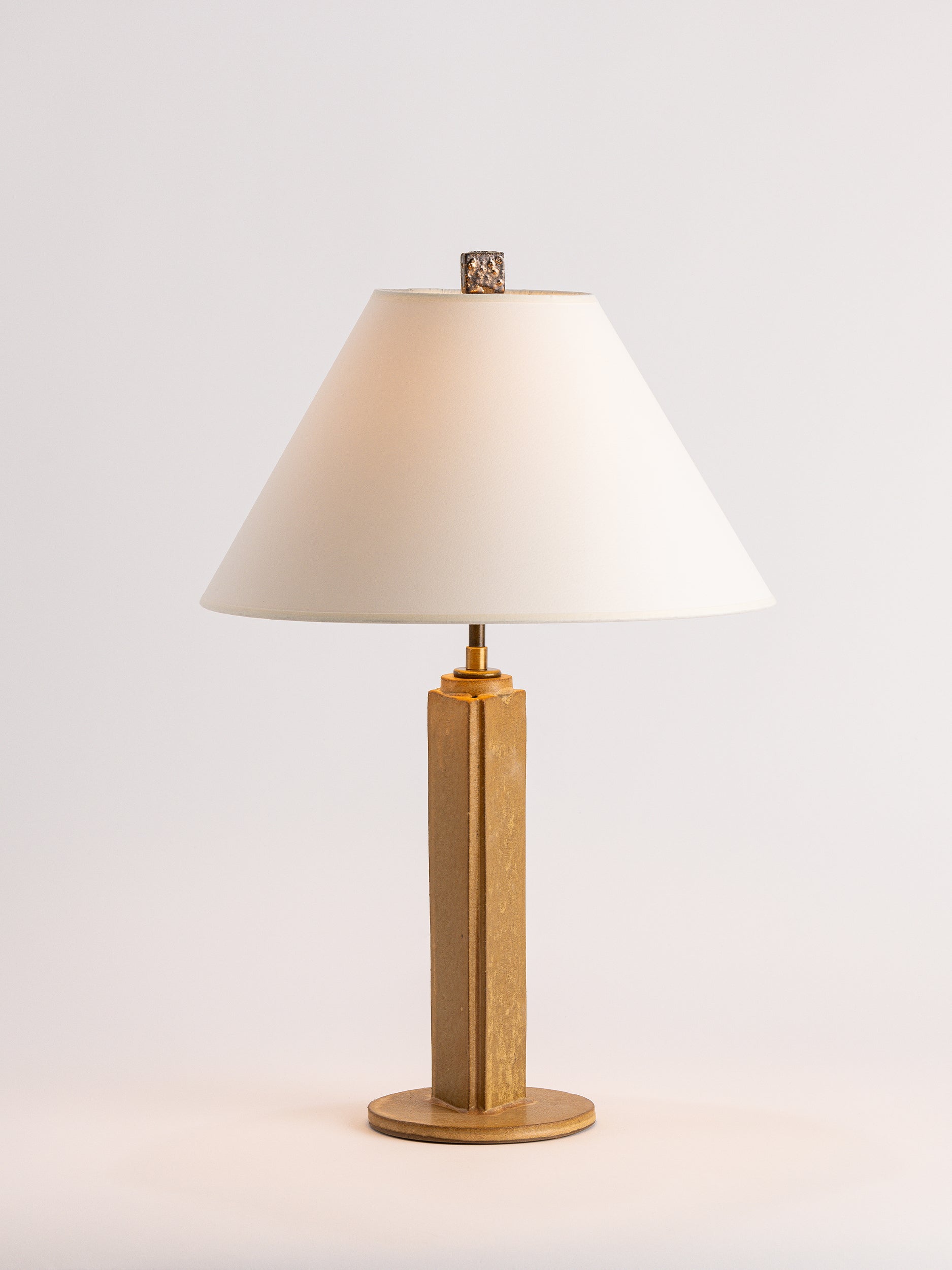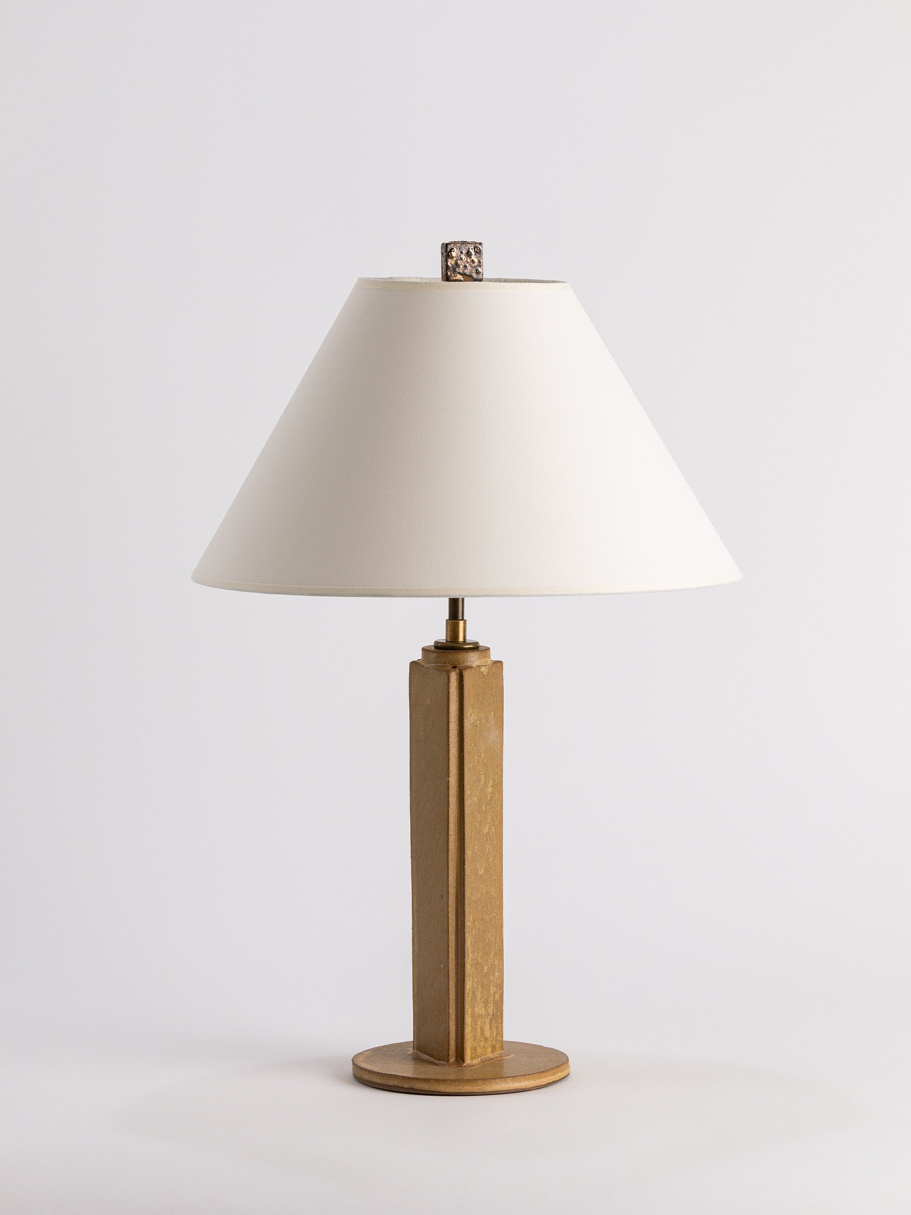 Pictured here in hide dipped glaze, antique brass fittings, beige cloth cord, full-range dimmer socket, a cracked gold finial, and an archival paper shade.
