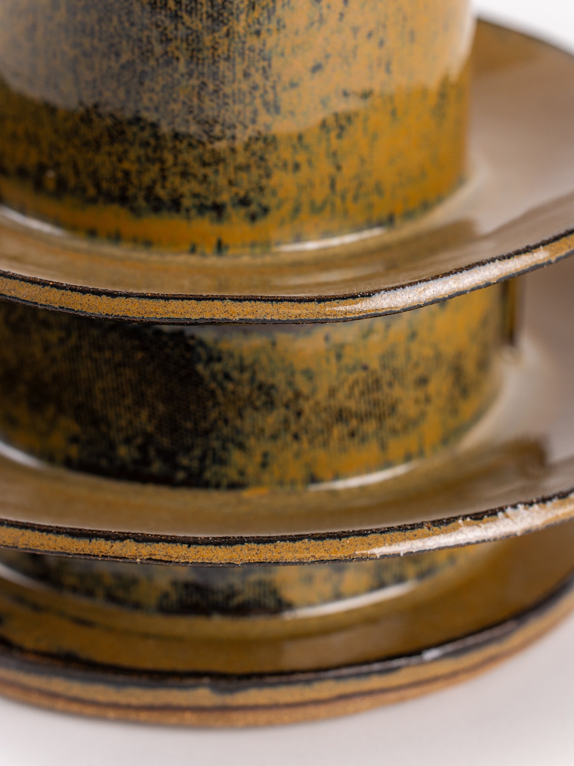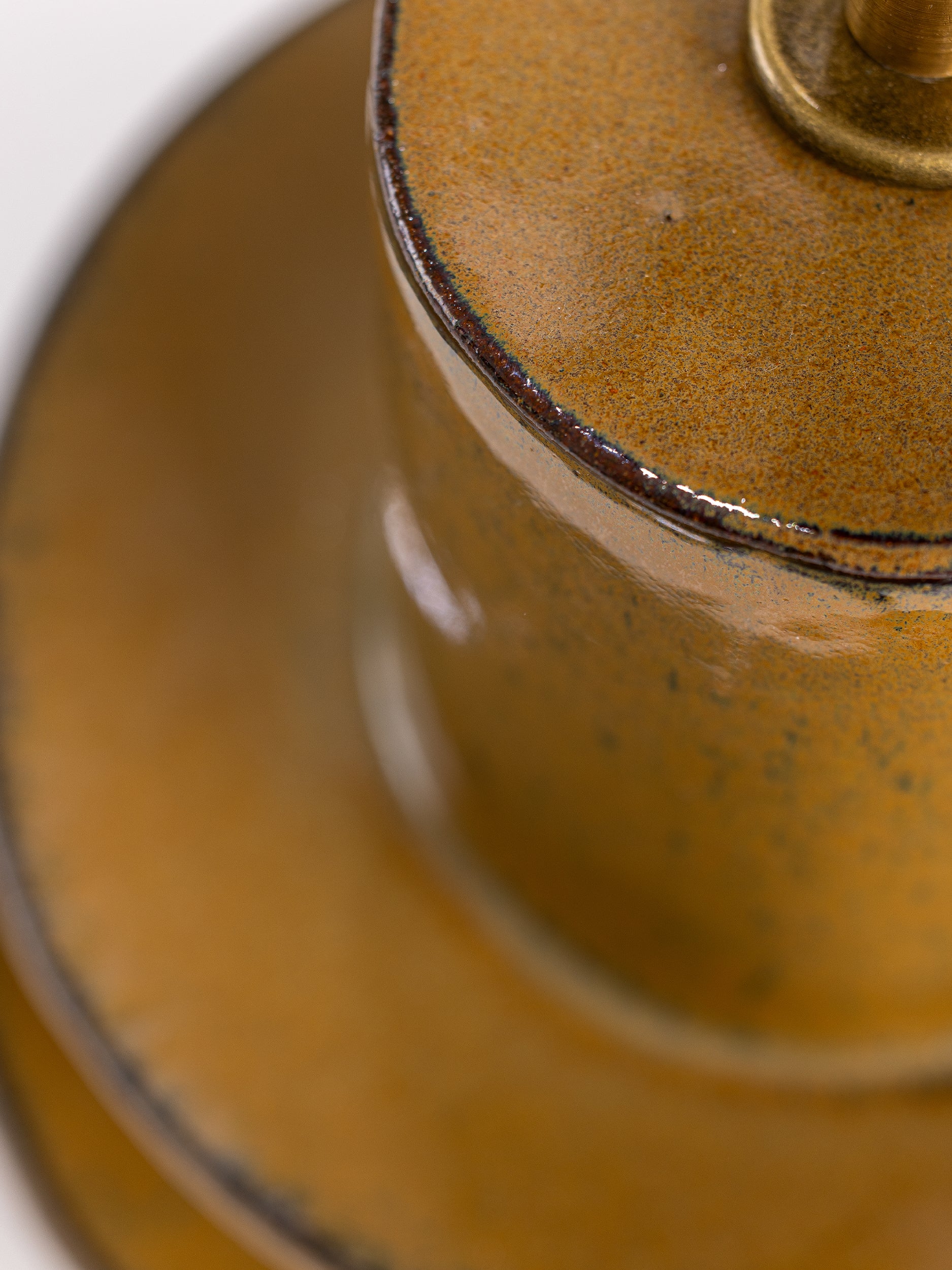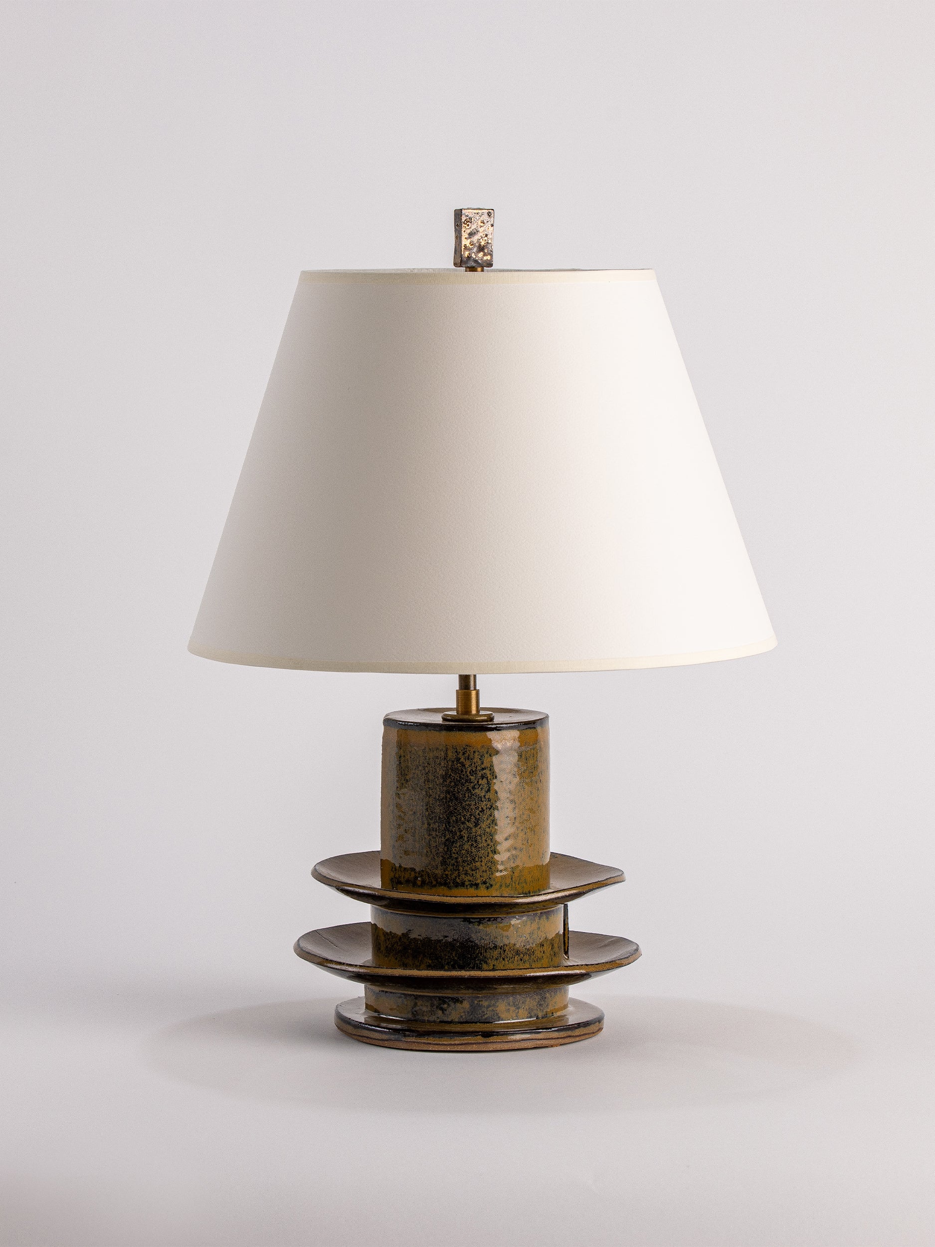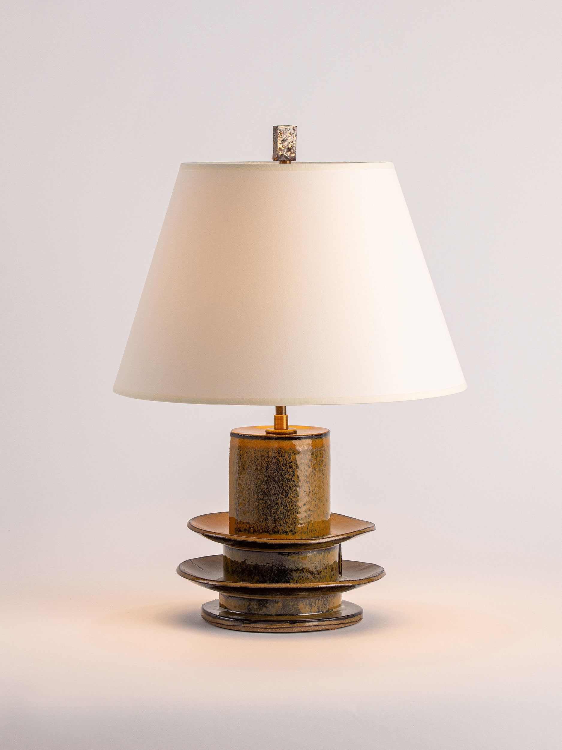 Pictured here in mushroom dipped glaze, antique brass fittings, beige cloth cord, full-range dimmer socket, a cracked gold finial, and an archival paper shade.