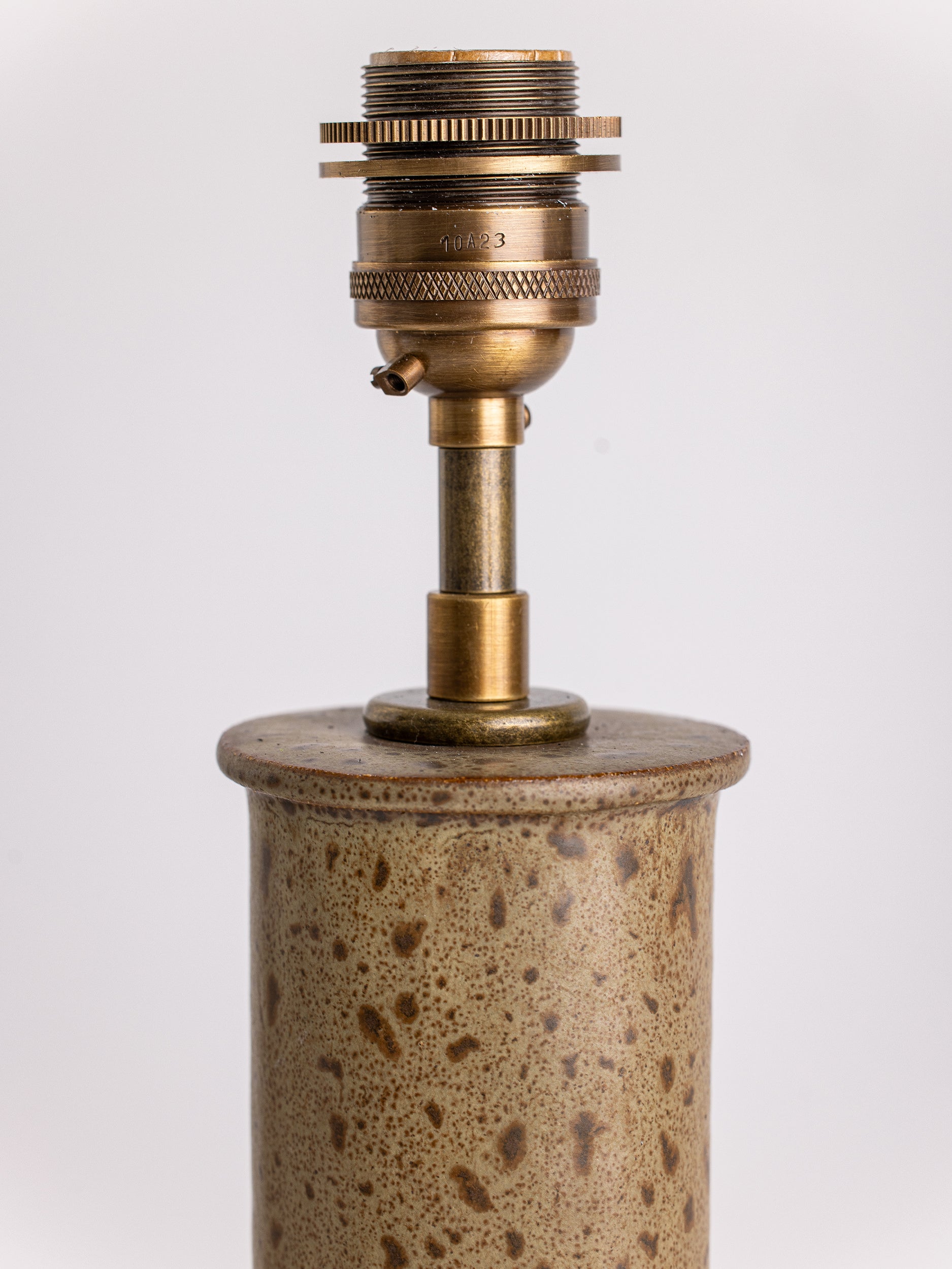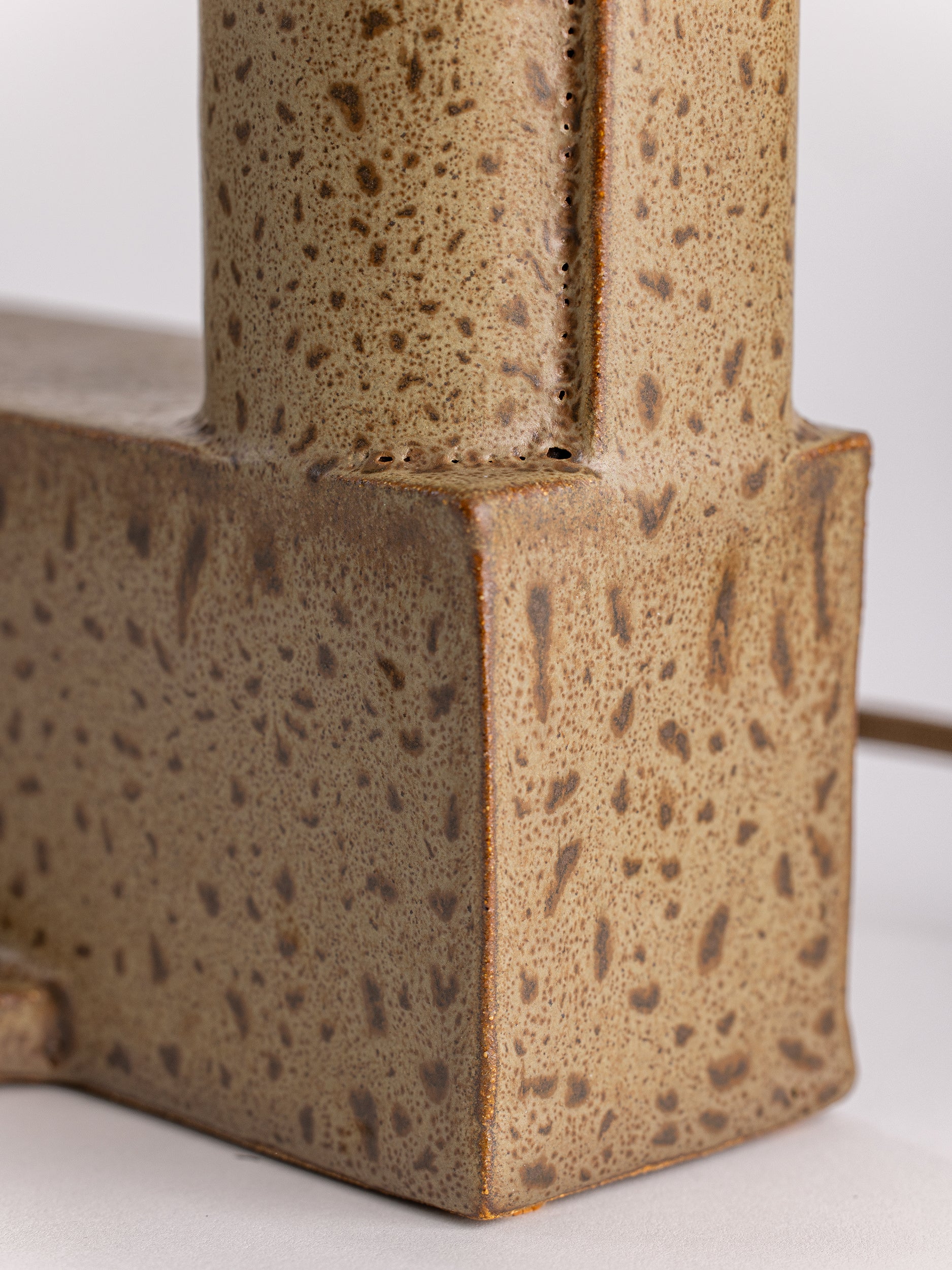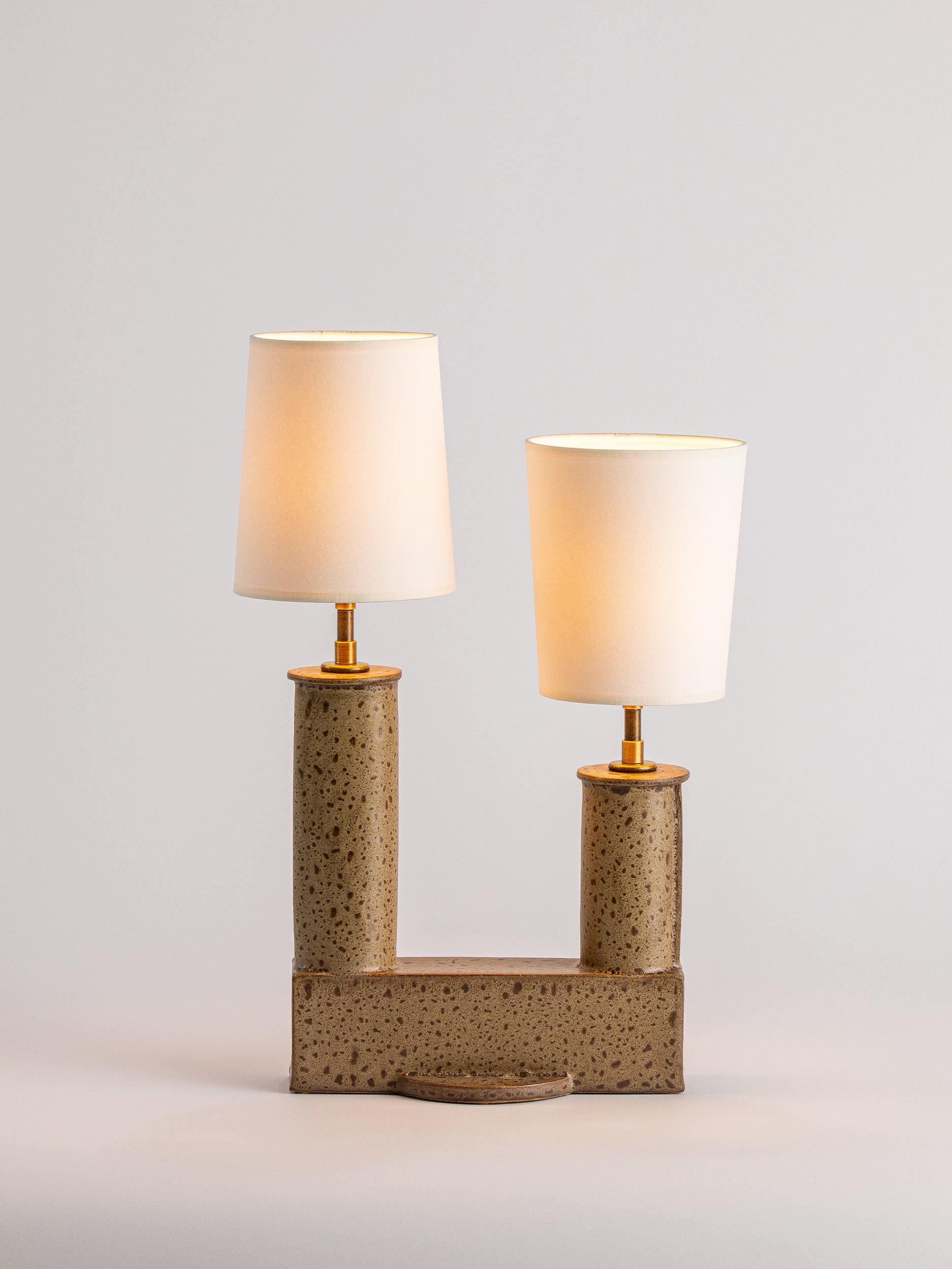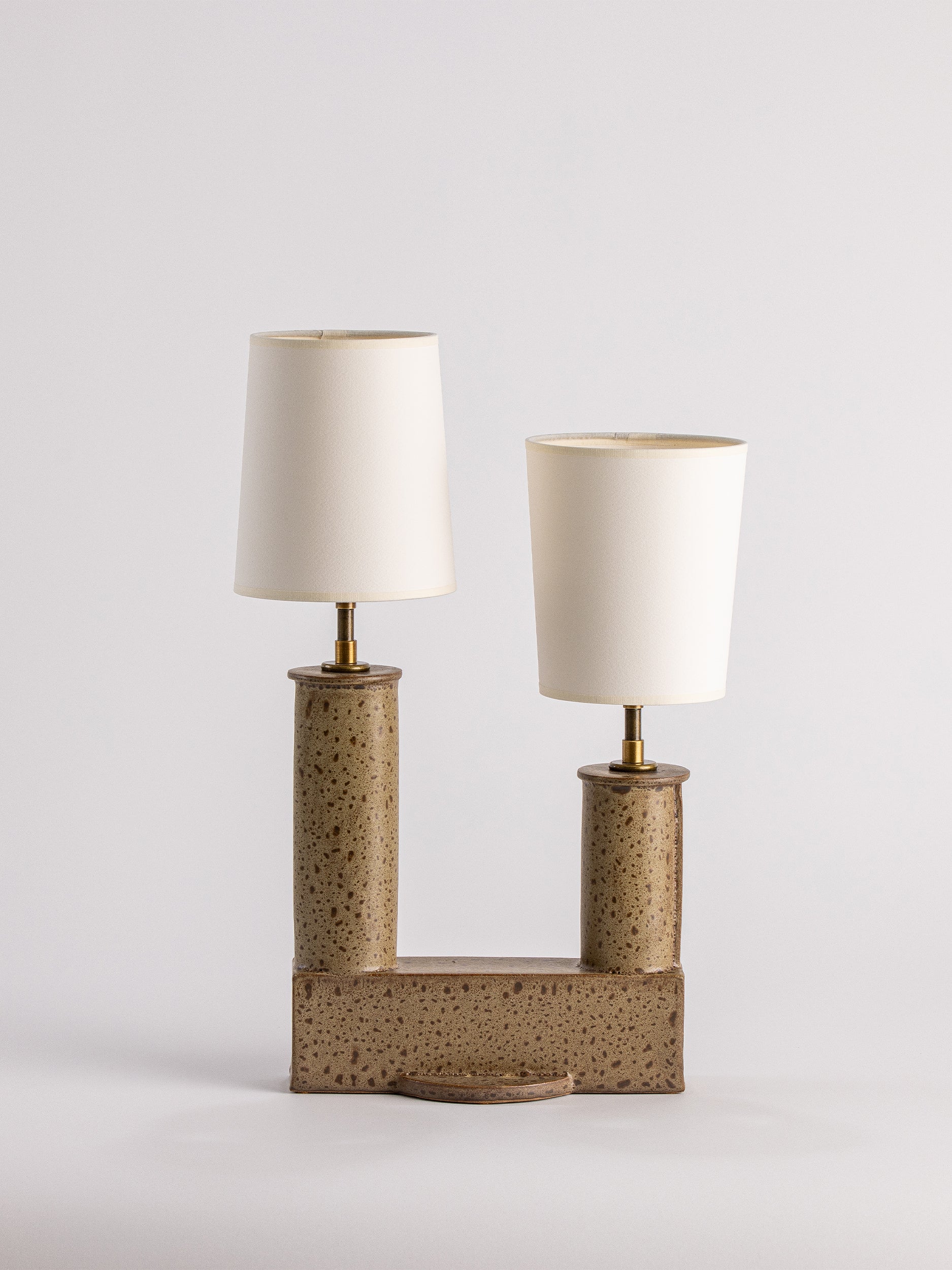 Pictured here in ochre and walnut dipped glaze, antique brass fittings, beige cloth cord, in-line switch, and archival paper shades.