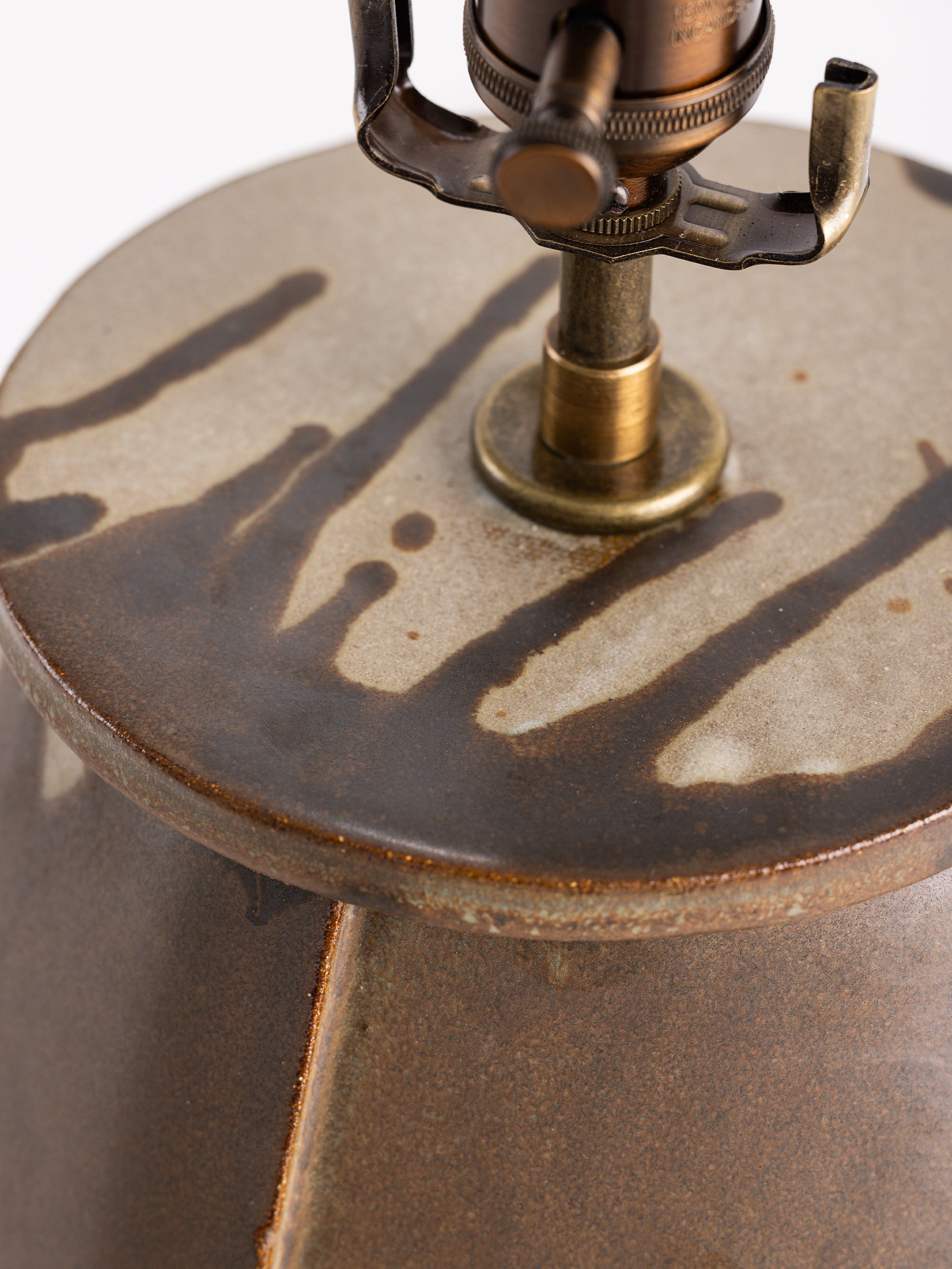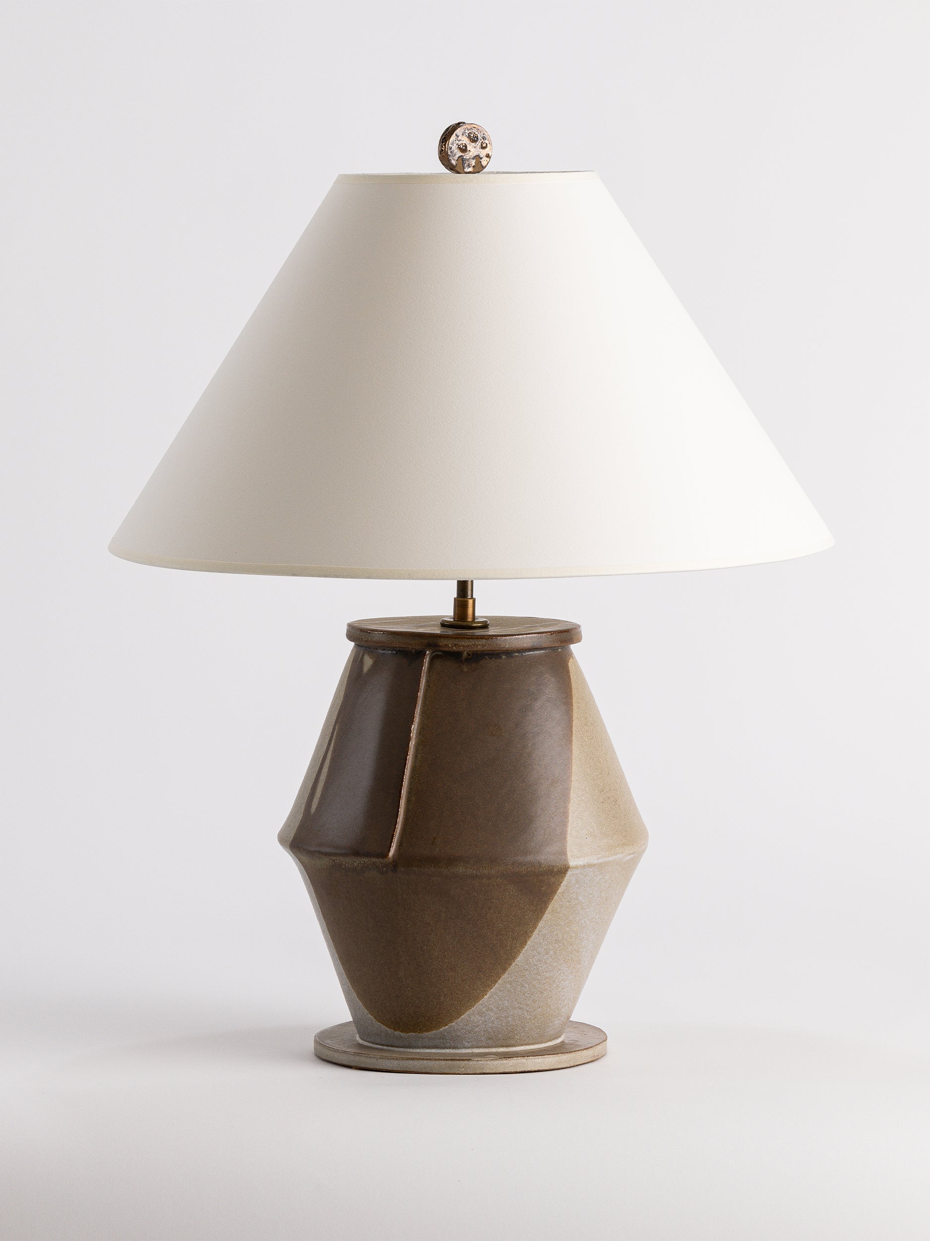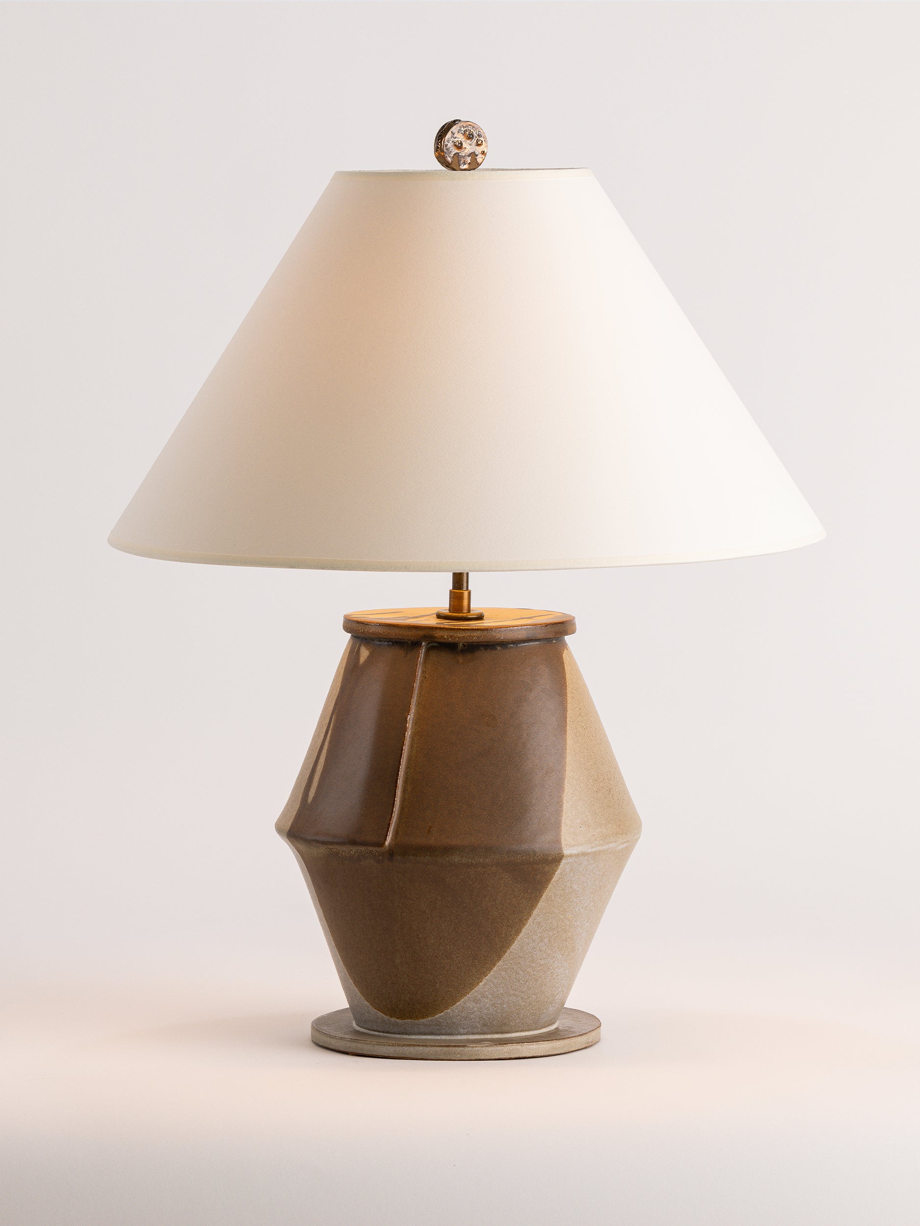 Pictured here in parchment and walnut poured glaze, antique brass fittings, beige cloth cord, full-range dimmer socket, a cracked gold finial, and an archival paper shade.