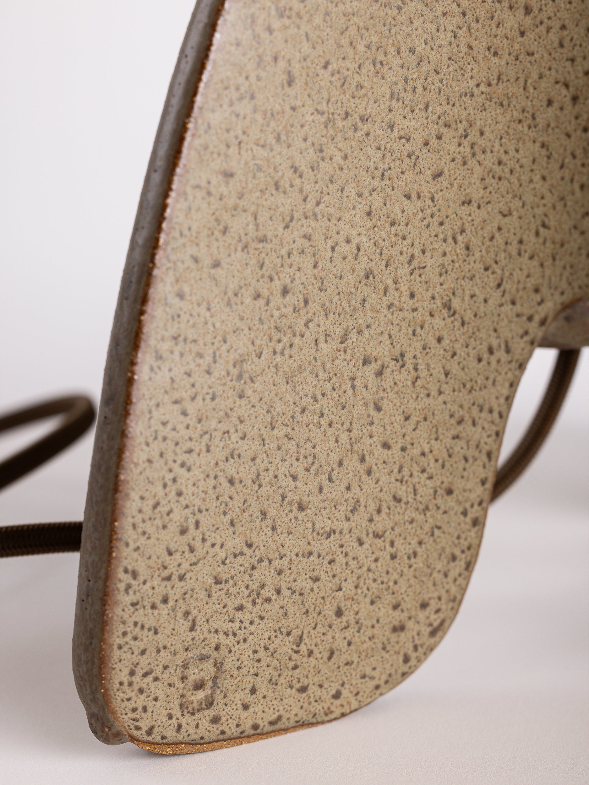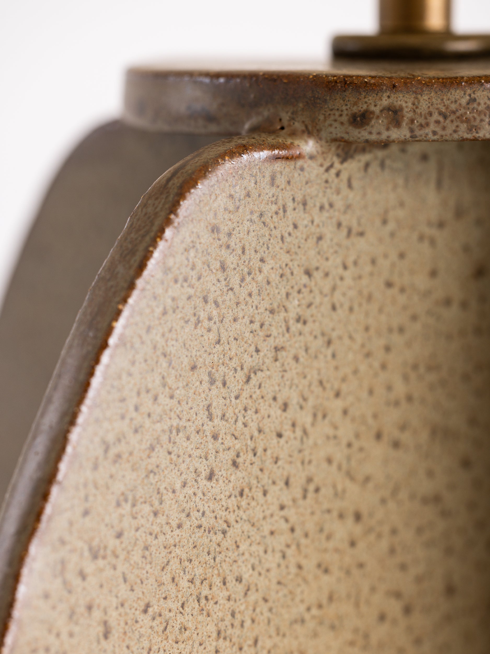 Pictured here in ochre and walnut dipped glaze, antique brass fittings, beige cloth cord, full-range dimmer socket, a cracked gold finial, and an archival paper shade.