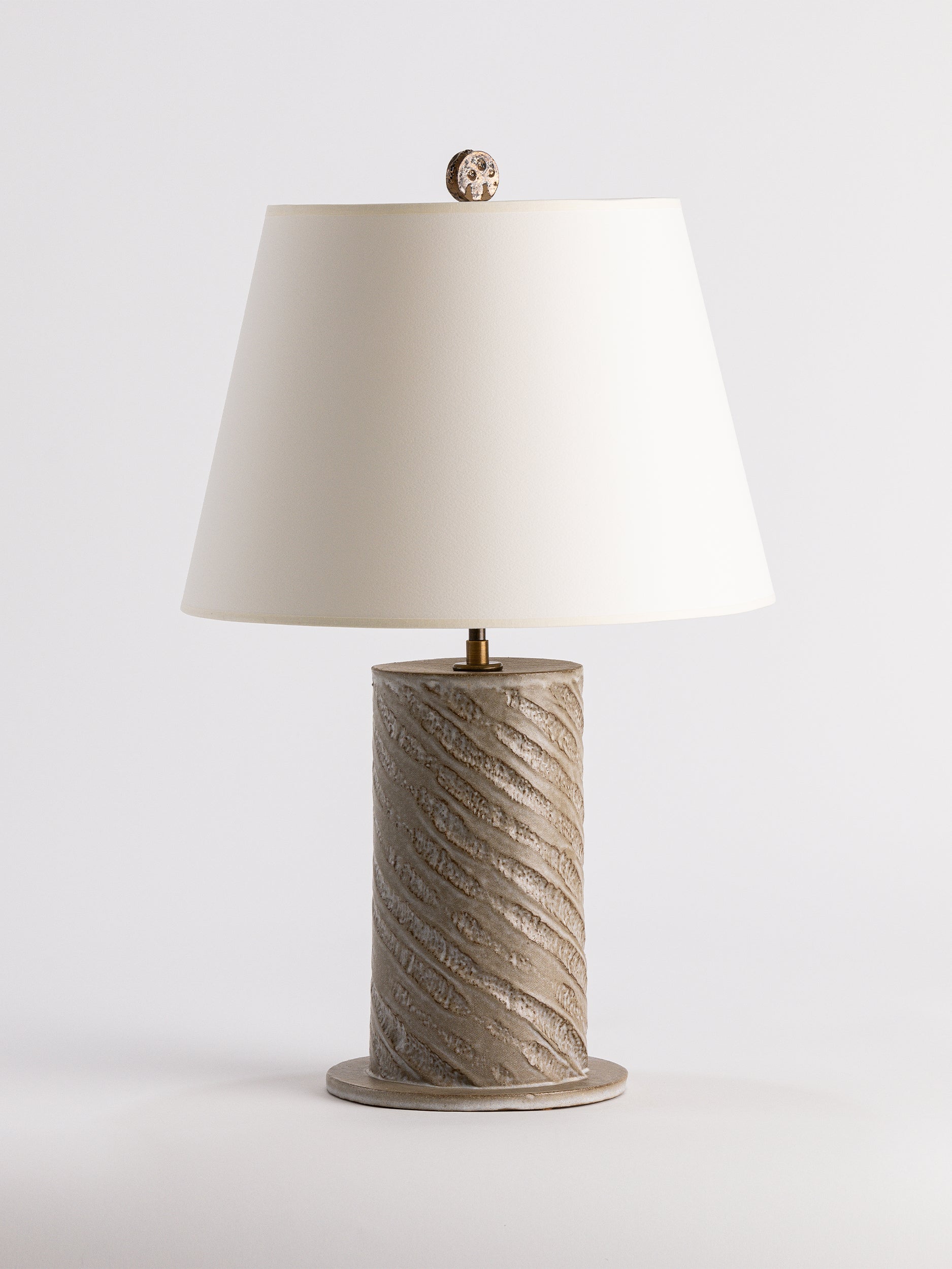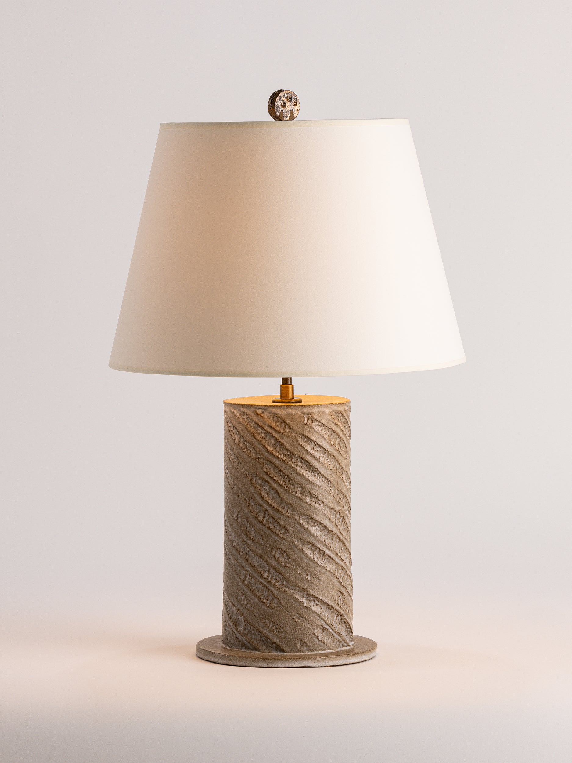 Pictured here in parchment dipped glaze, antique brass fittings, beige cloth cord, full-range dimmer socket, a cracked gold finial, and an archival paper shade.