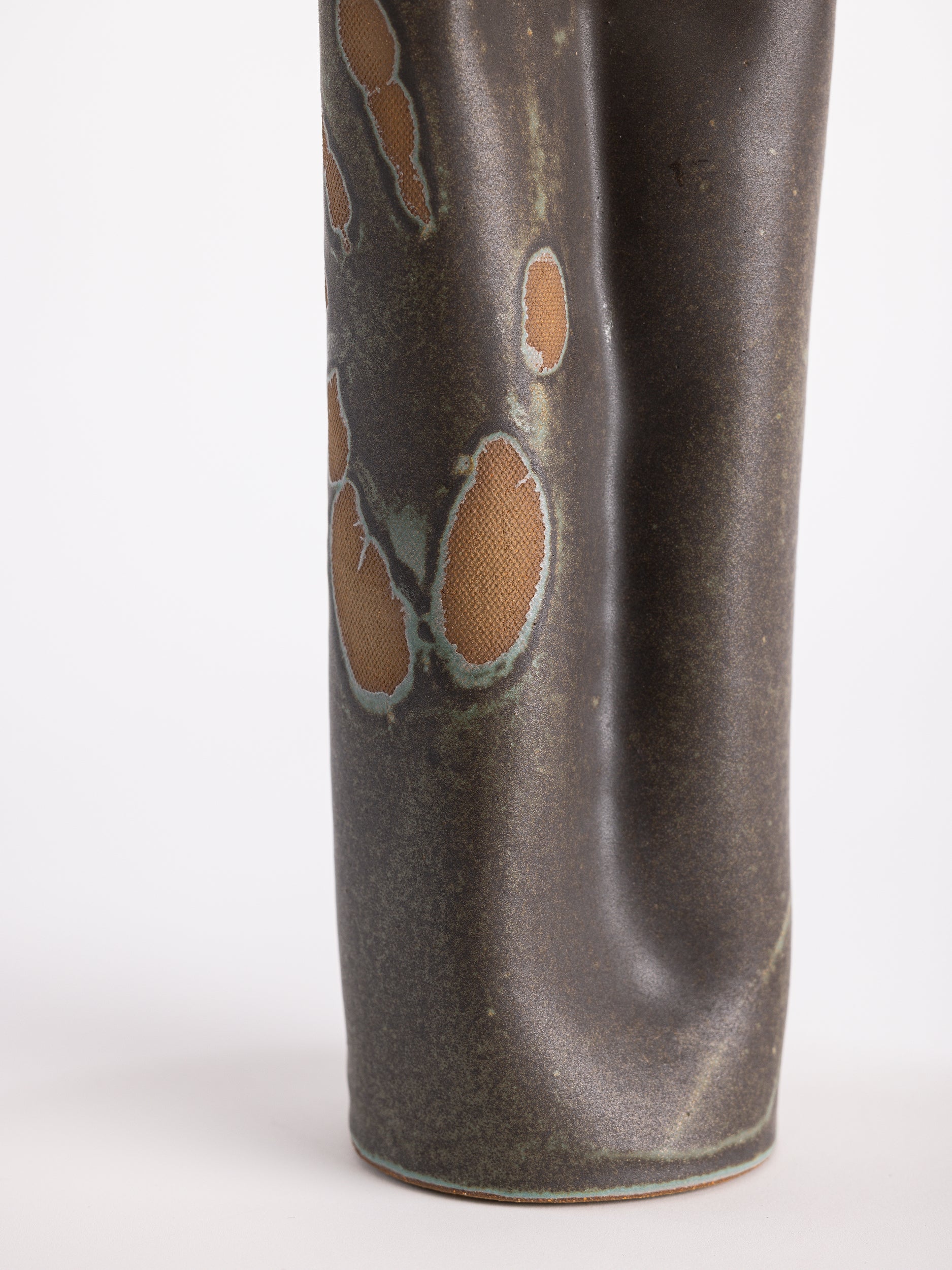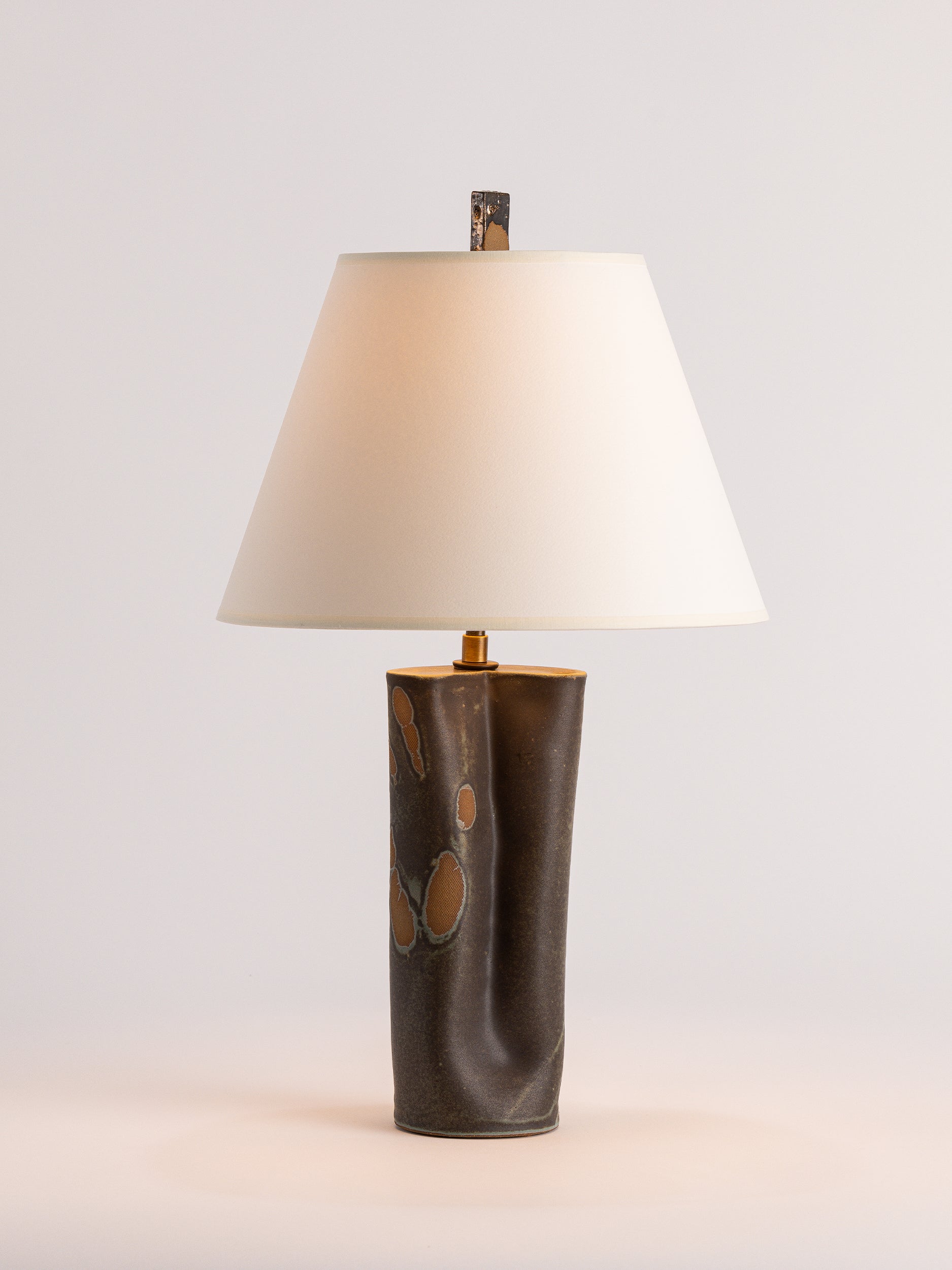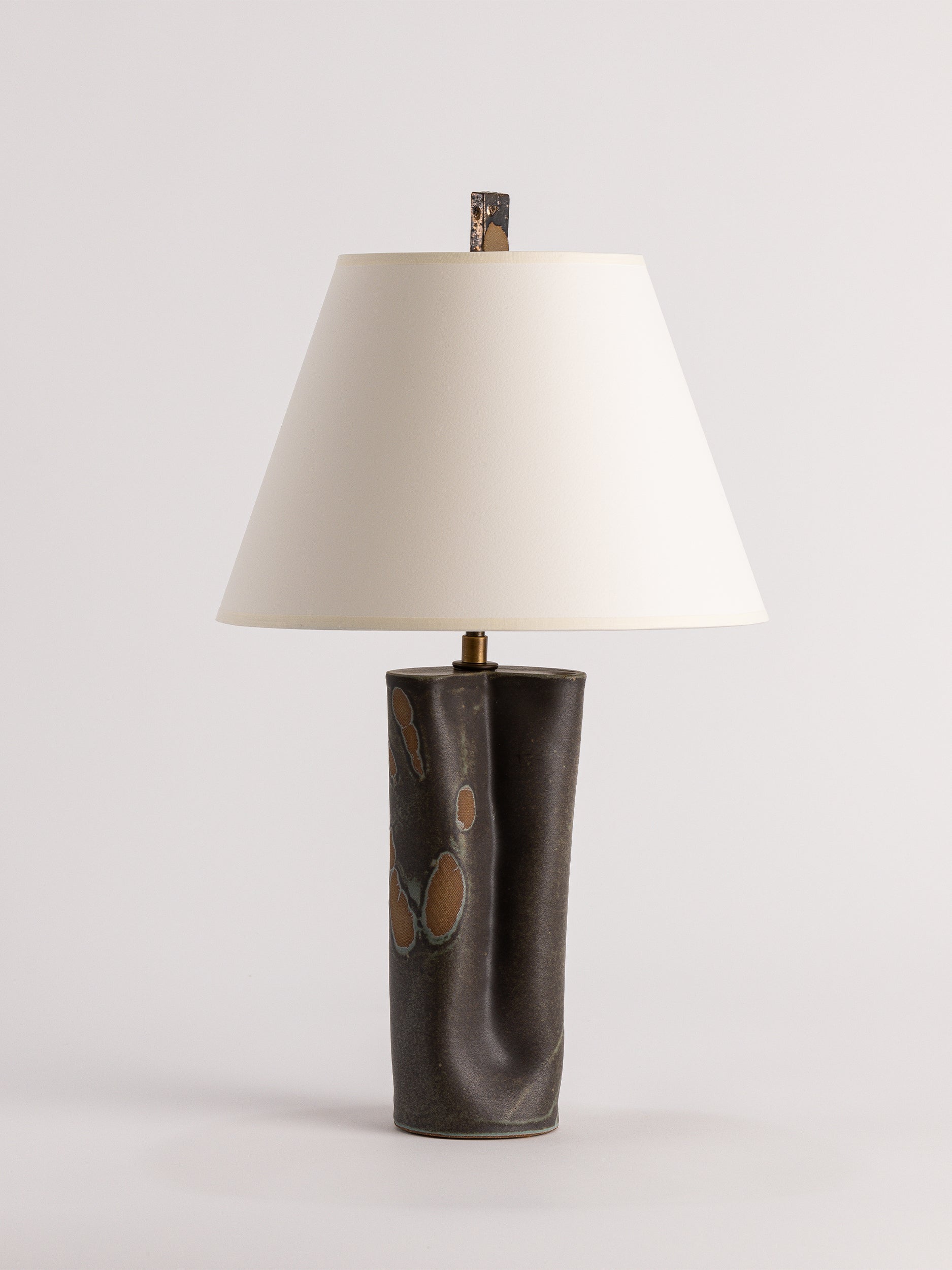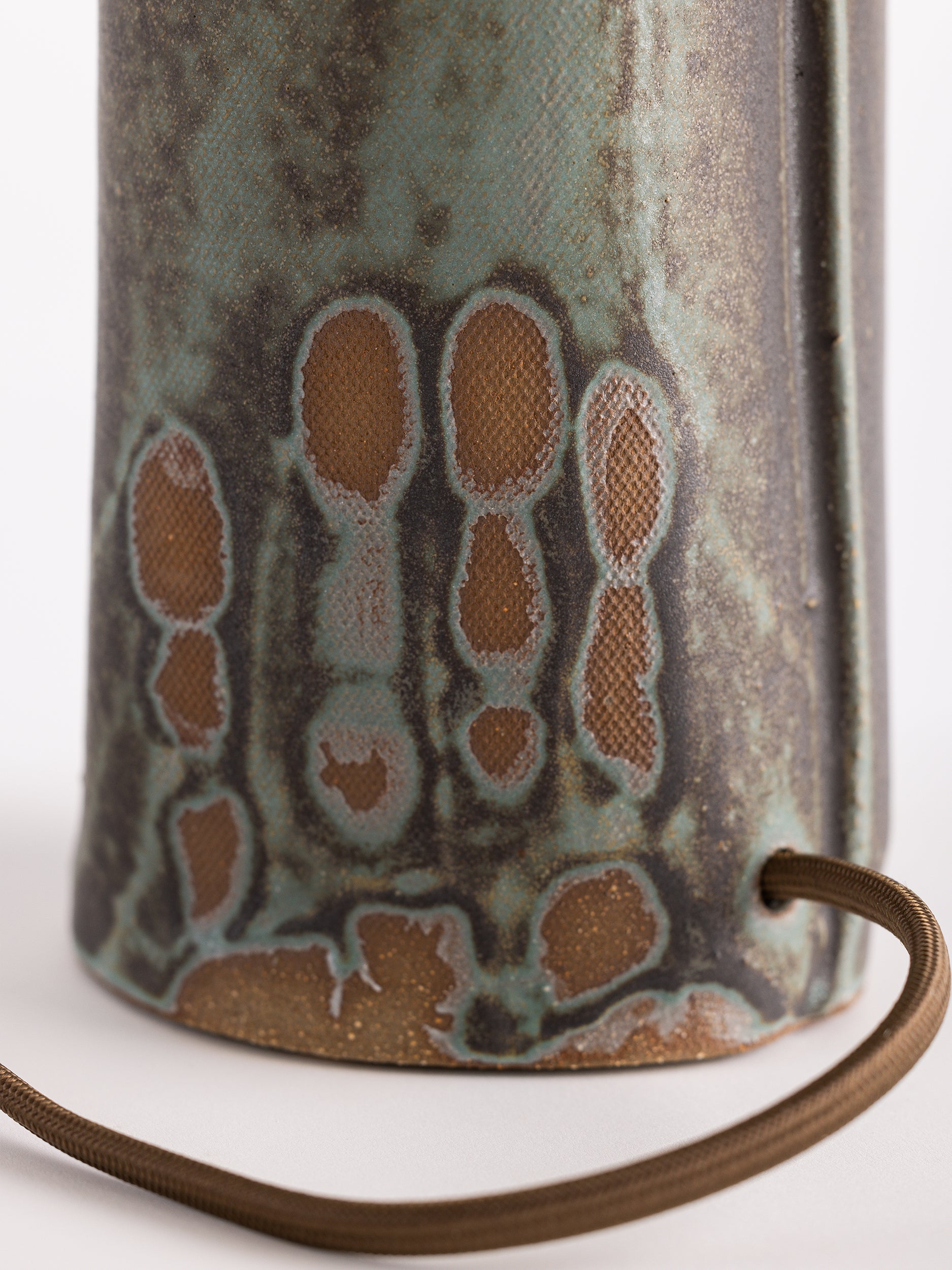 Pictured here in verdigris dipped glaze with handprint, antique brass fittings, beige cloth cord, full-range dimmer socket, a cracked gold finial, and an archival paper shade.