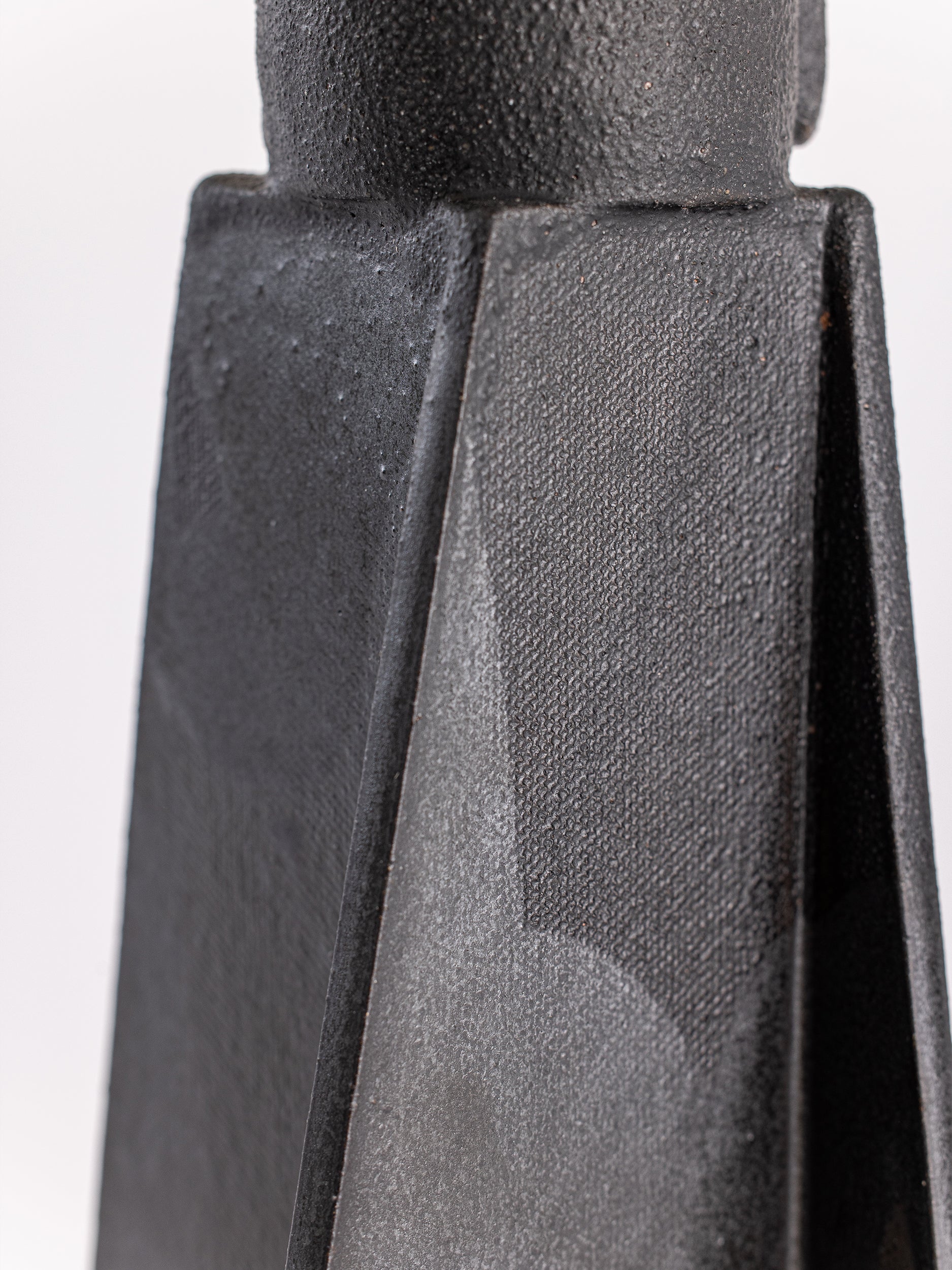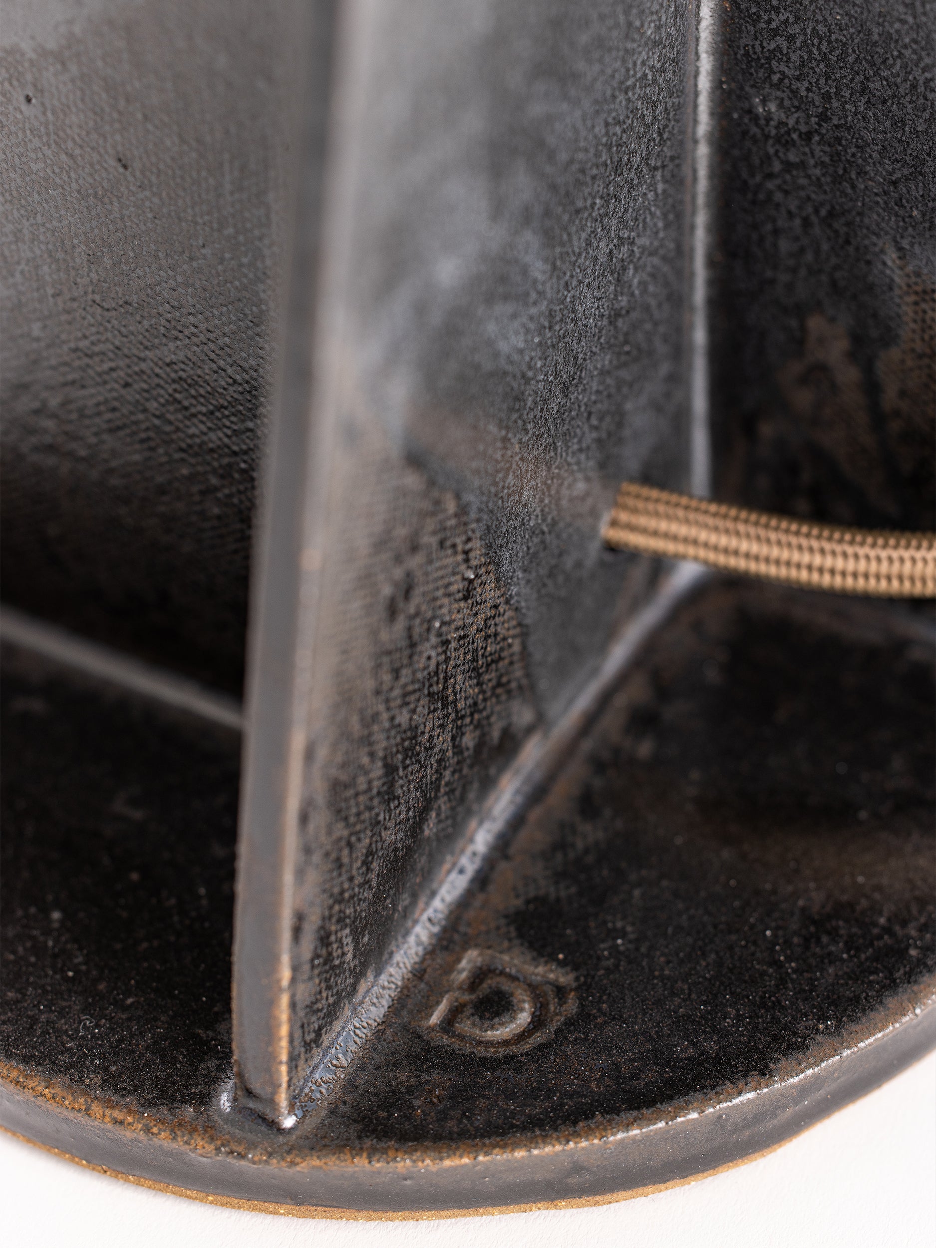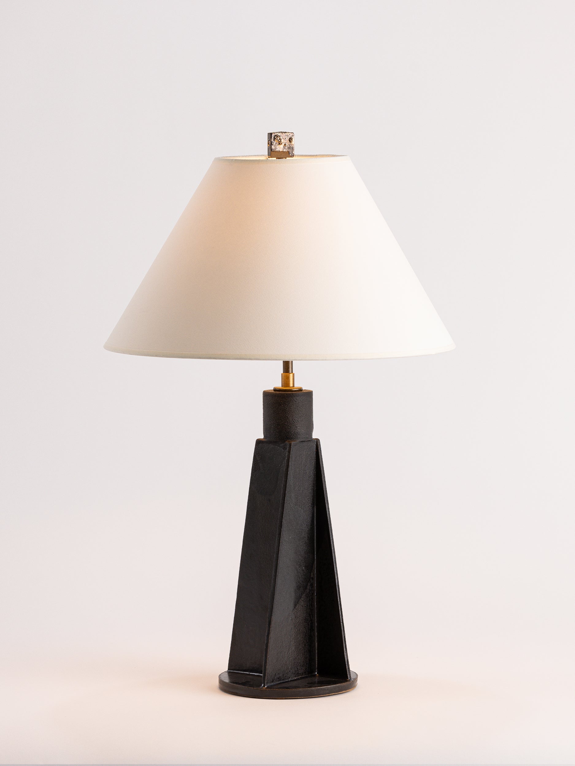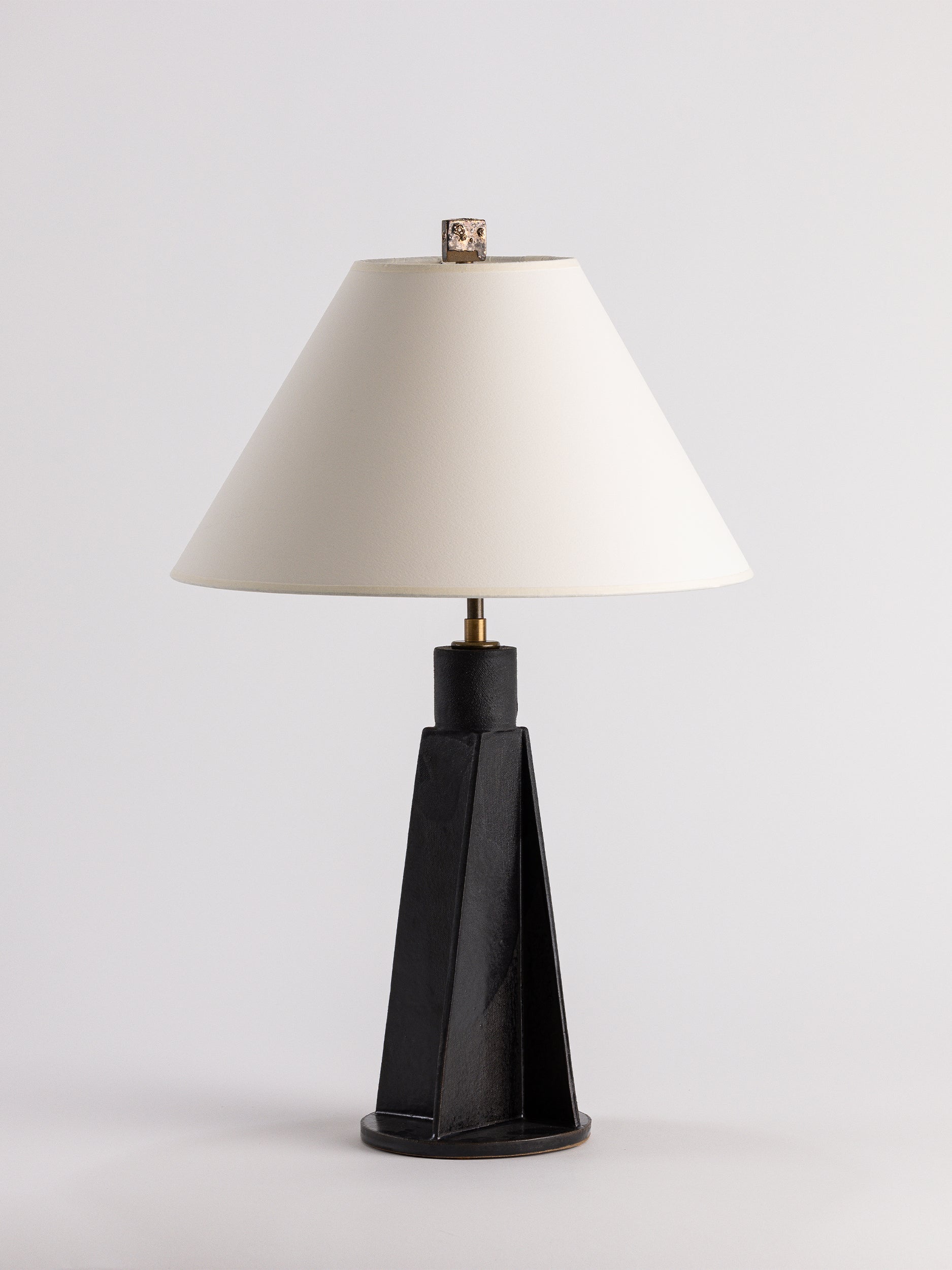 Pictured here in matte black and lead poured glaze, antique brass fittings, black cloth cord, full-range dimmer socket, a cracked gold finial, and an archival paper shade.
