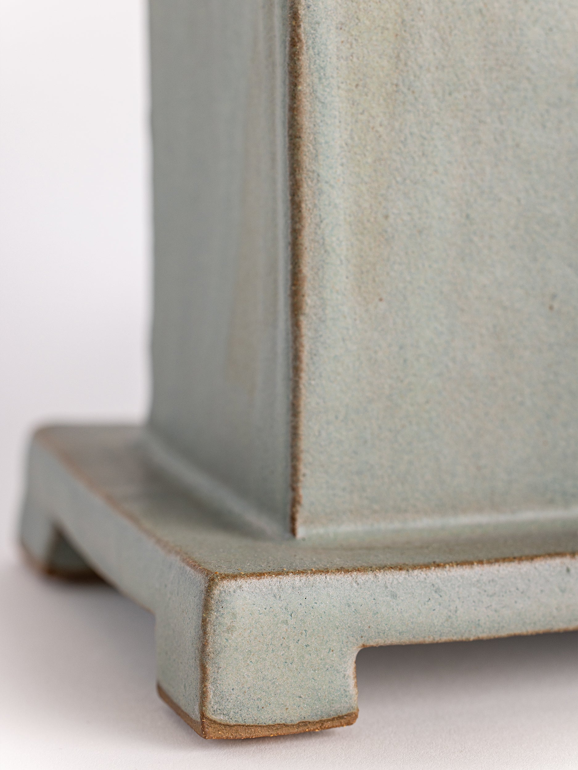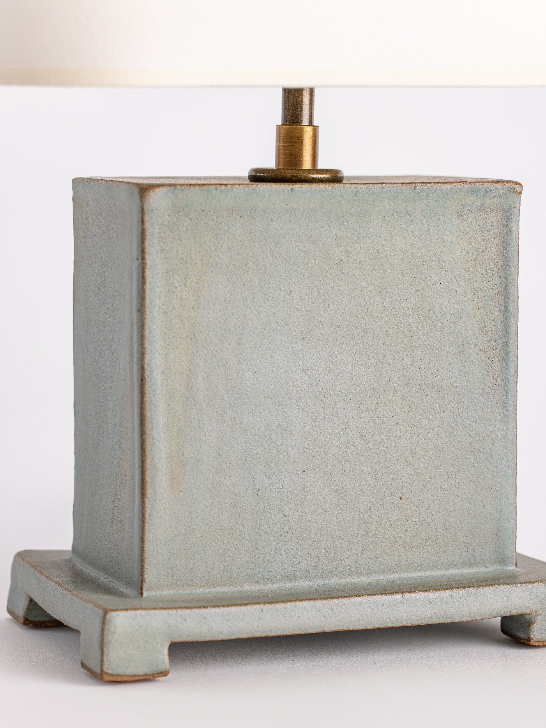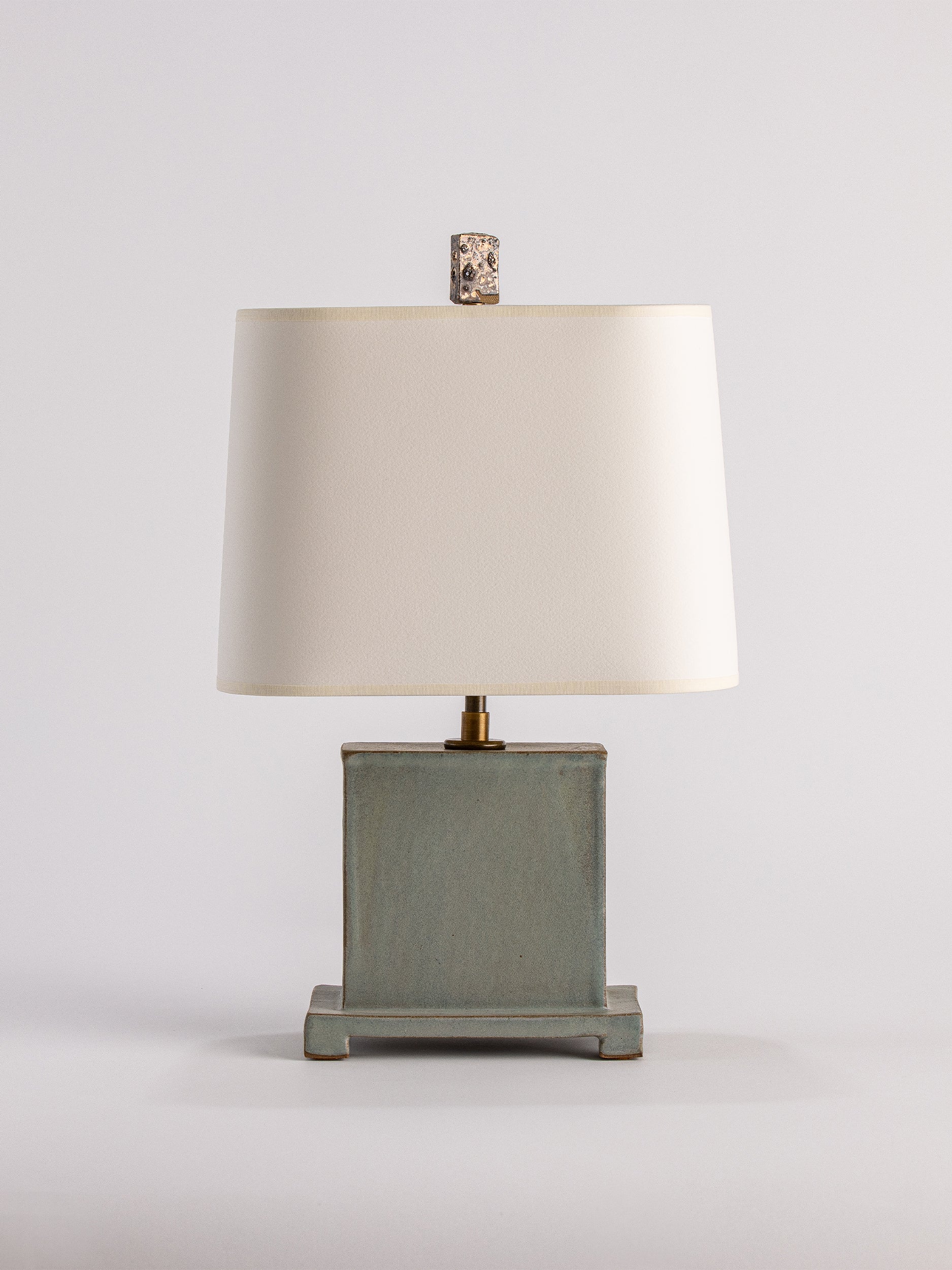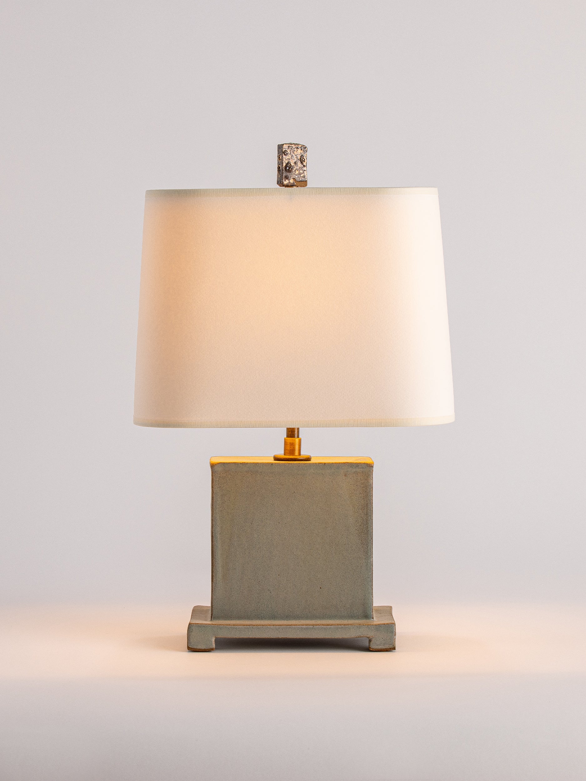 Pictured here in sea dipped glaze, antique brass fittings, beige cloth cord, full-range dimmer socket, a cracked gold finial, and an archival paper shade.