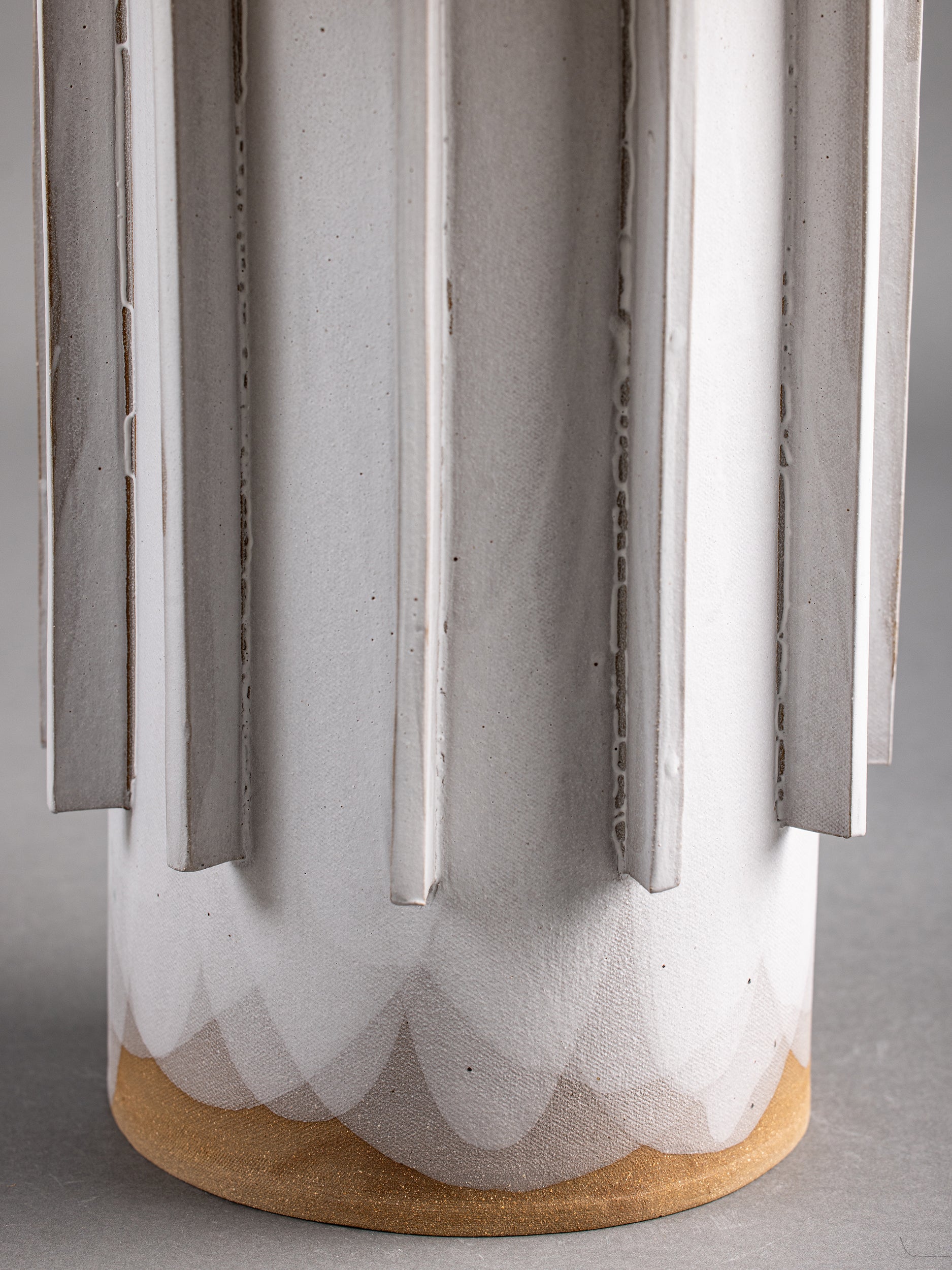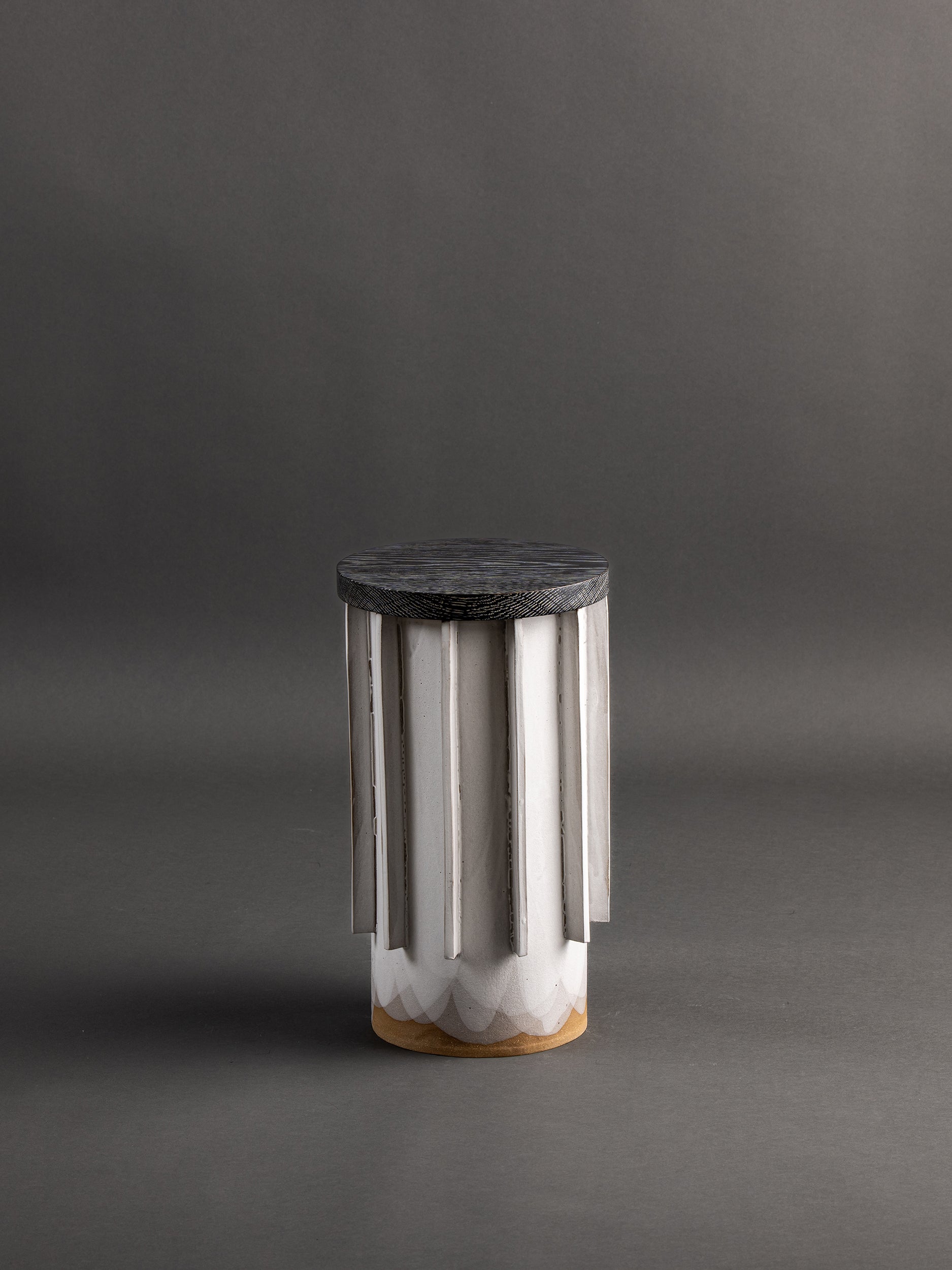 Our stoneware and oak Gear Cocktail Table is handcrafted using slab-construction and cerusing techniques.