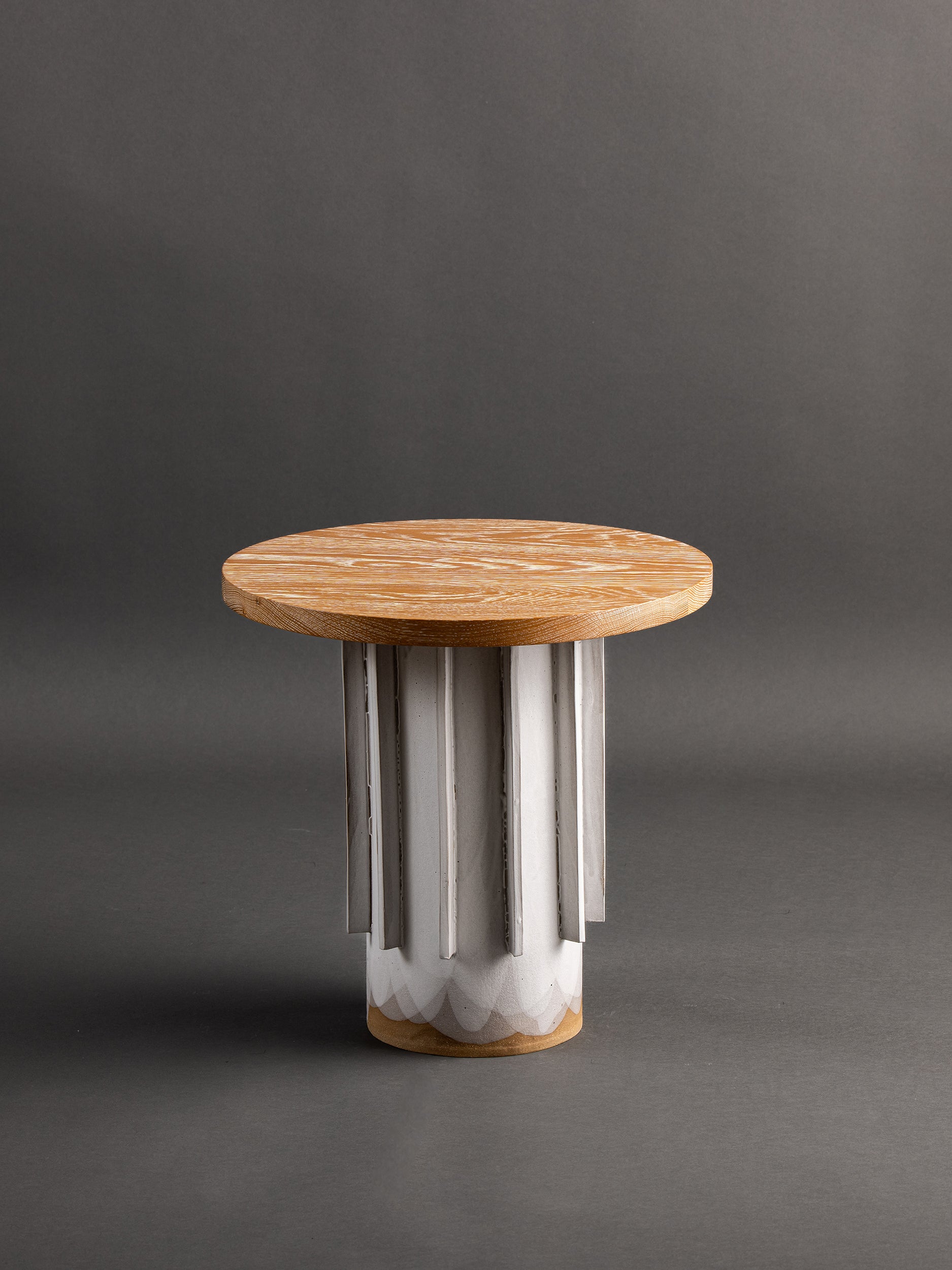 Our stoneware and oak Gear Side Table is handcrafted using slab-construction and cerusing techniques.