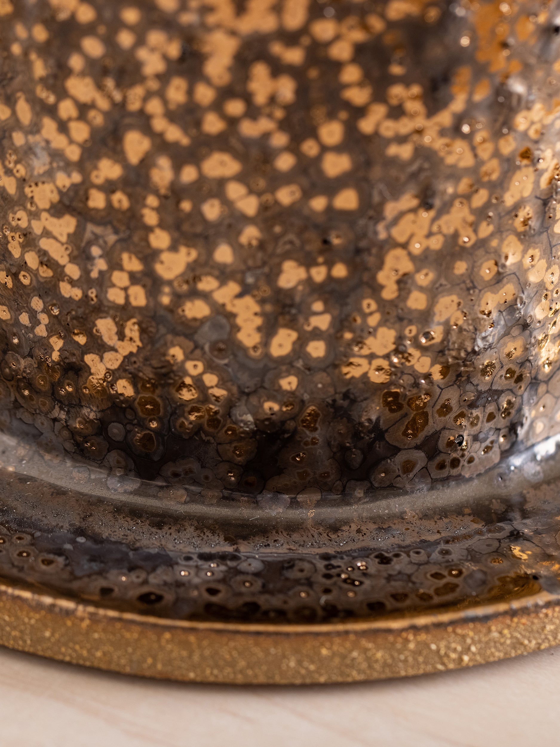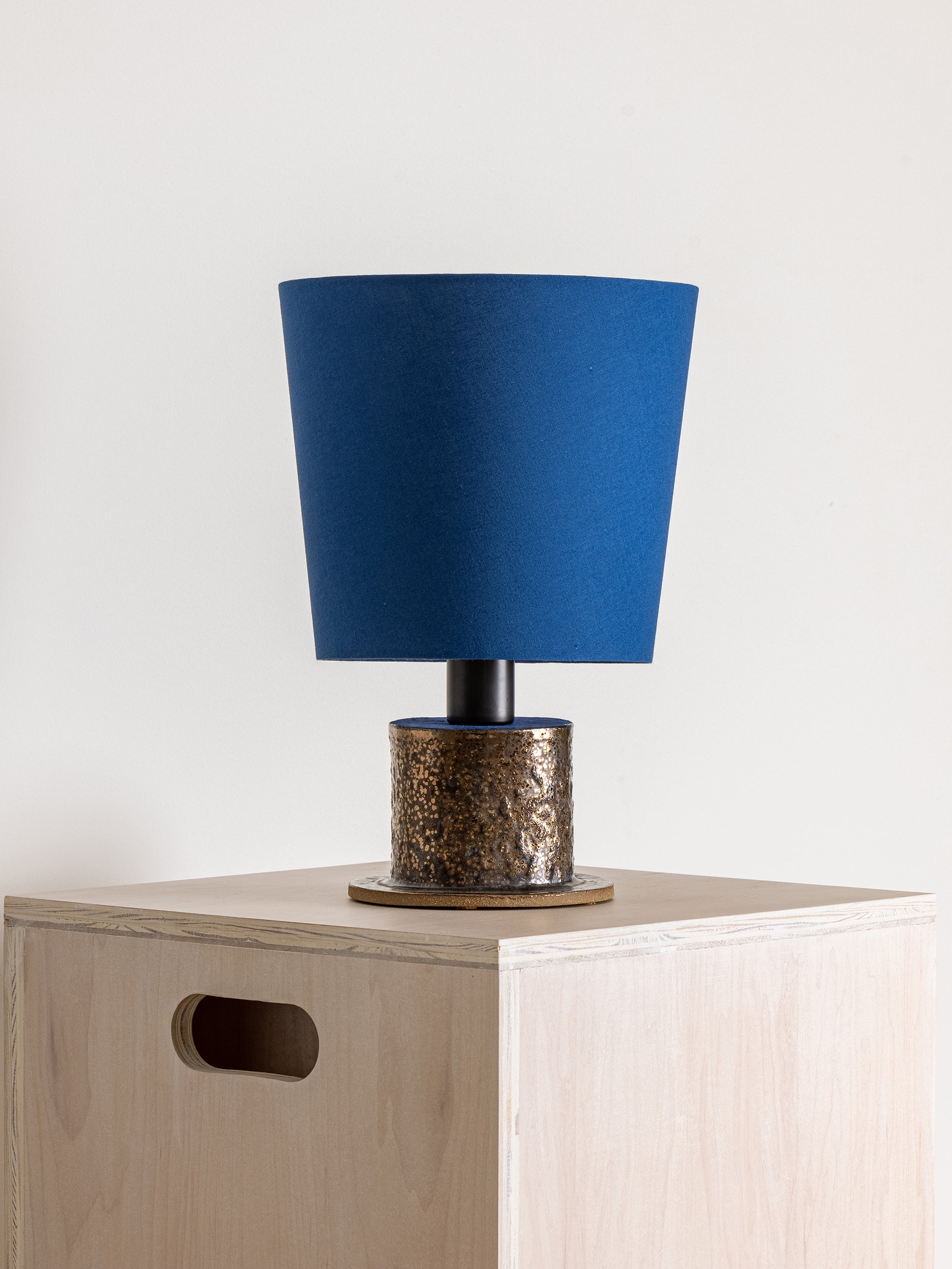 Pictured here in hand-painted cracked gold exterior glaze and ultramarine underglaze, antique brass fittings, black cloth cord, in-line switch, and an ultramarine handkerchief linen shade.