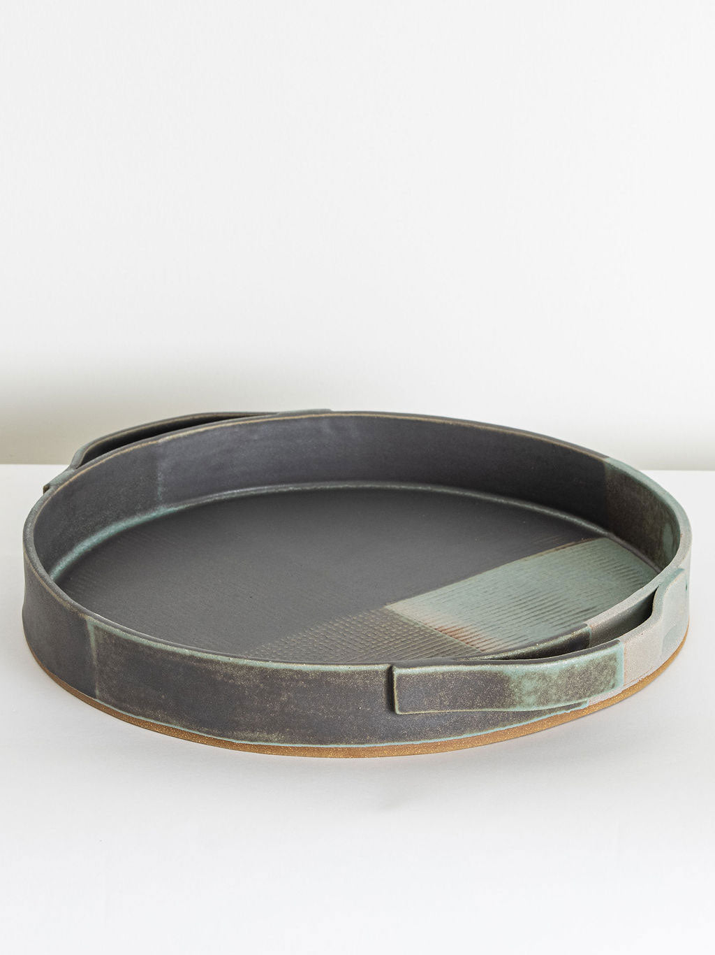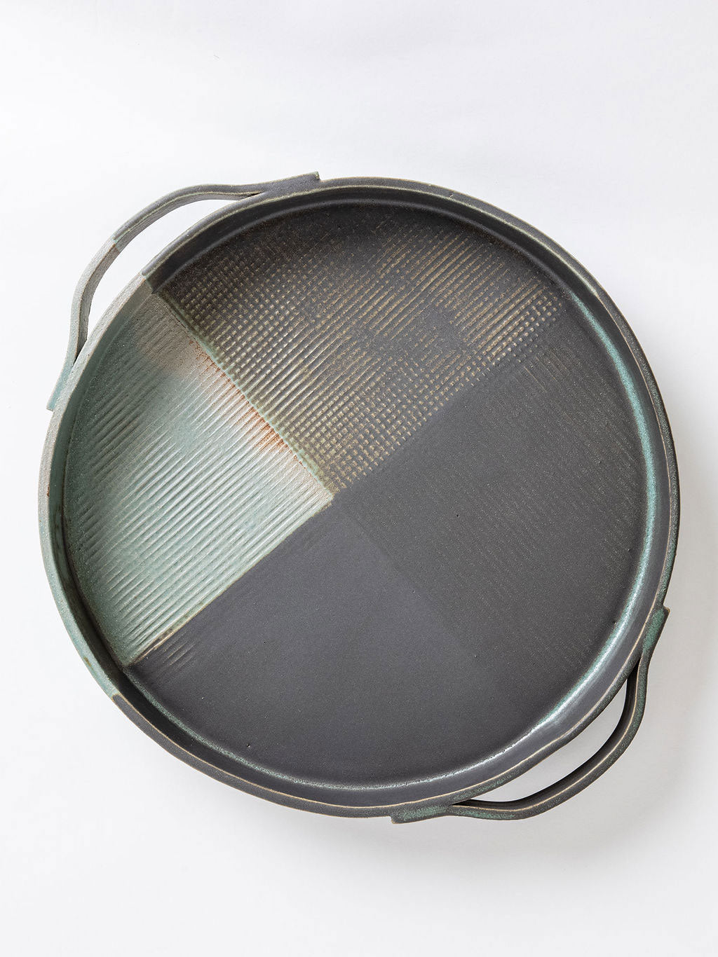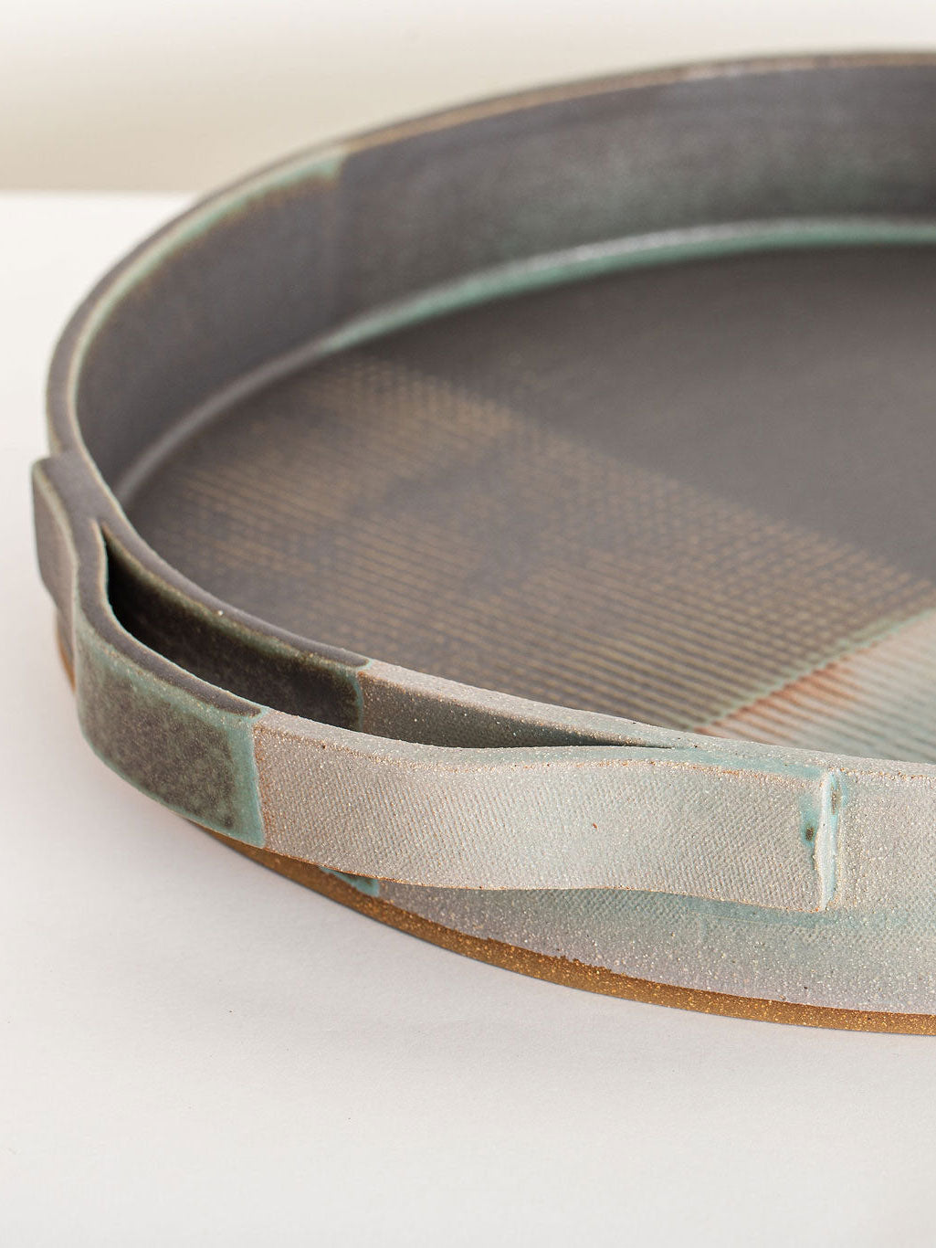 Our stoneware Handle Slab Tray is handcrafted using slab-construction techniques. The tray’s pattern is created by rolling the surface with textured rolling pins and rods.