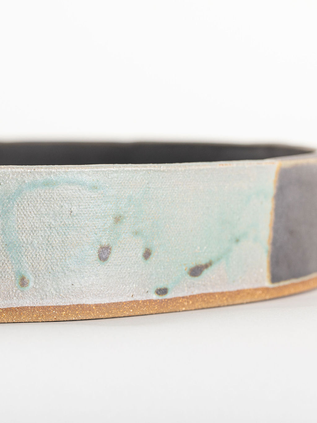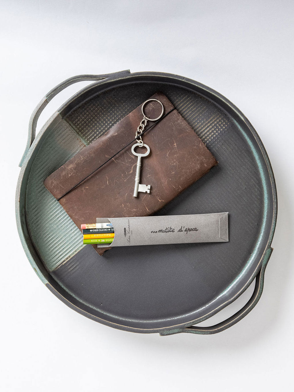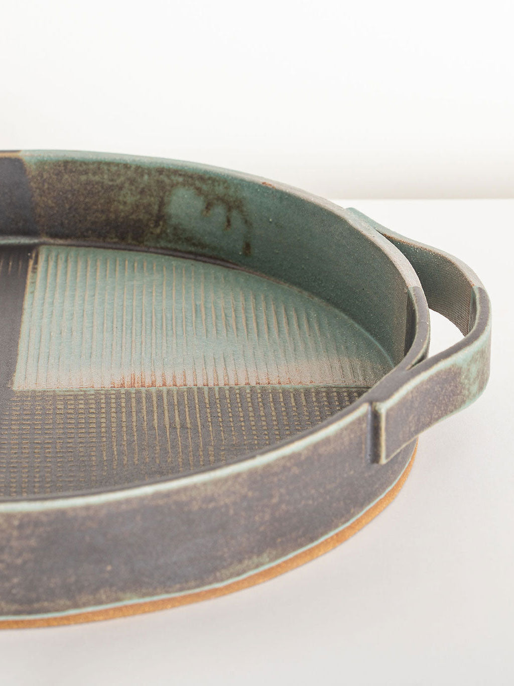 Our stoneware Handle Slab Tray is handcrafted using slab-construction techniques. The tray’s pattern is created by rolling the surface with textured rolling pins and rods.