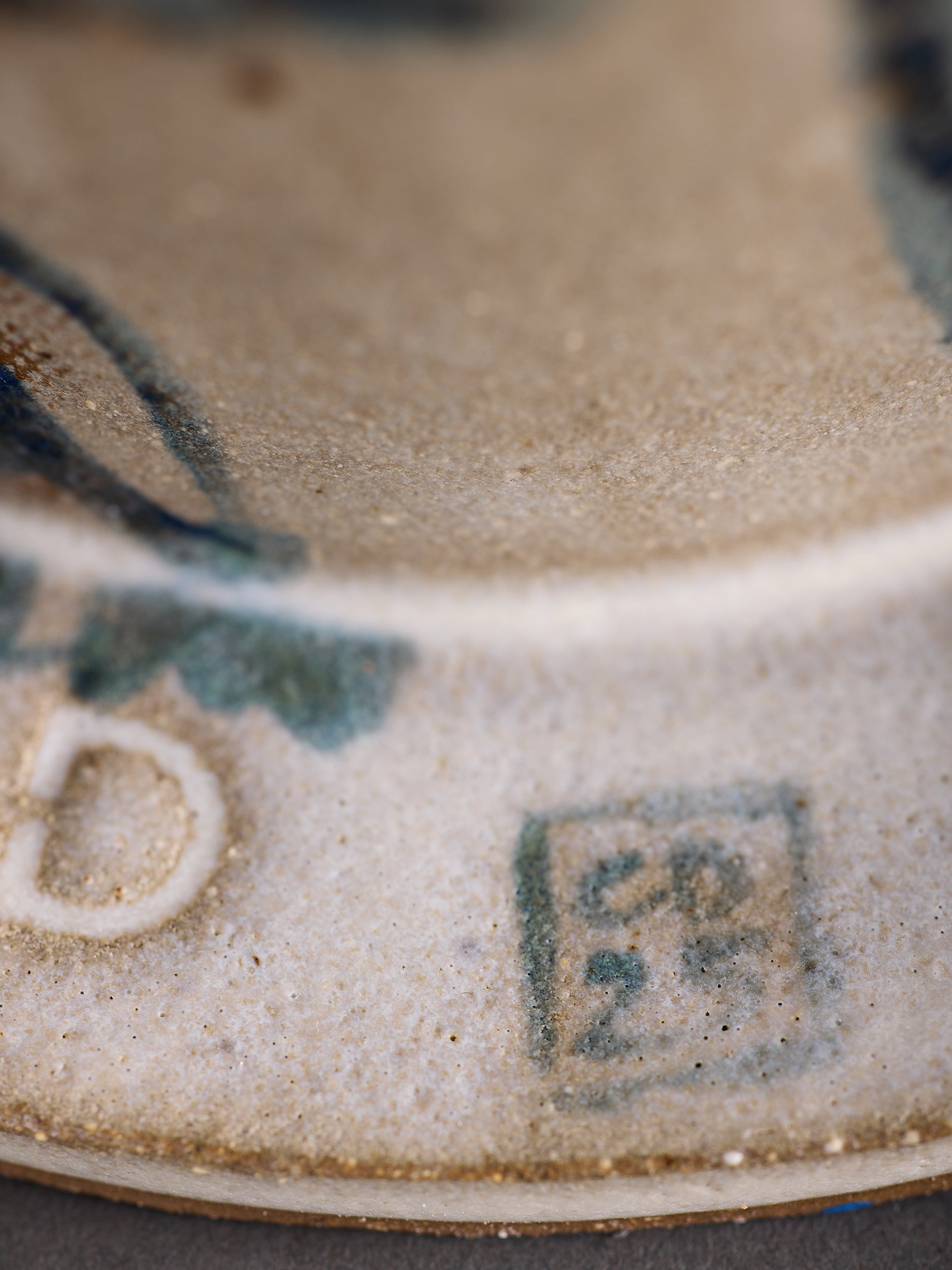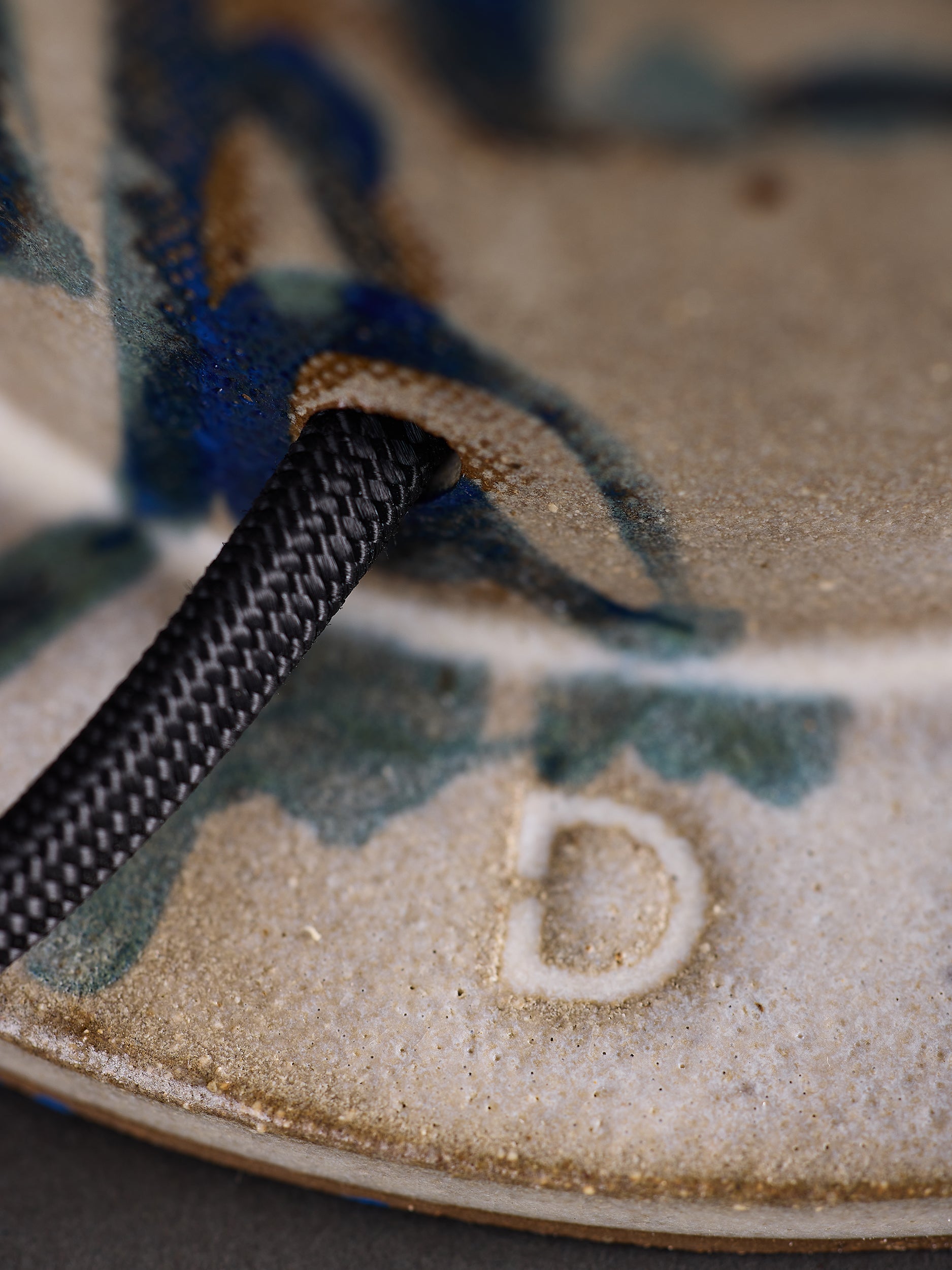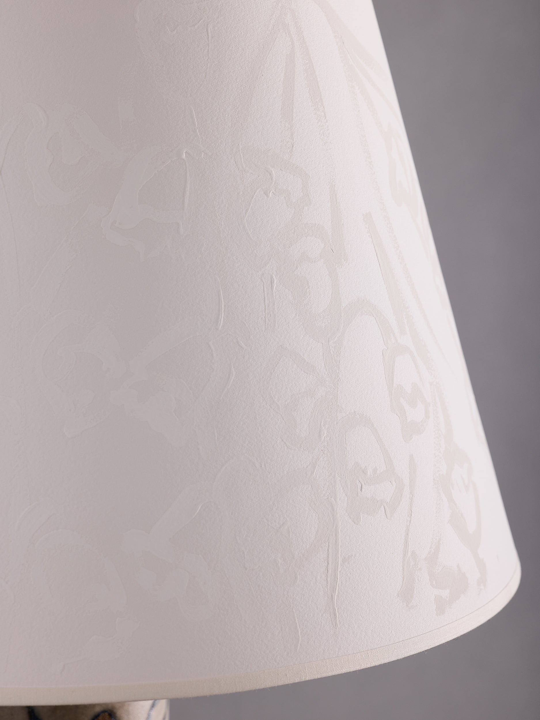 Pictured here in parchment dipped glaze with ultramarine underpainting, antique brass fittings, black cloth cord, full-range dimmer socket, and a hand painted archival watercolor paper shade in off-white.