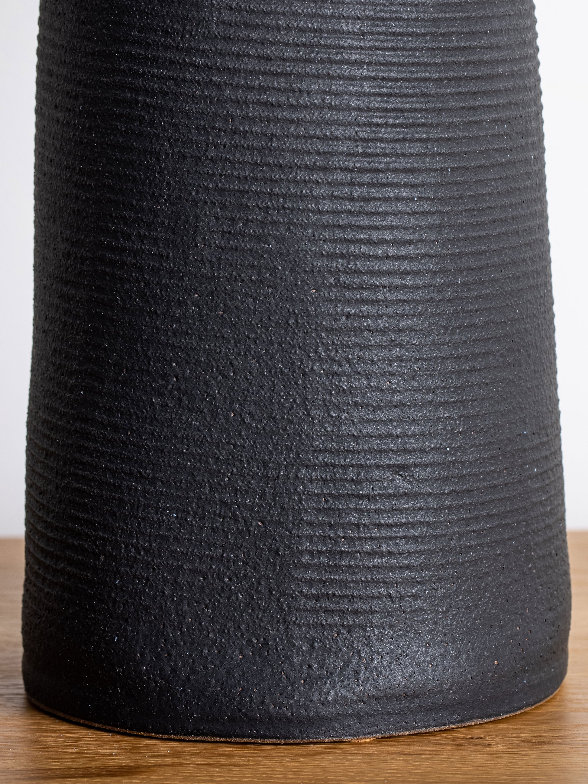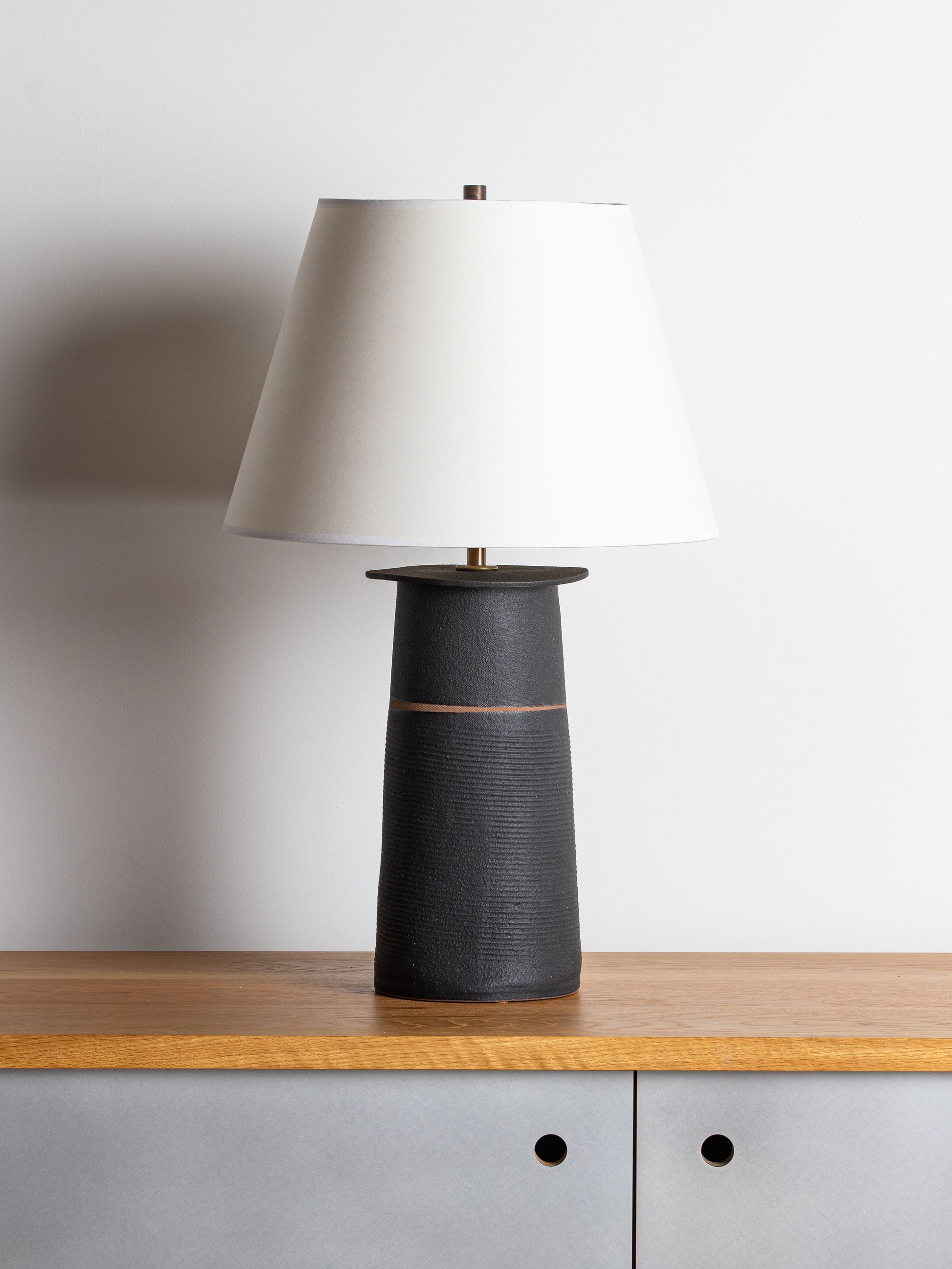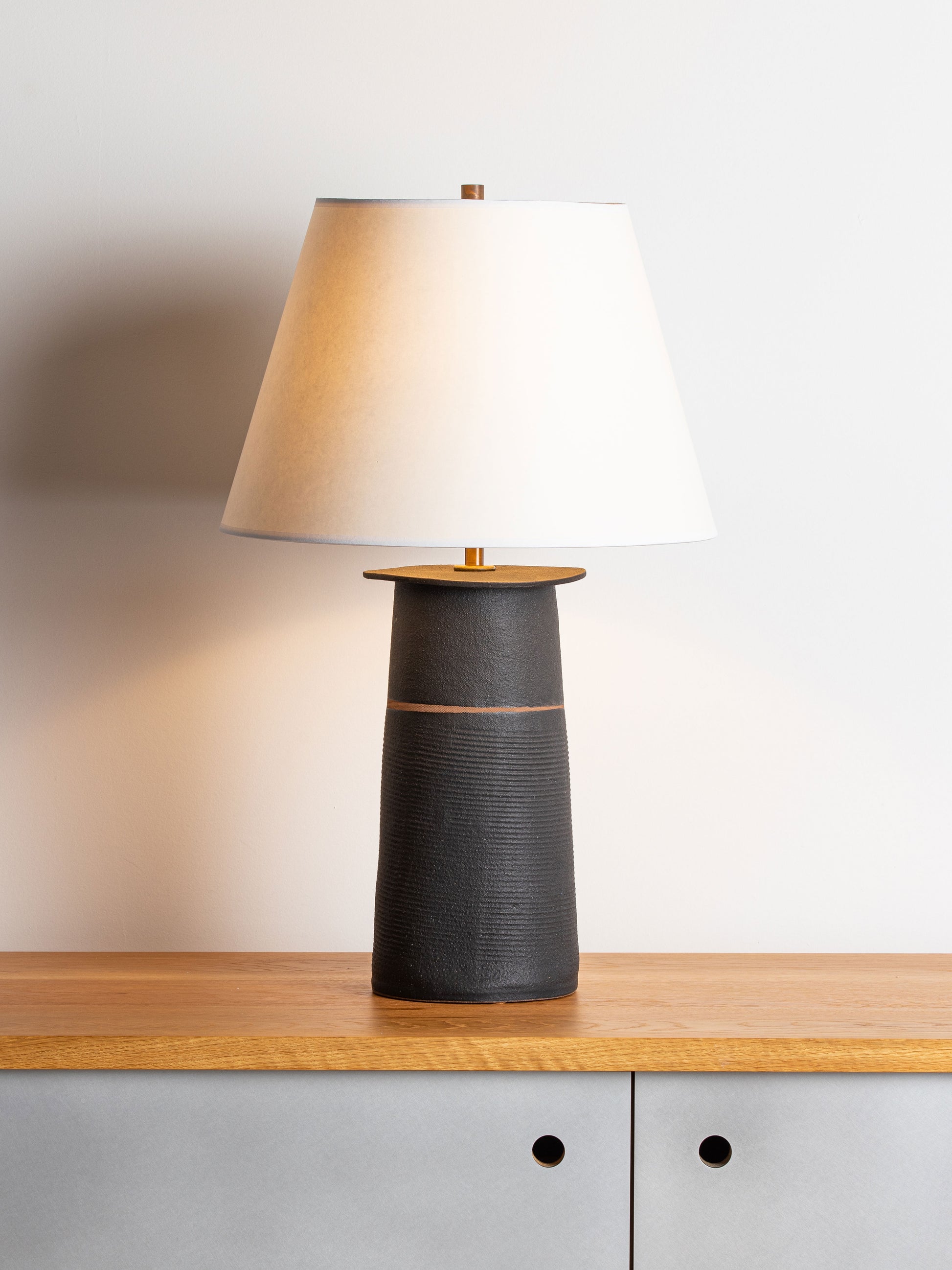 Our stoneware Lincoln Lamp is handcrafted using slab-construction techniques. The lamp’s pattern is created by rolling the surface with textured rolling pins and rods.