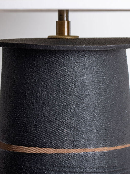 Pictured here in matte-black dipped glaze, antique brass fittings, a black-cloth cord, full-range dimmer socket, and an off-white linen shade.