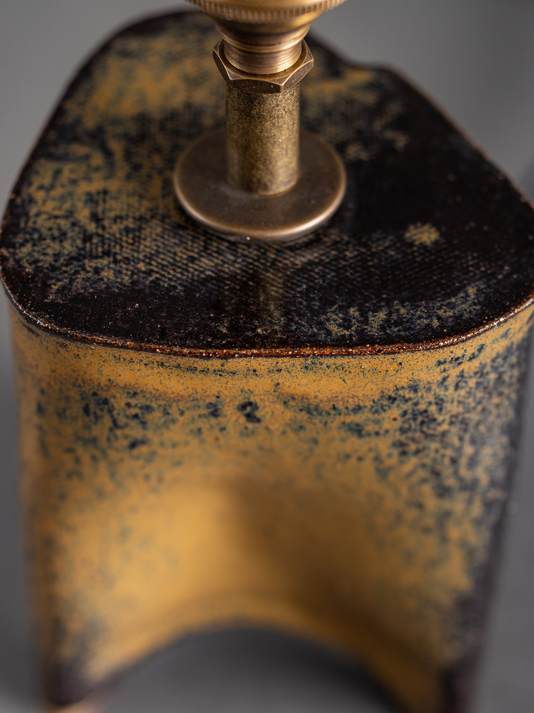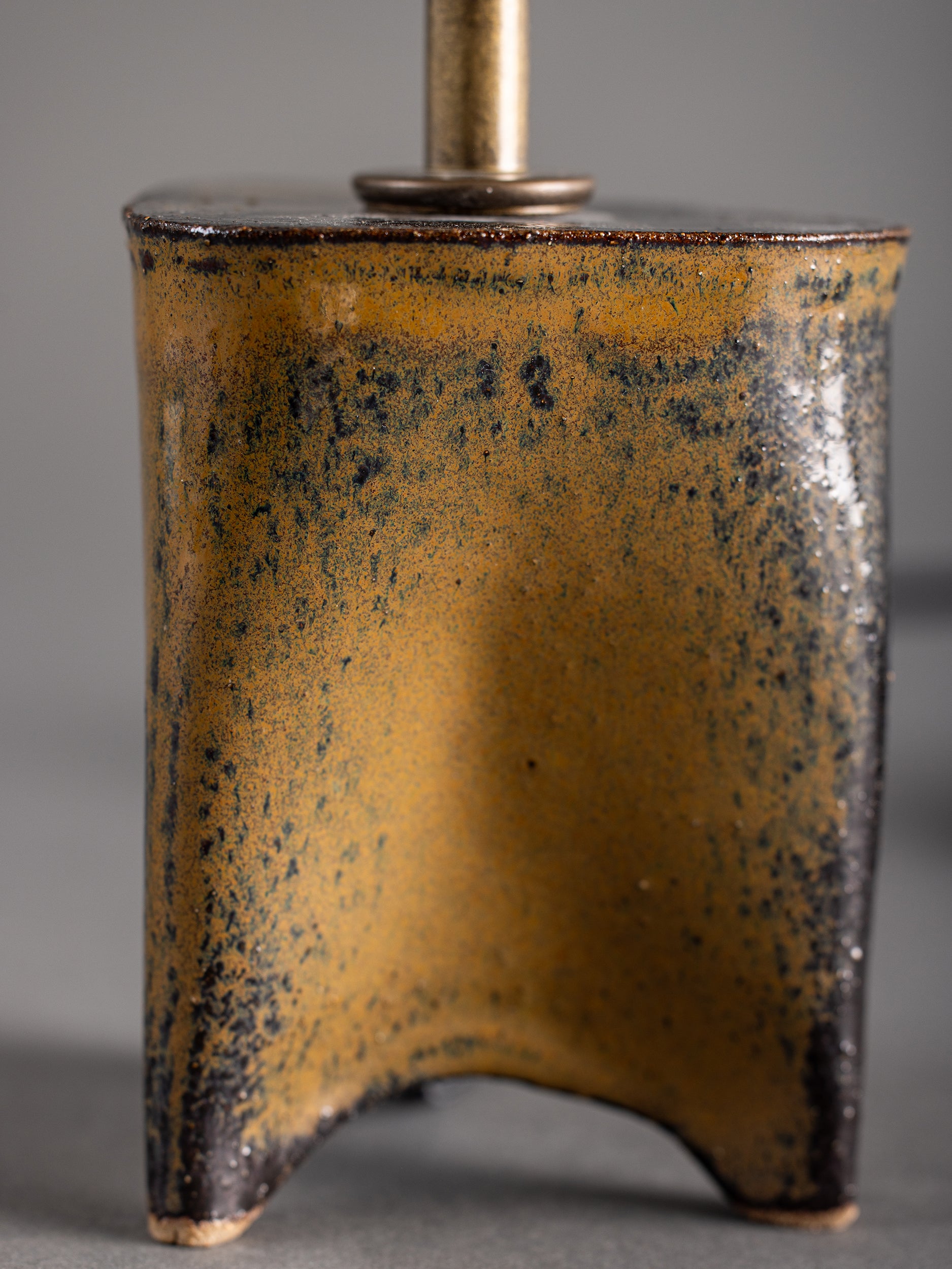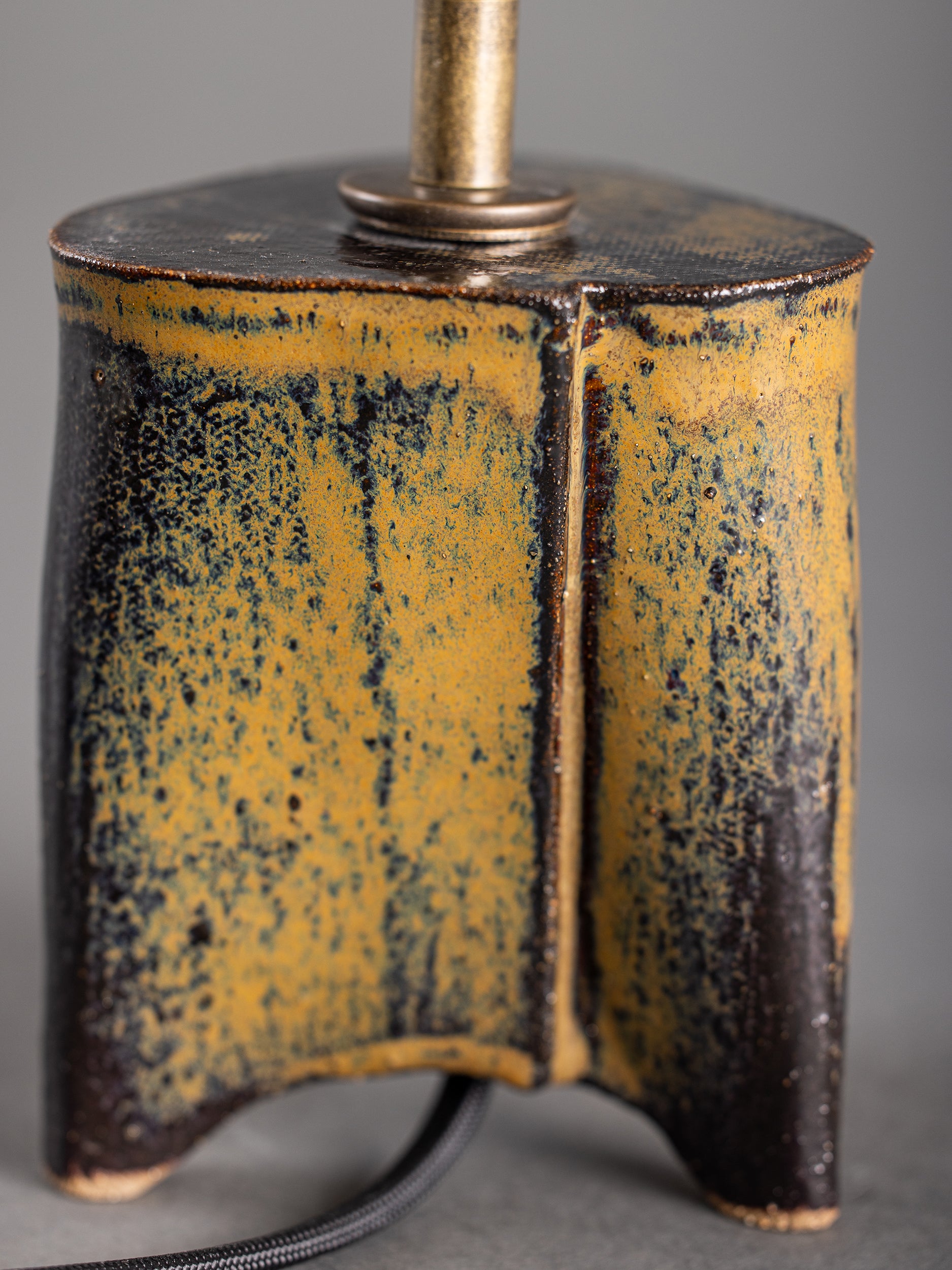 Pictured here in mushroom poured glaze, antique brass fittings, black cloth cord, in-line switch, and an off-white linen clip-on shade.