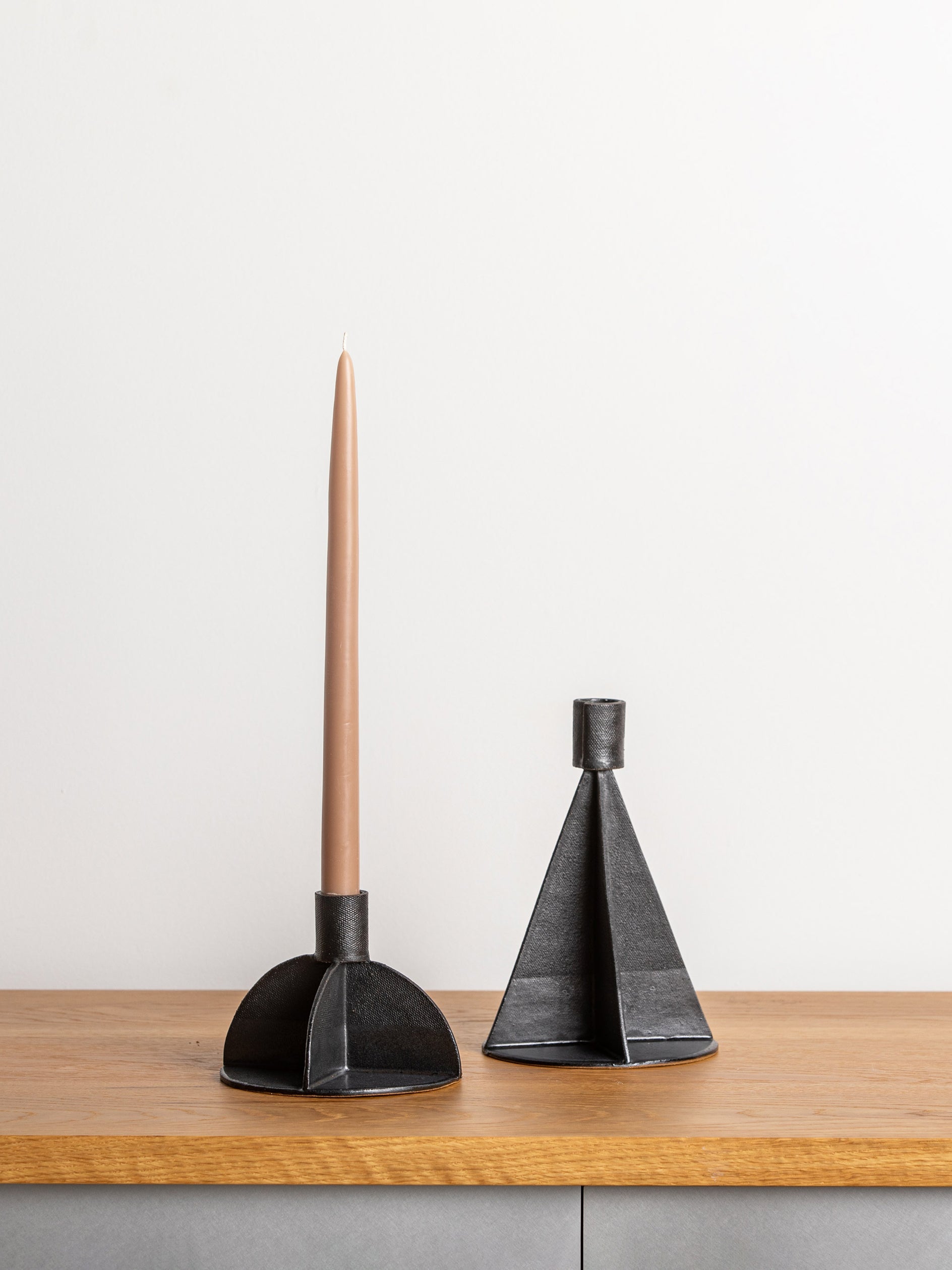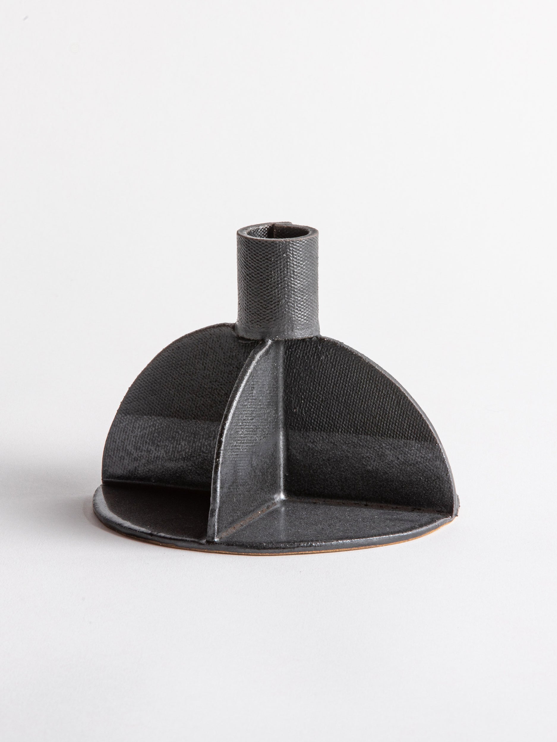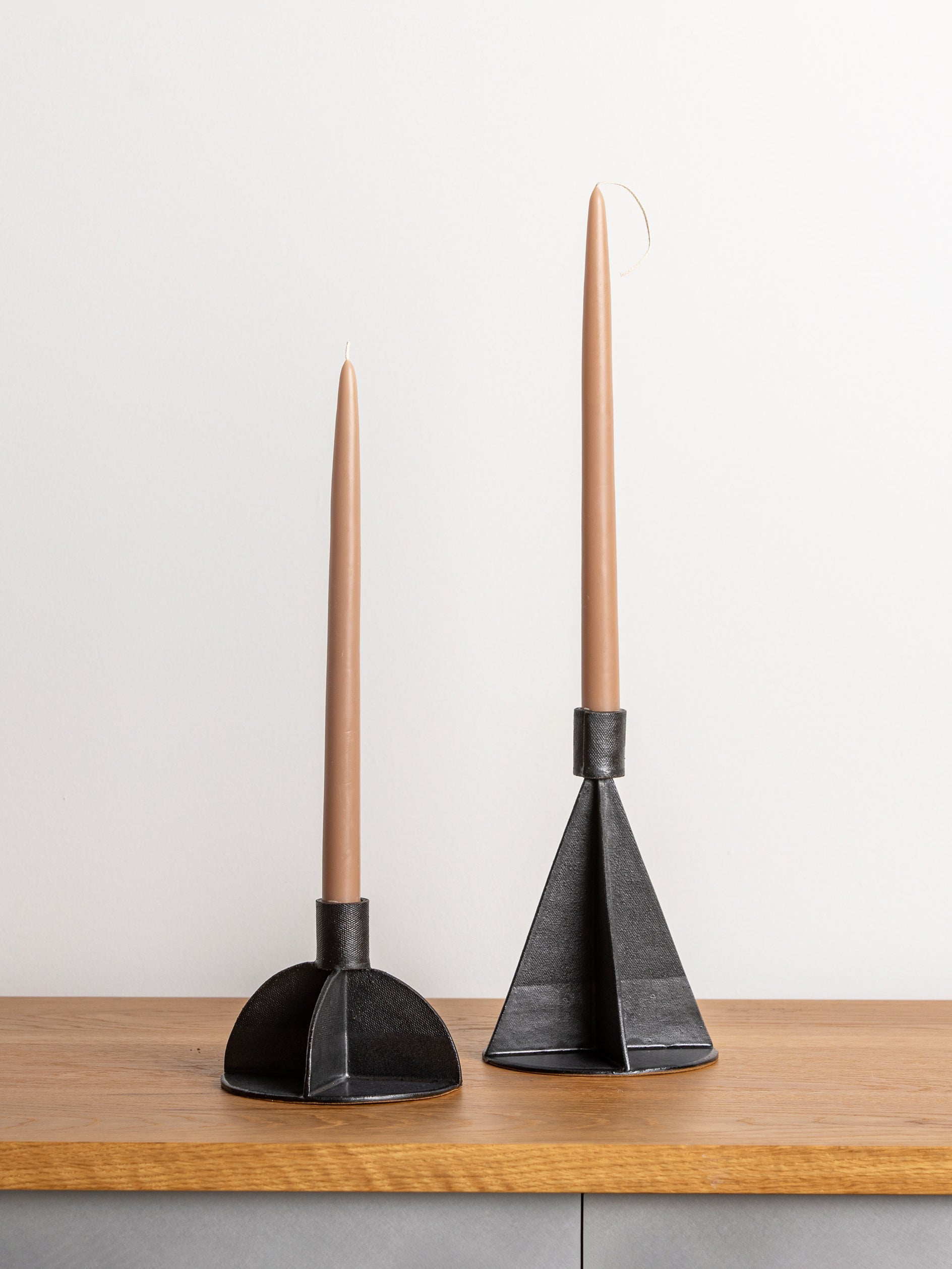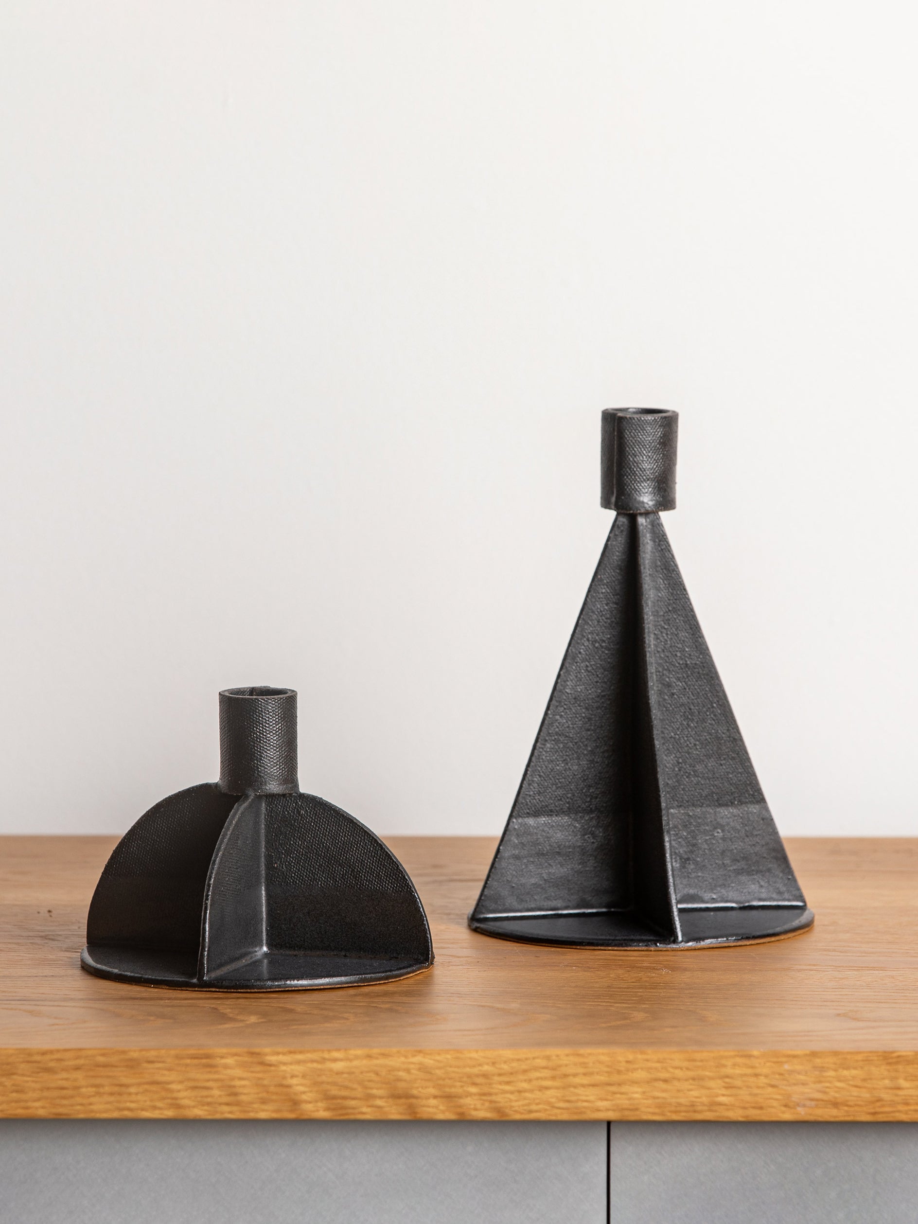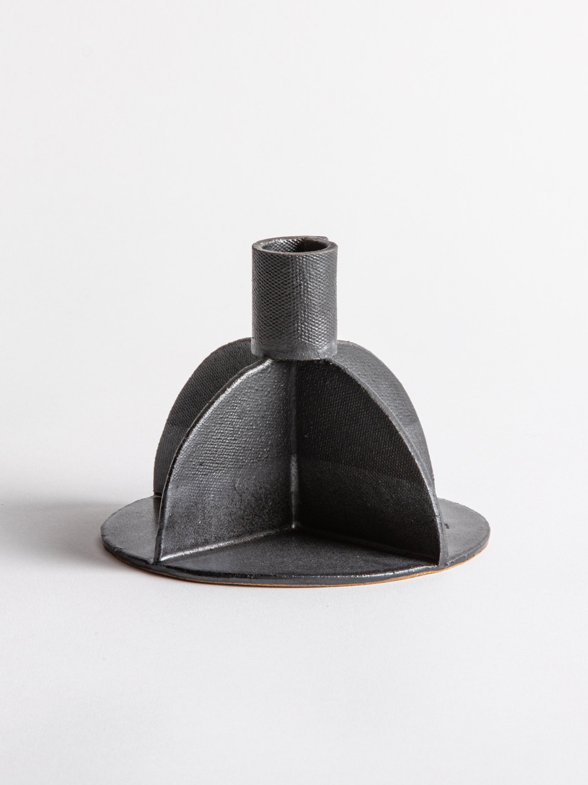 Pictured here in lead and matte-black dipped glaze. Candle holders accommodate a tapered candle with a 3/4” diameter base.