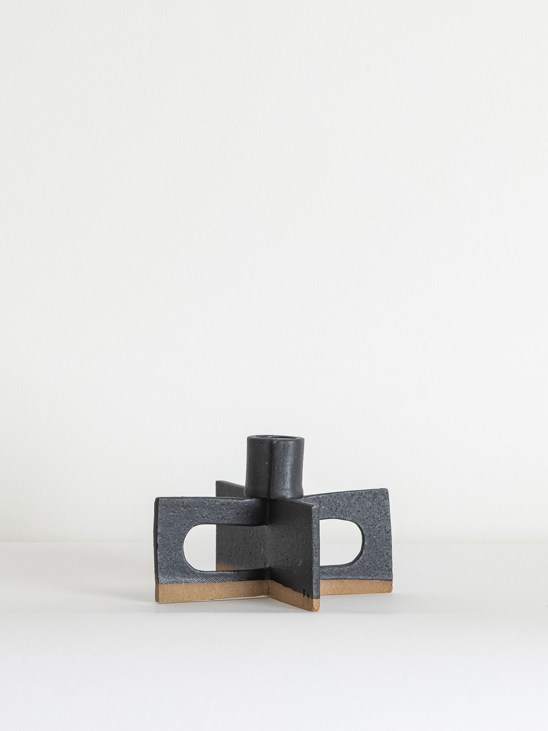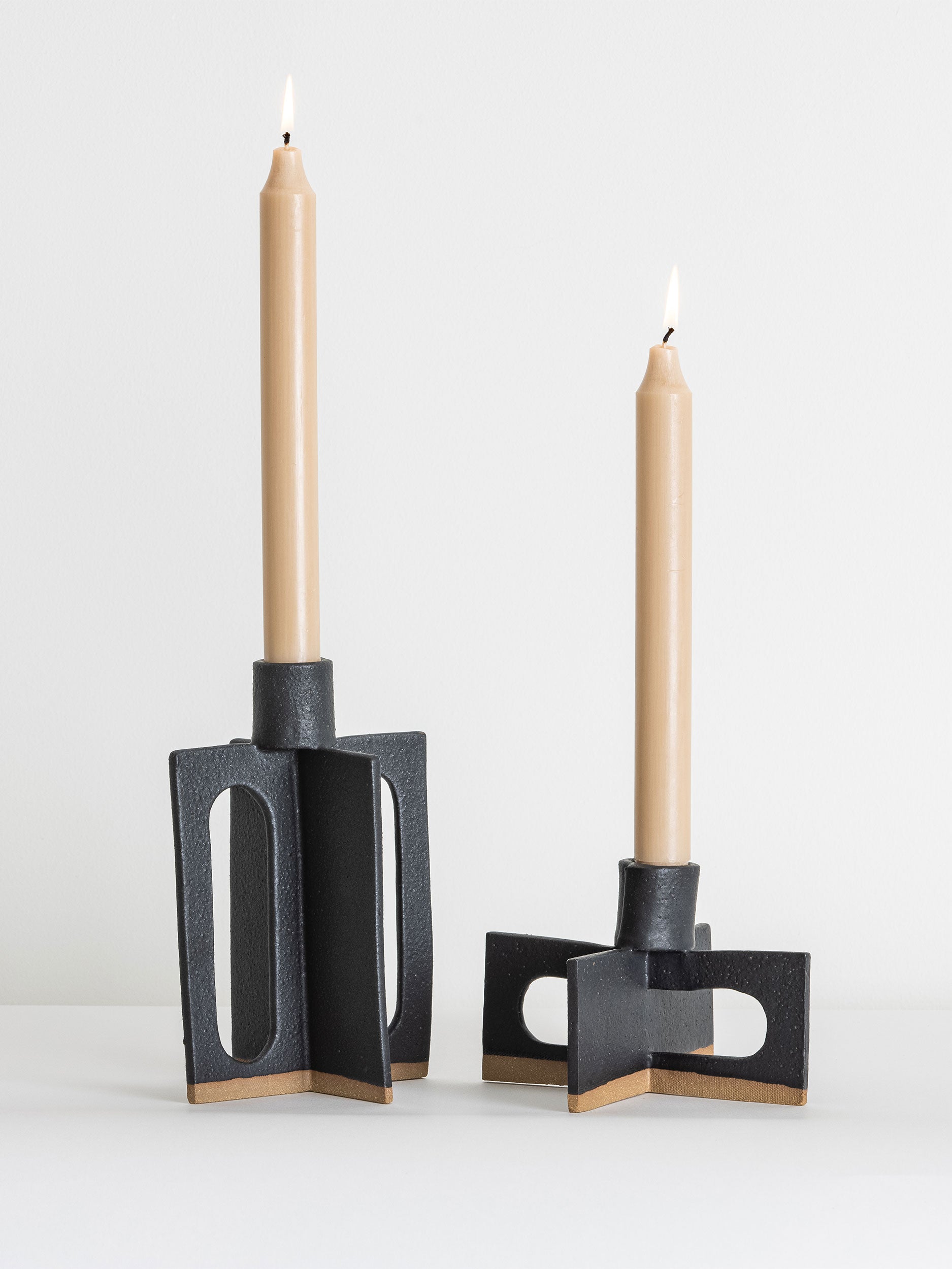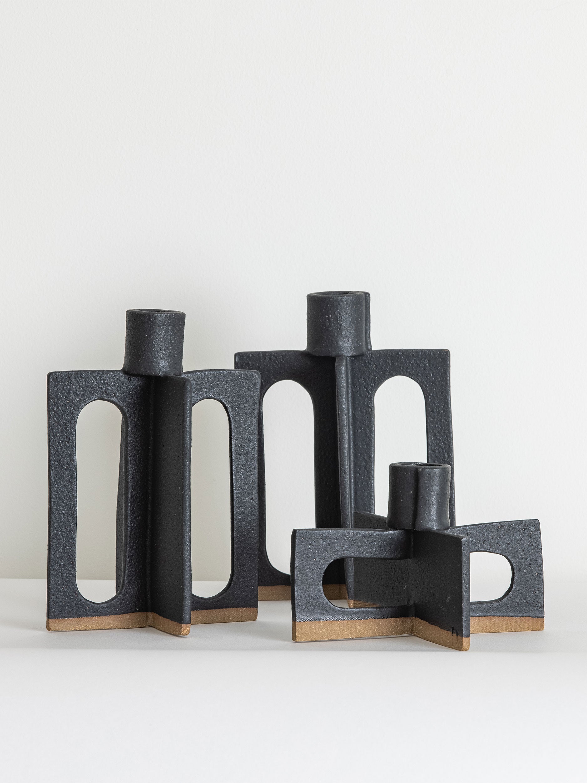 Pictured here in matte-black dipped glaze. Candle holders accommodate a tapered candle with a 3/4” diameter base.