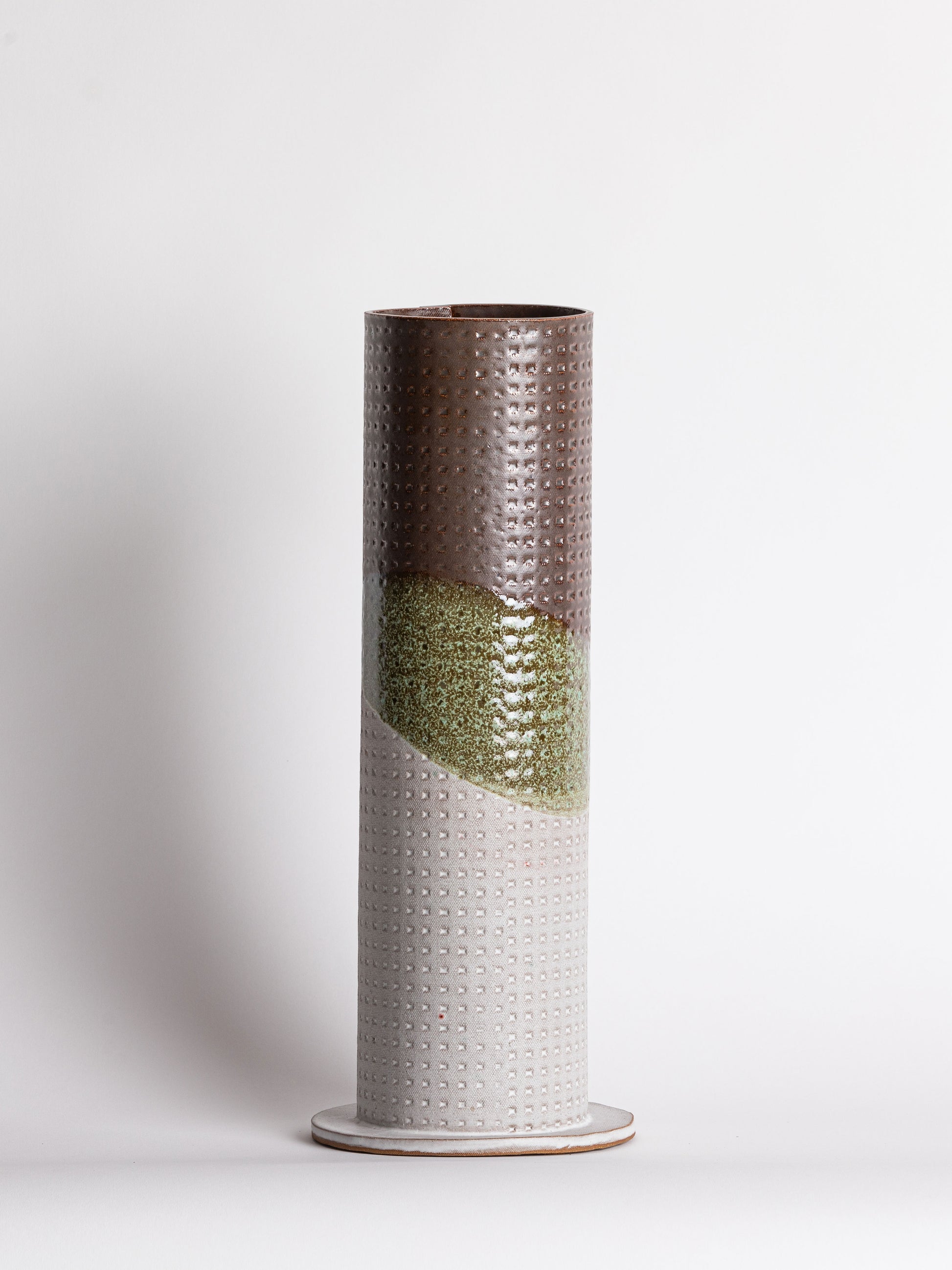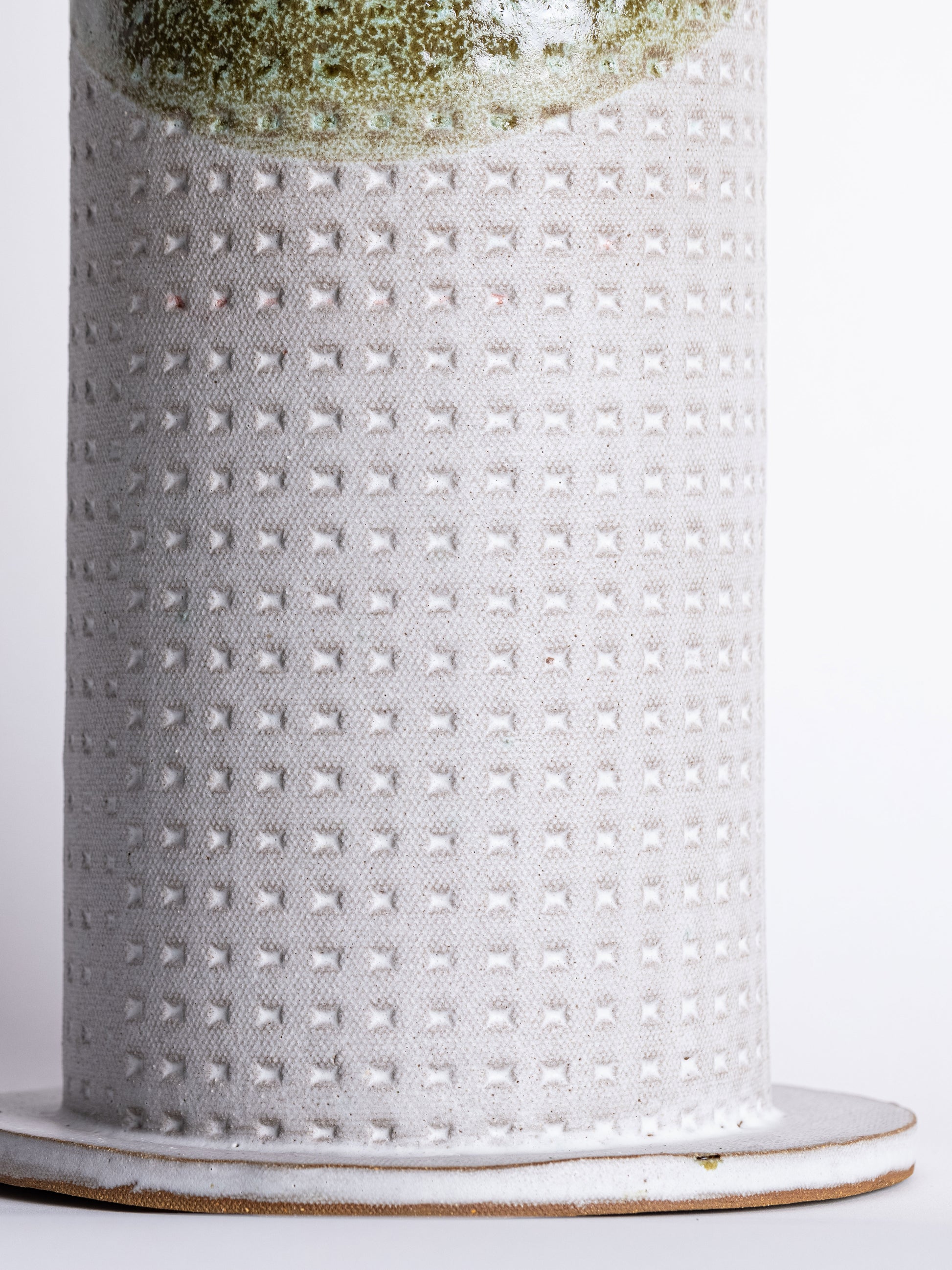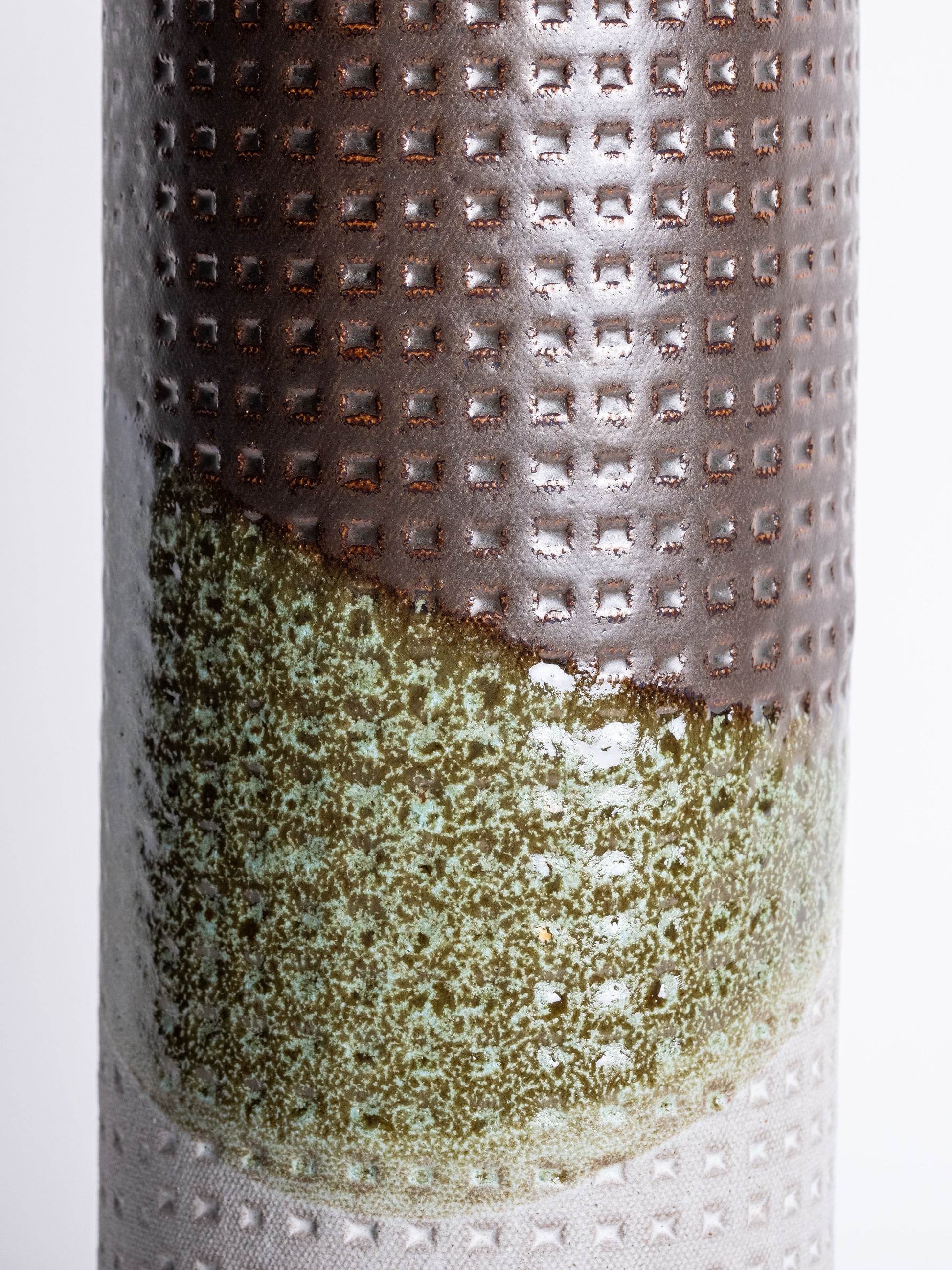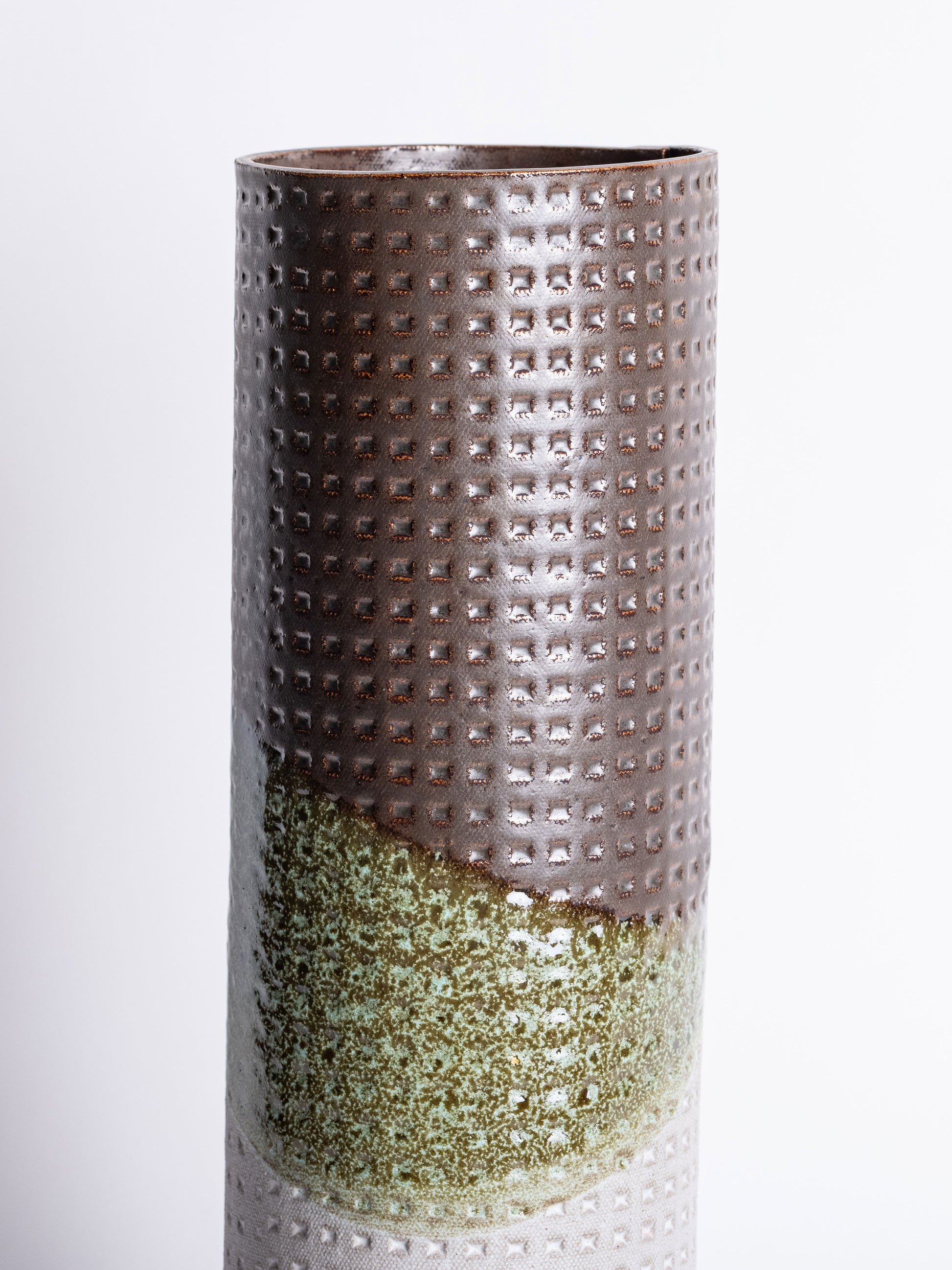 Our stoneware Prospect Heights Vase is handcrafted using slab-construction techniques. The vase's pattern is created by rolling the surface with textured rolling pins and rods.