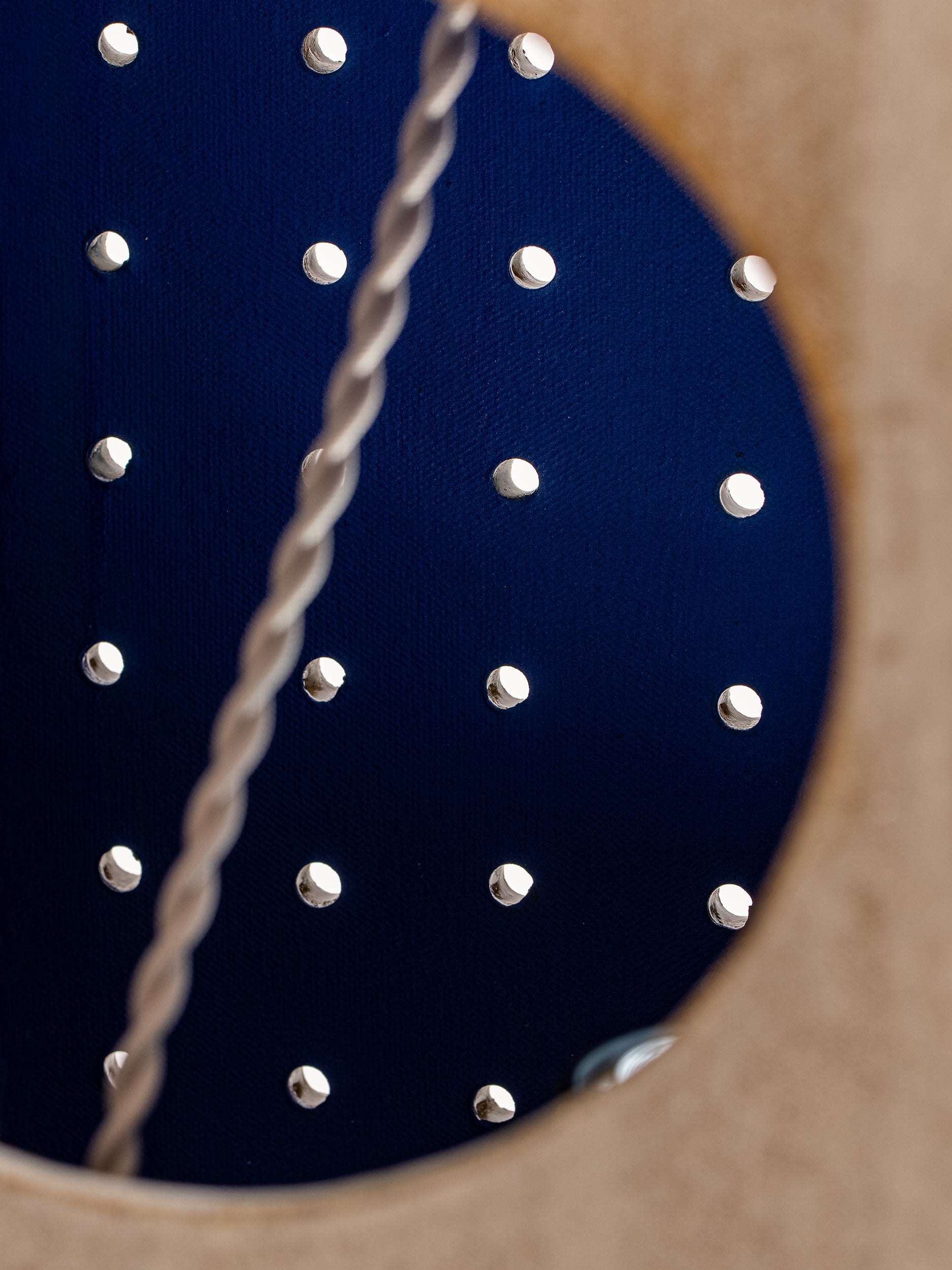 Pictured here in parchment dipped glaze with hand-painted ultramarine underglaze, antique brass fittings, beige-cloth cord, a full-range dimmer socket, and a wheat handkerchief linen shade.