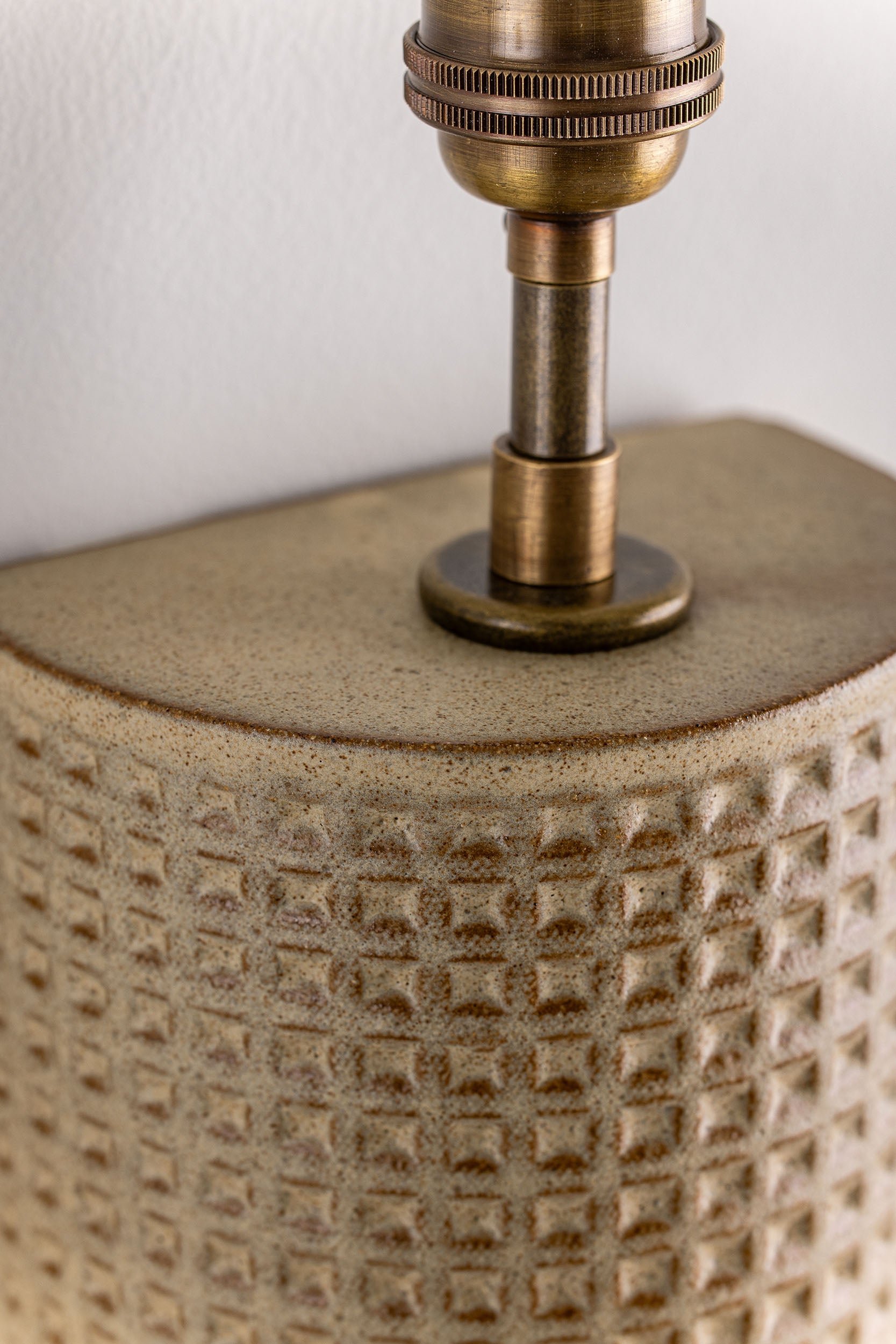 Pictured here in ochre dipped glaze, antique brass fittings, and an archival-paper half shade.