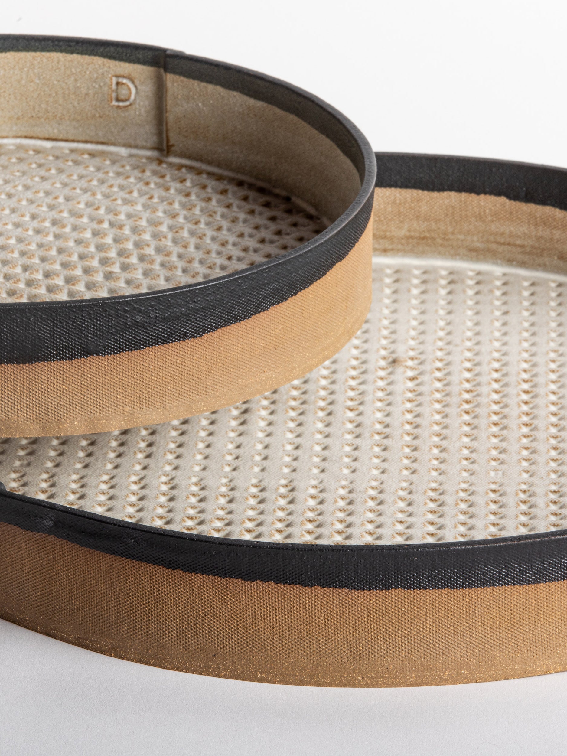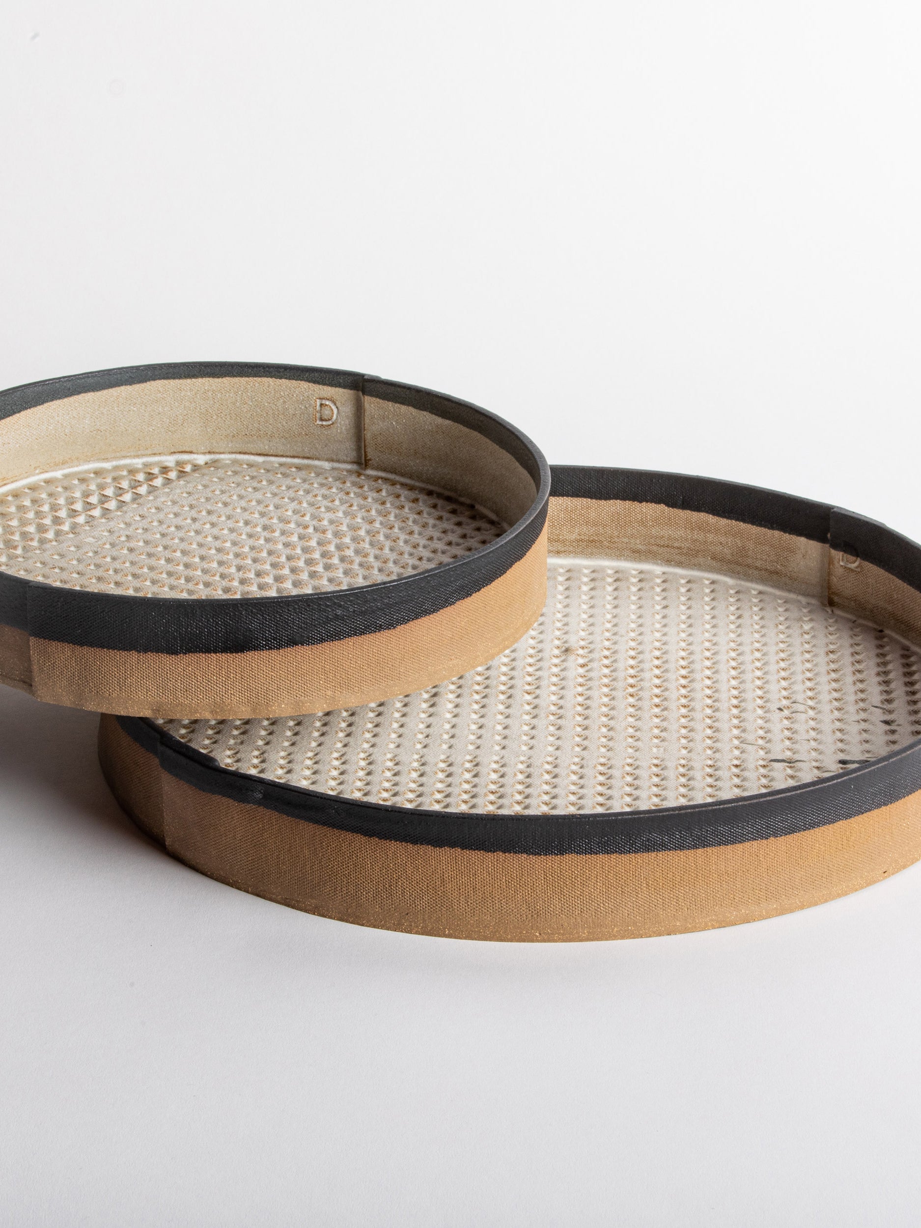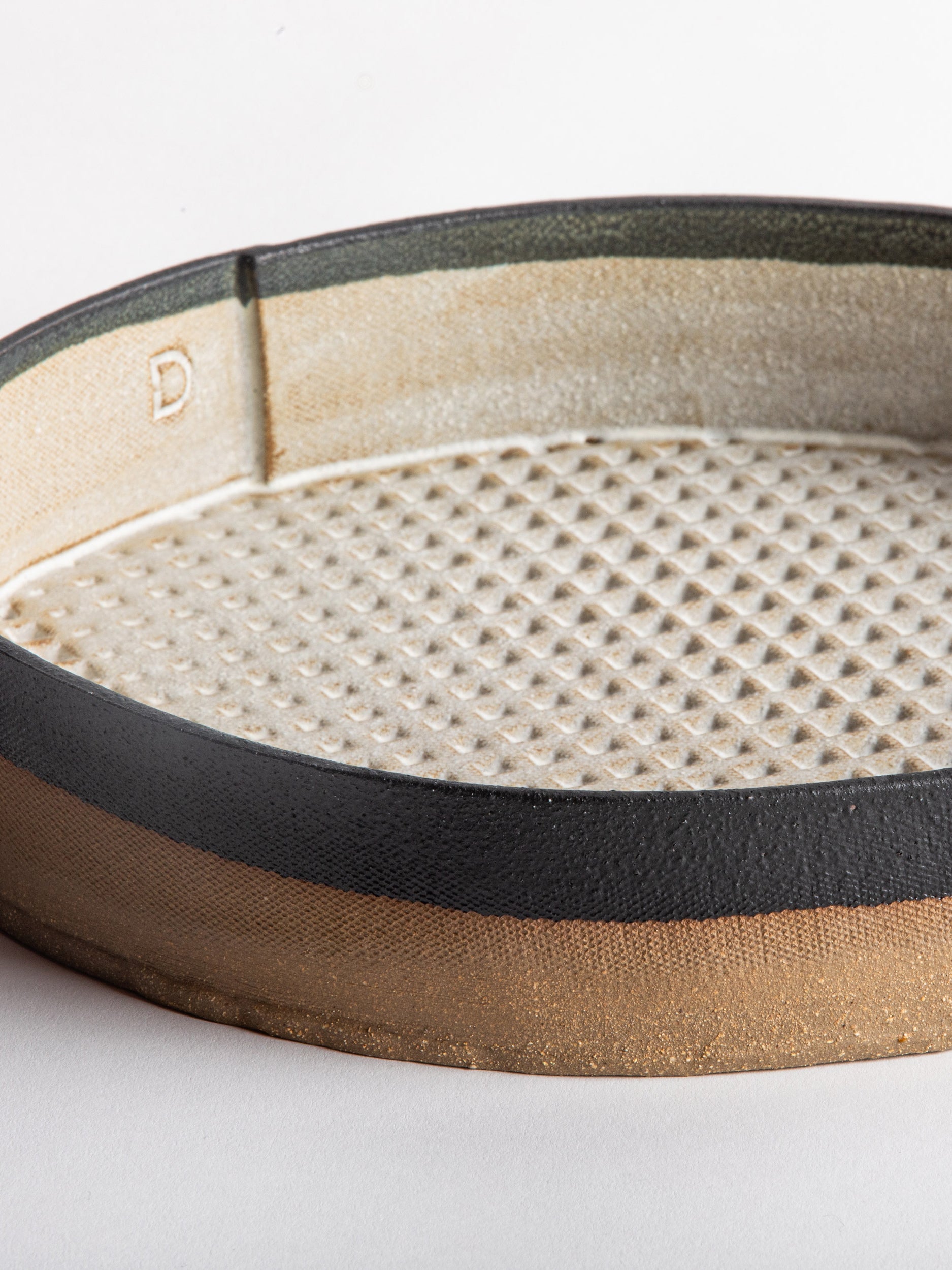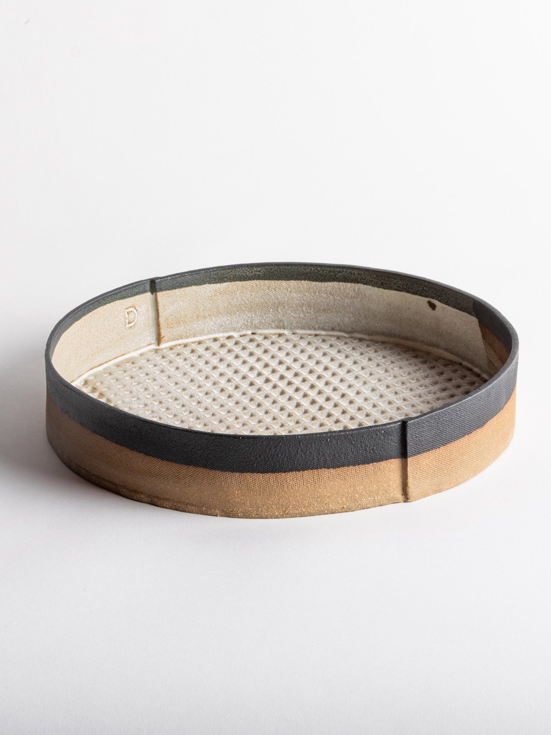 Our stoneware Slab Tray is handcrafted using slab-construction techniques. The tray’s pattern is created by rolling the surface with textured rolling pins and rods.
