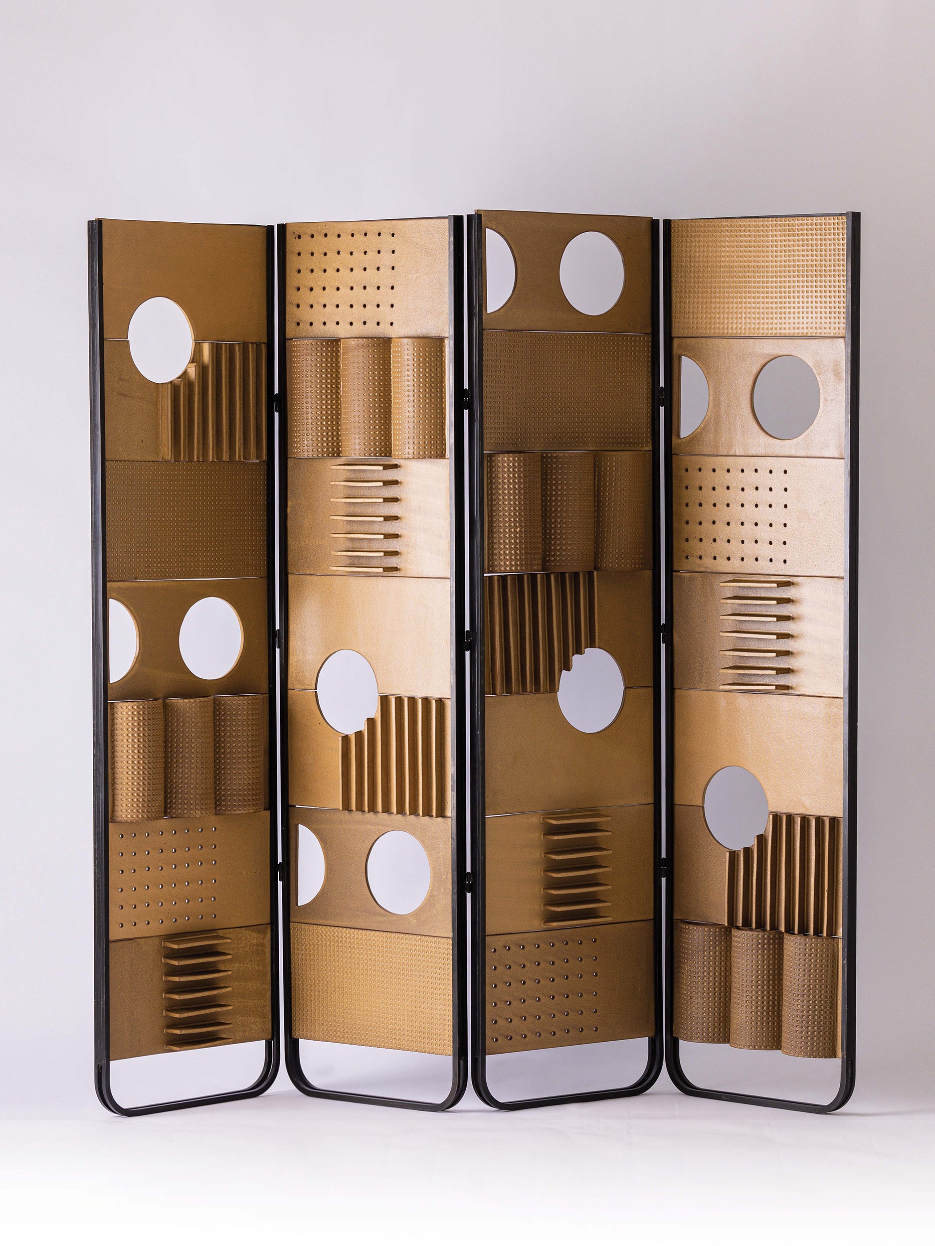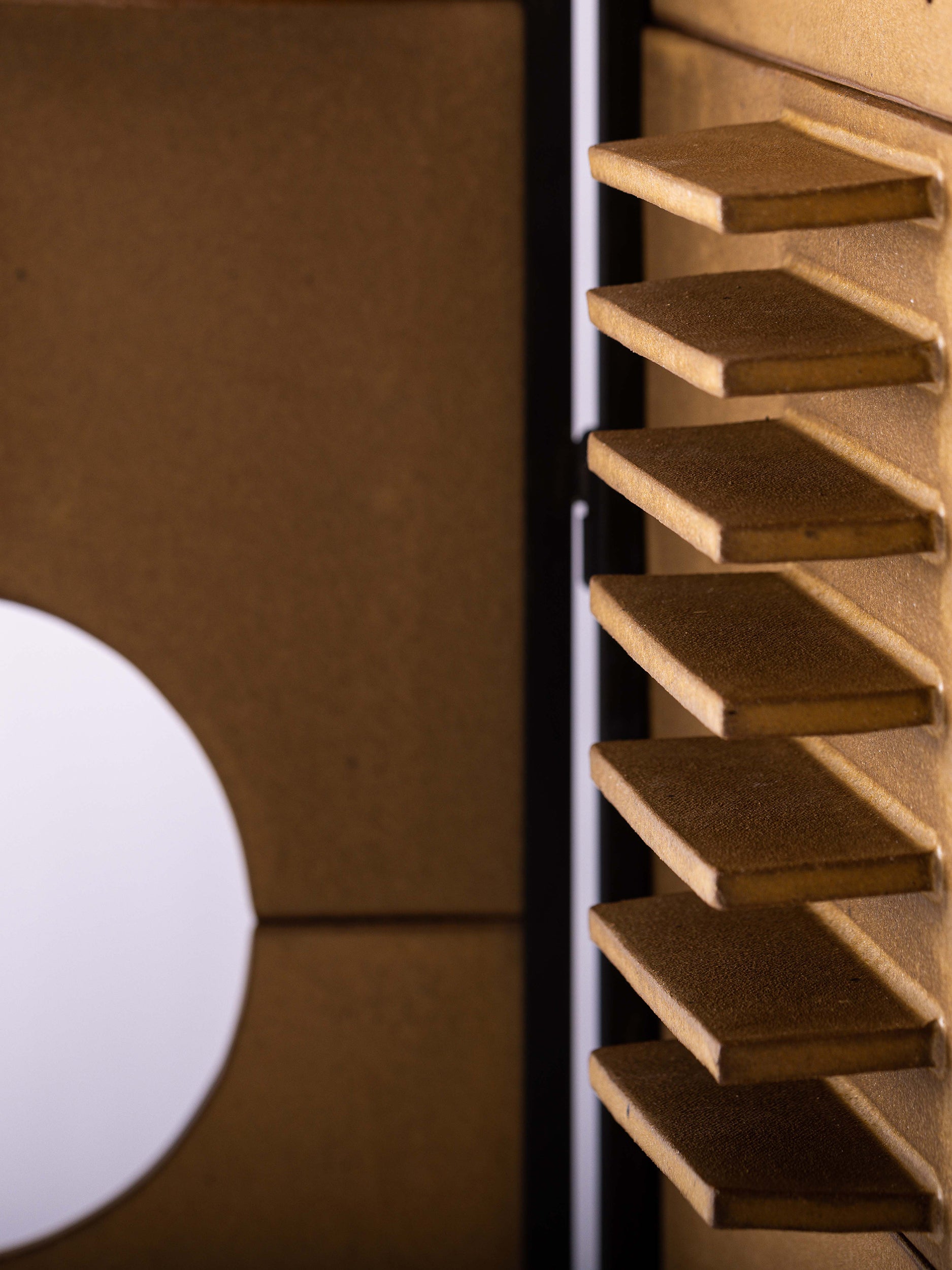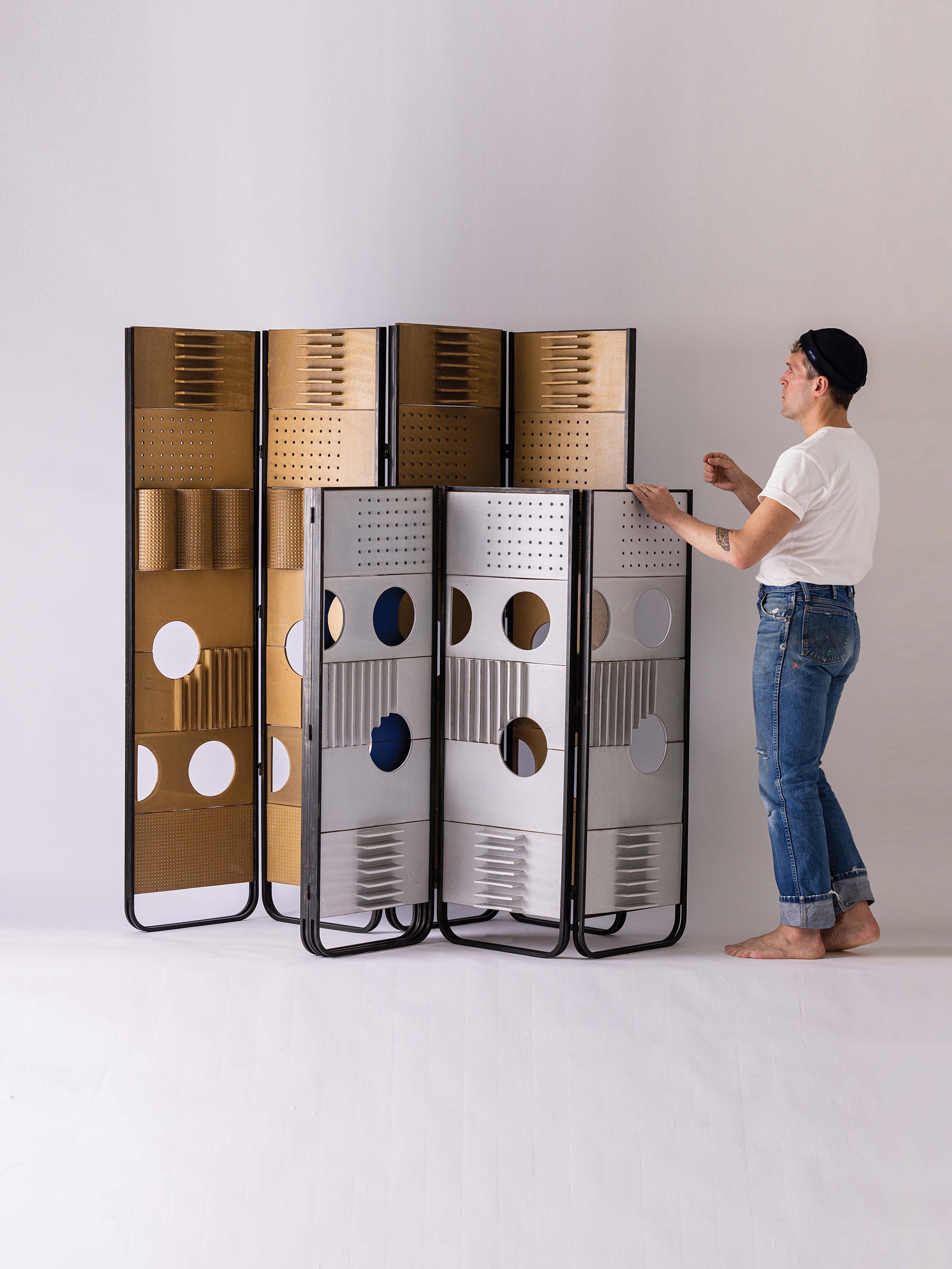 Our stoneware Cassette Folding Screen #2 is handcrafted using slab-construction techniques. Each ceramic panel slots individually into a blackened steel frame,