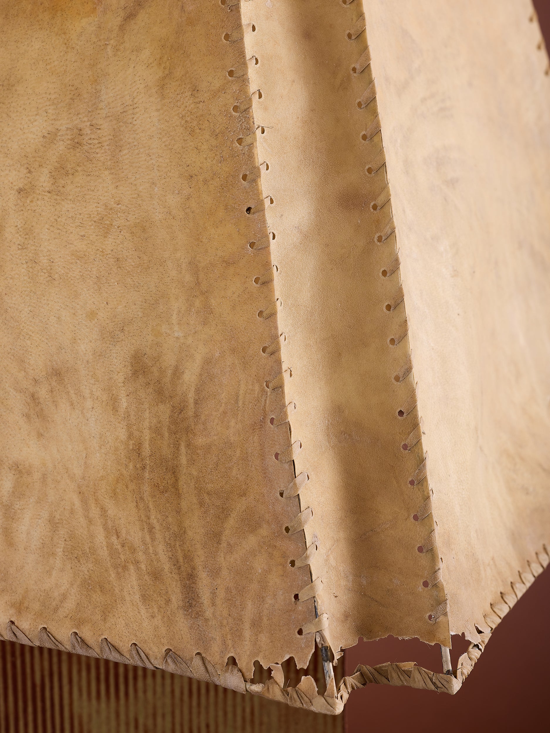 Pictured here in green shino glaze, antique brass fittings, beige cloth cord, full range dimmer socket and a vintage goatskin with rawhide whipstitch. Decades old, each have lived a life, pulling away at the corners of the frame, and gently warped from exposure to moisture.