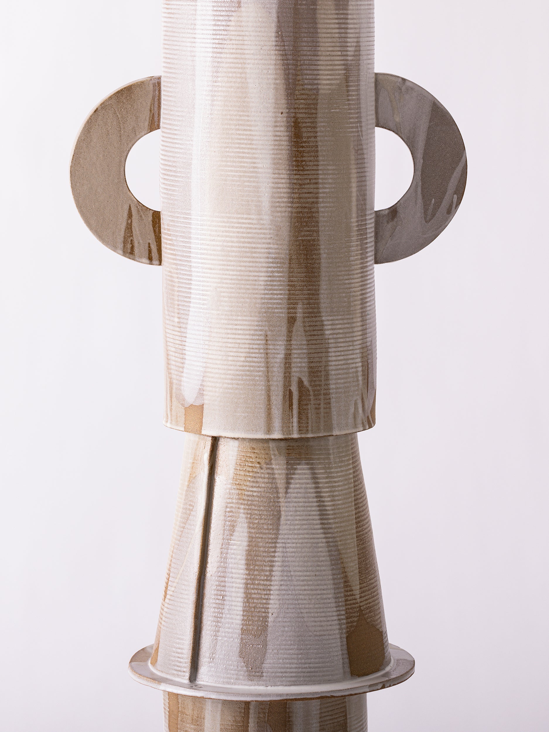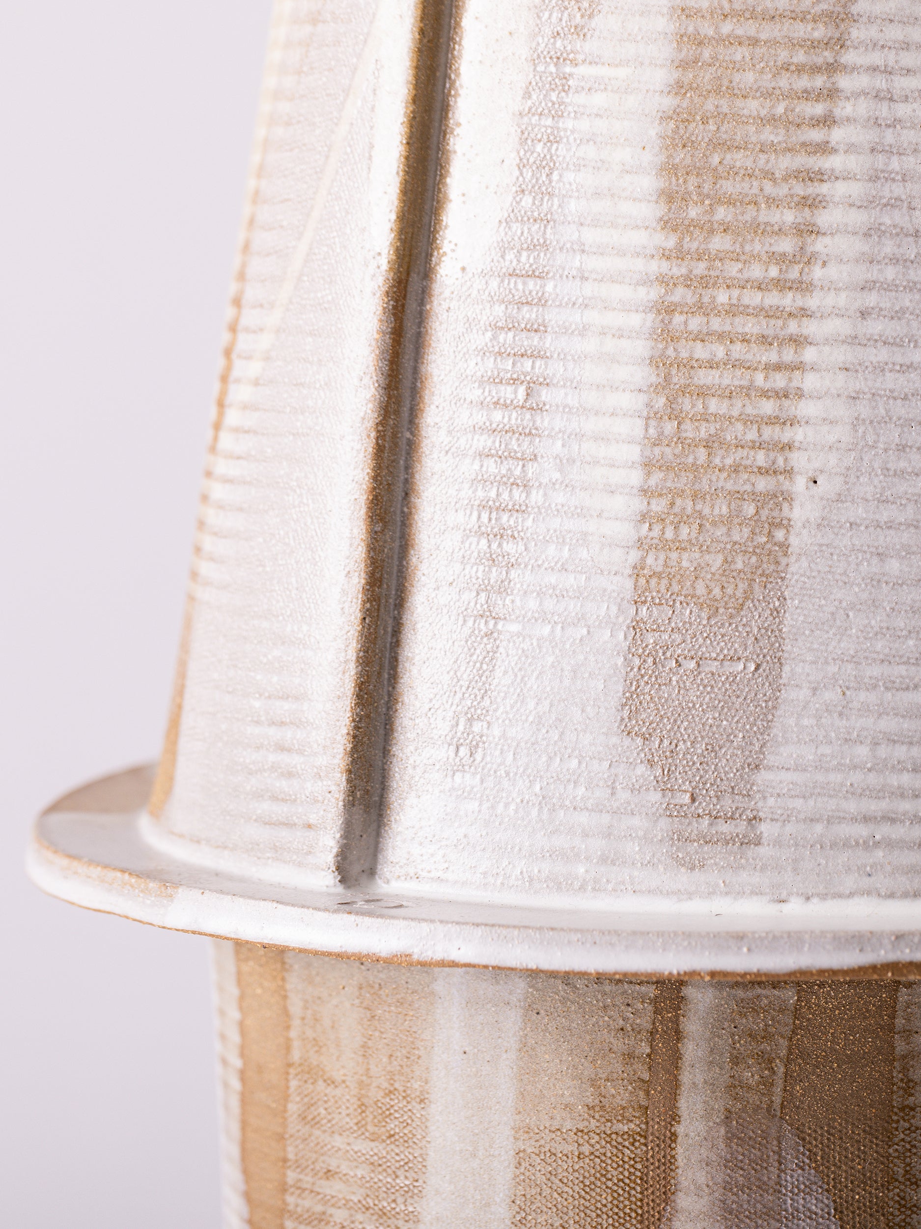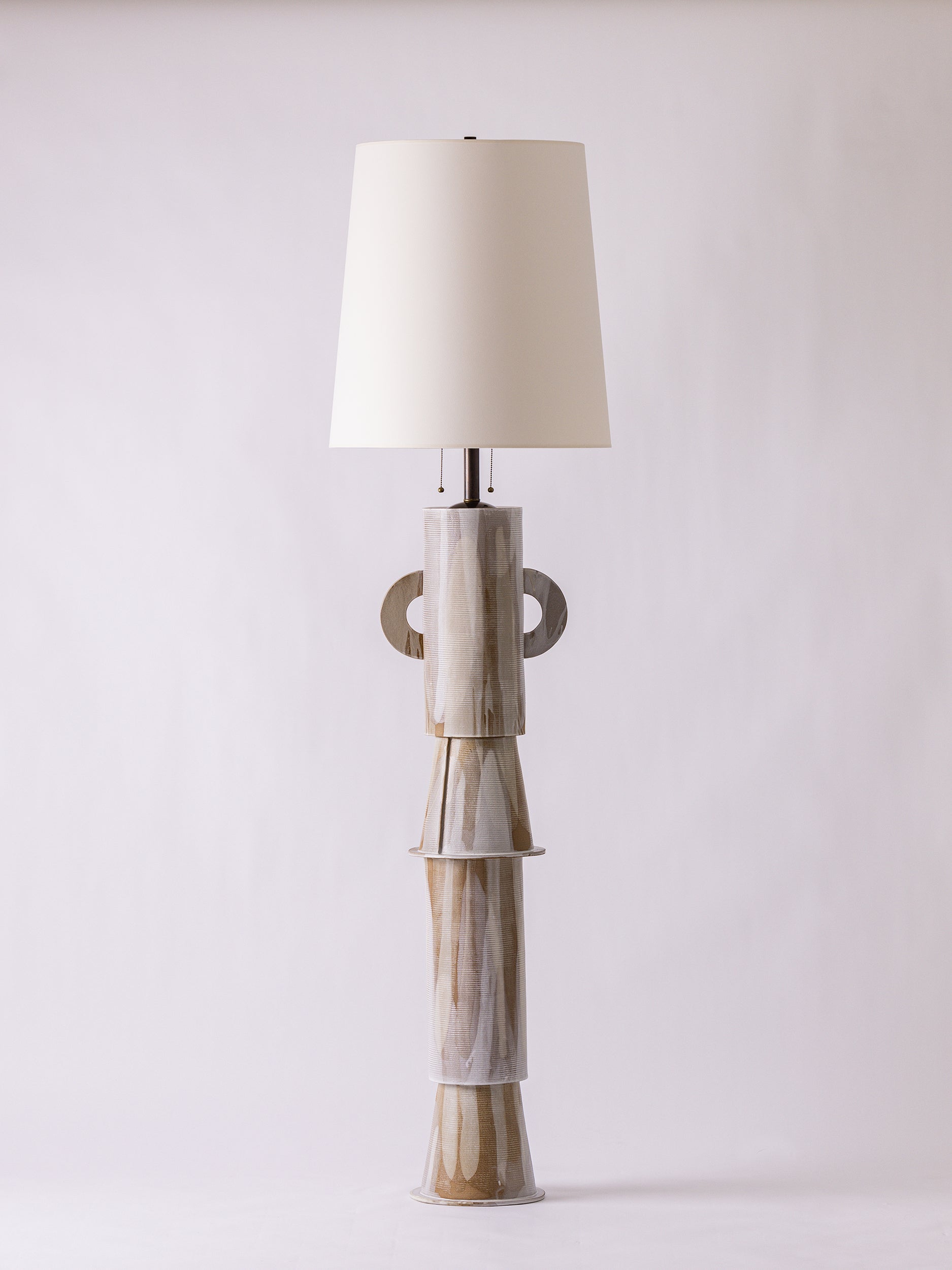 Our stoneware Tetrad Floor Lamp is handcrafted using slab-construction techniques. The lamp’s pattern is created by rolling the surface with textured rolling pins and rods.
