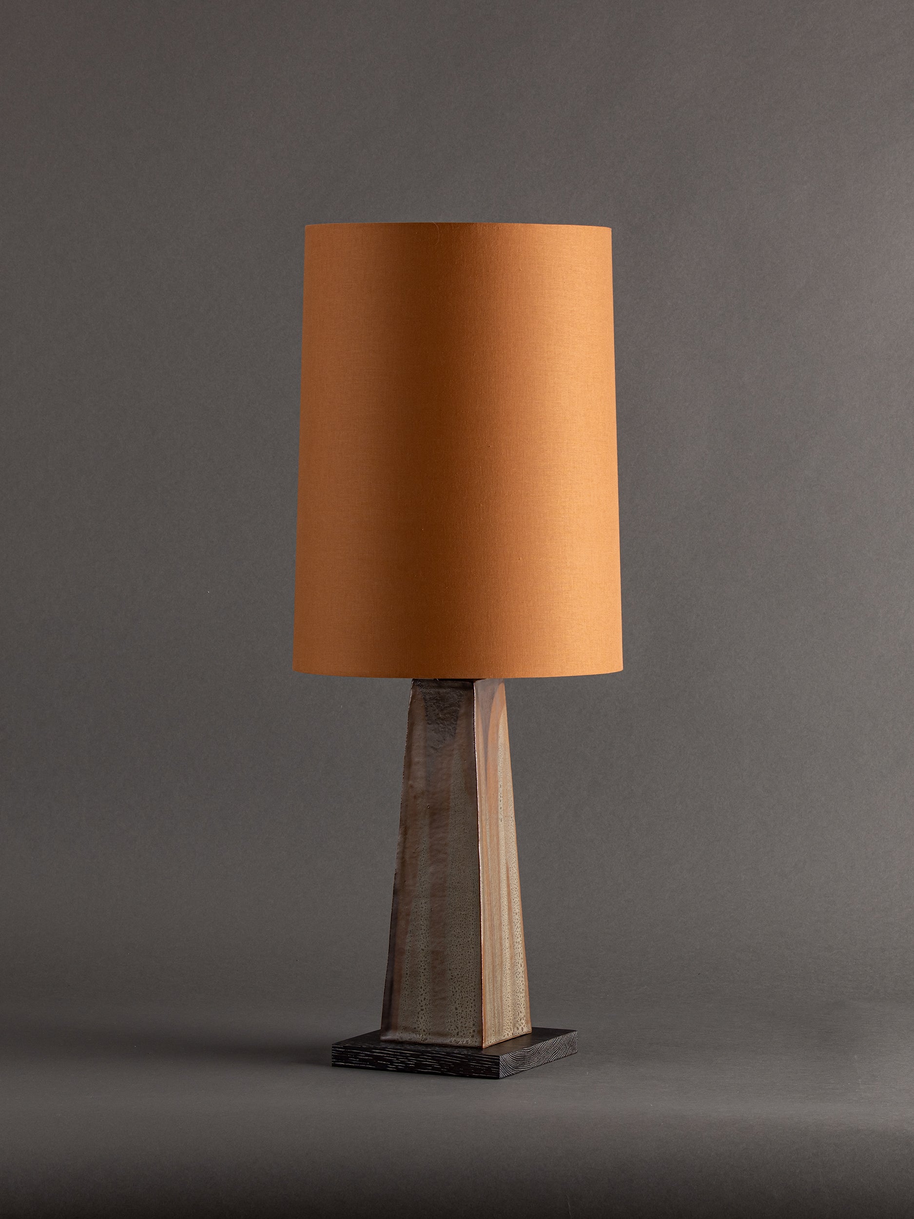 Pictured here in walnut and ochre clay poured glaze, dark cerused wood base, antique brass fittings, black cloth cord, in line switch, and a rust handkerchief linen shade.