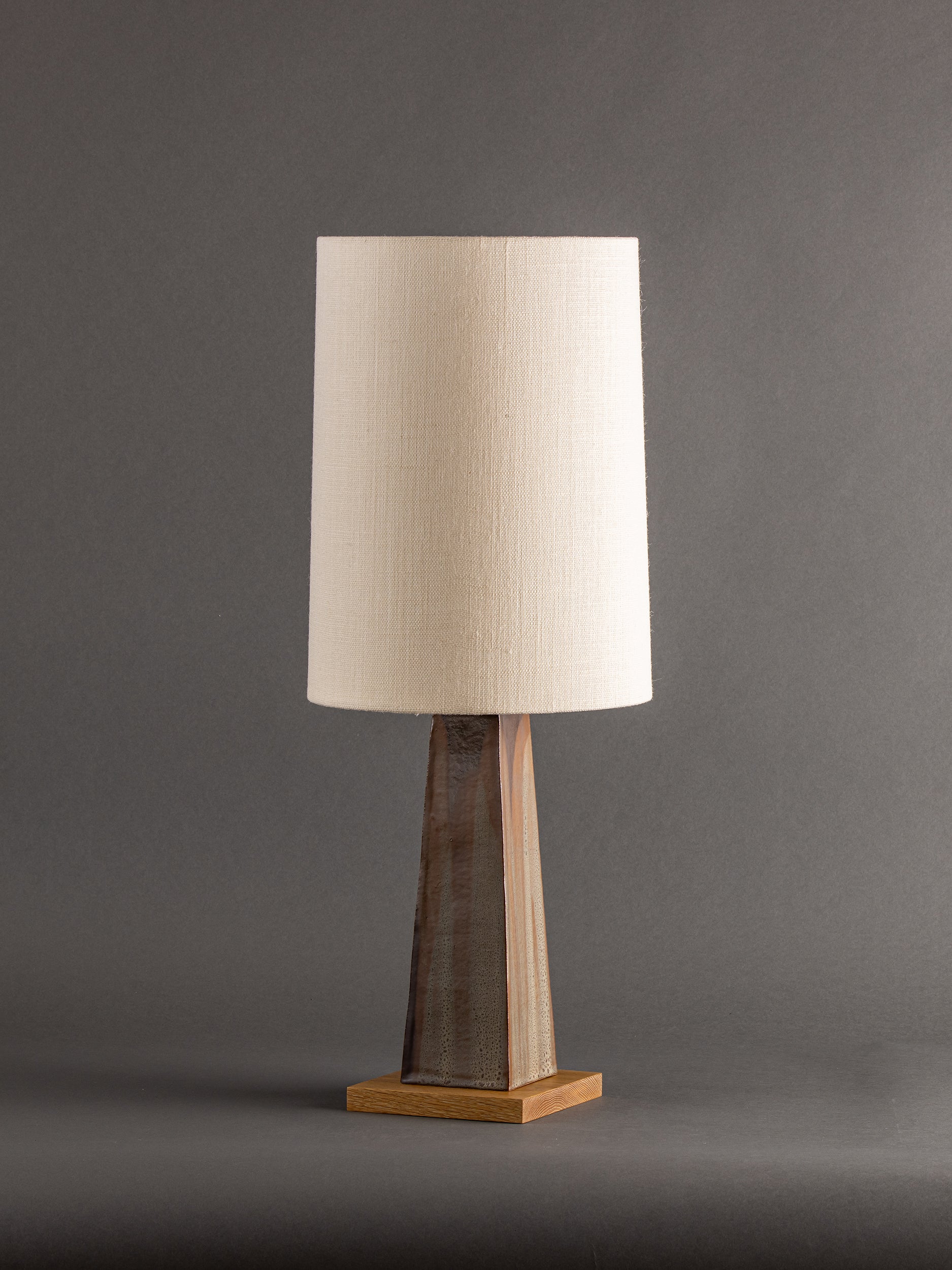 Our stoneware and oak Tower Table Lamp is handcrafted using slab-construction and cerusing techniques.