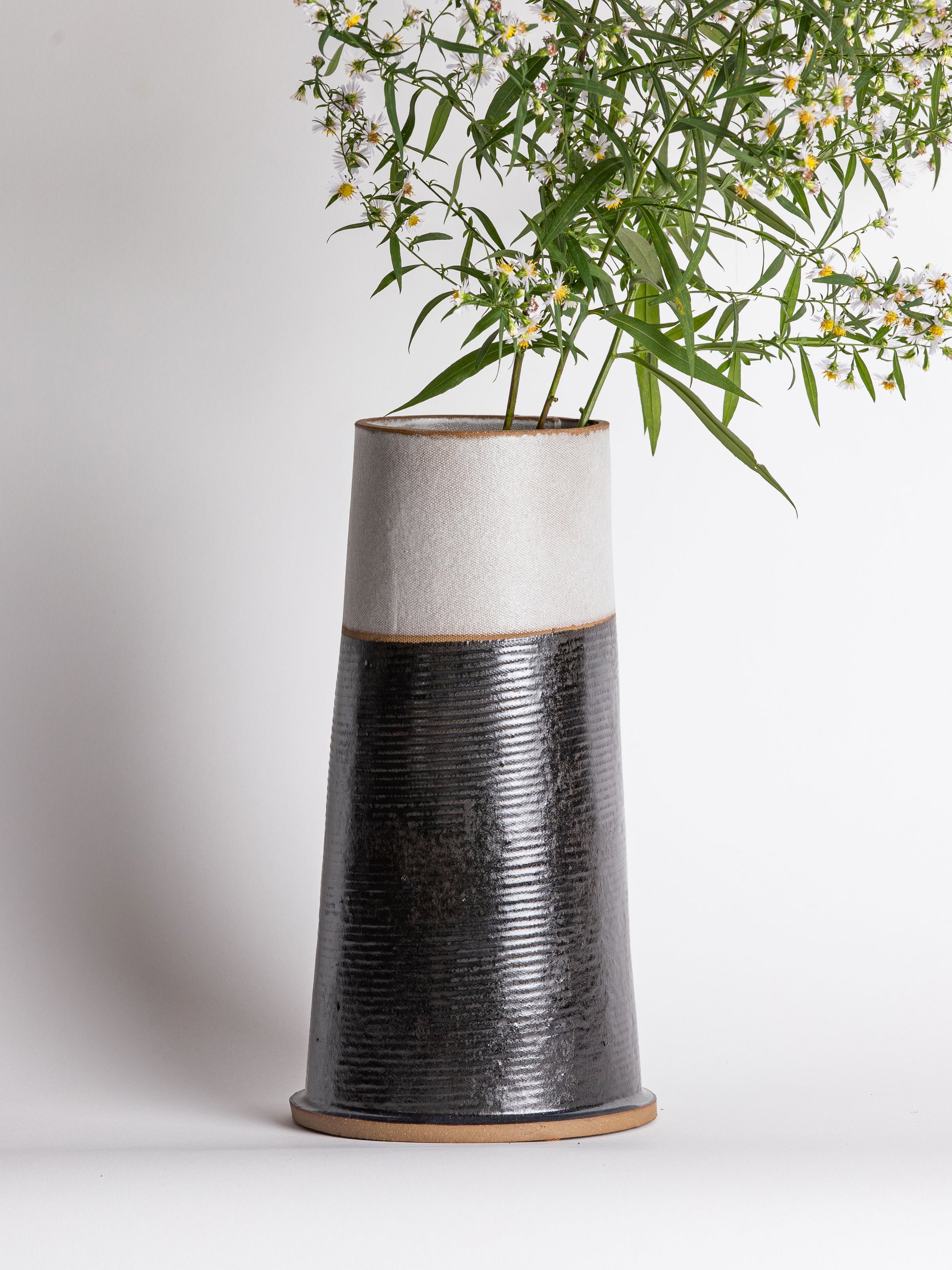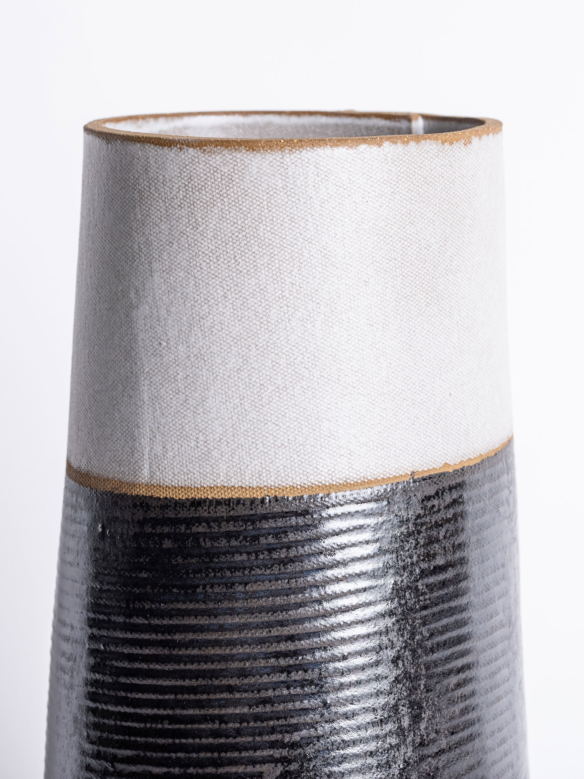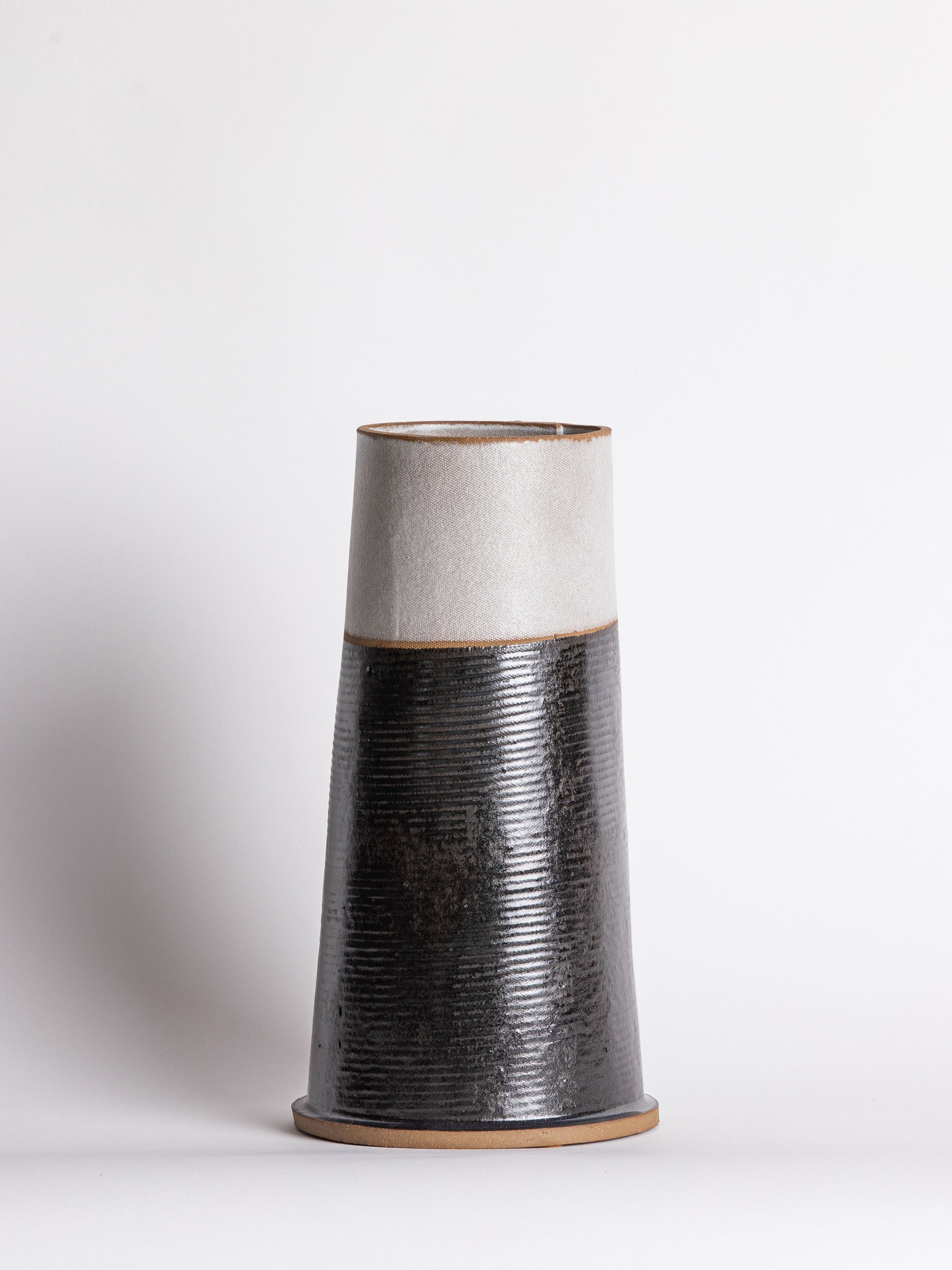 Our stoneware Turnier Vase is handcrafted using slab-construction techniques. The vase's pattern is created by rolling the surface with textured rolling pins and rods.
