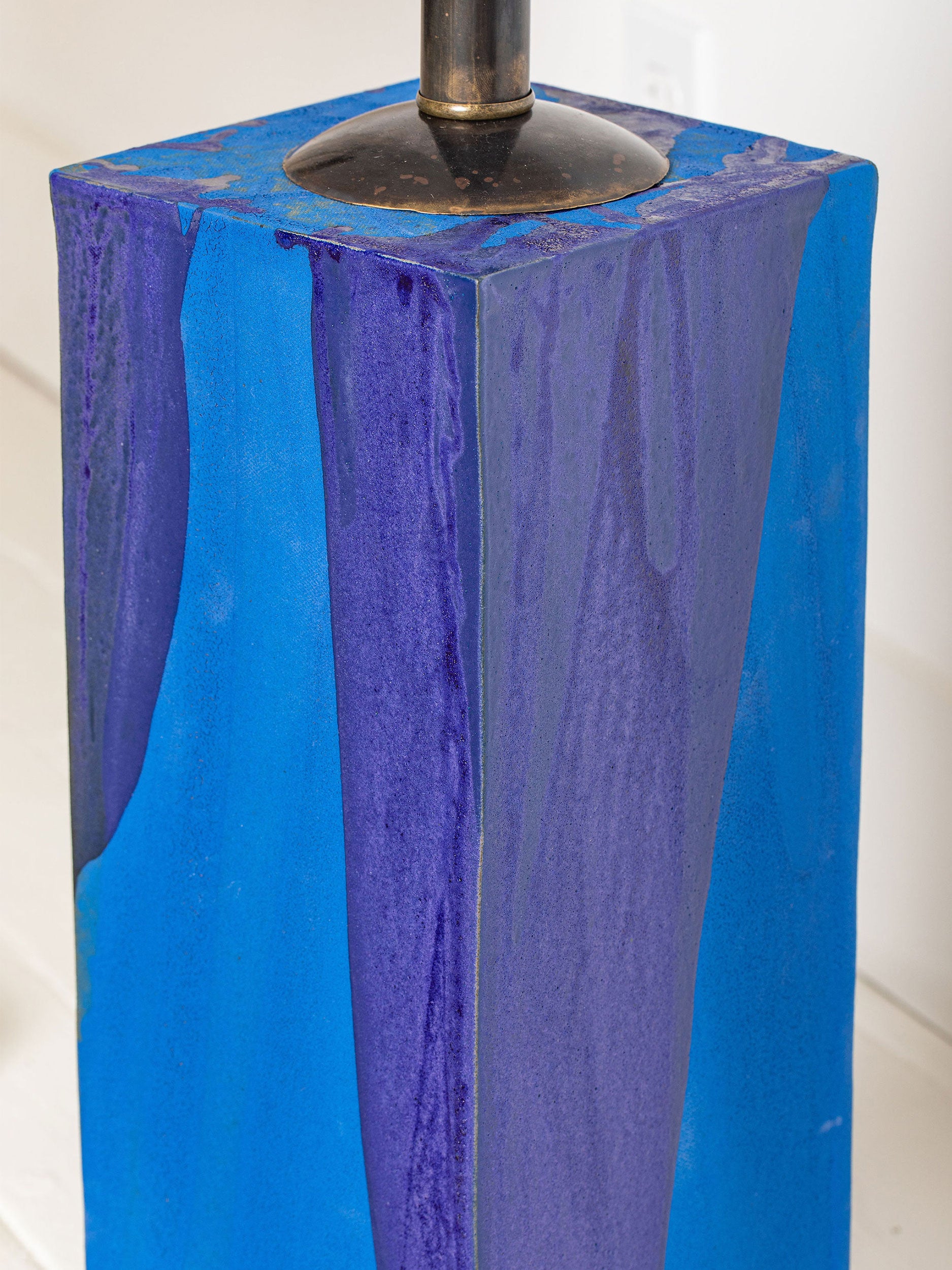 Pictured here in ultramarine and navy poured glaze, antique brass fittings, black cloth cord, in line switch, and an archival watercolor paper shade in off-white with a string whip-stitch.