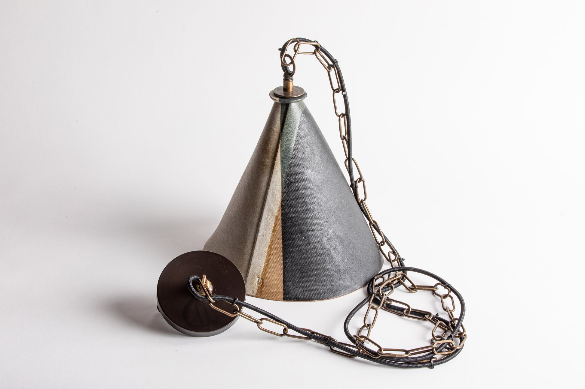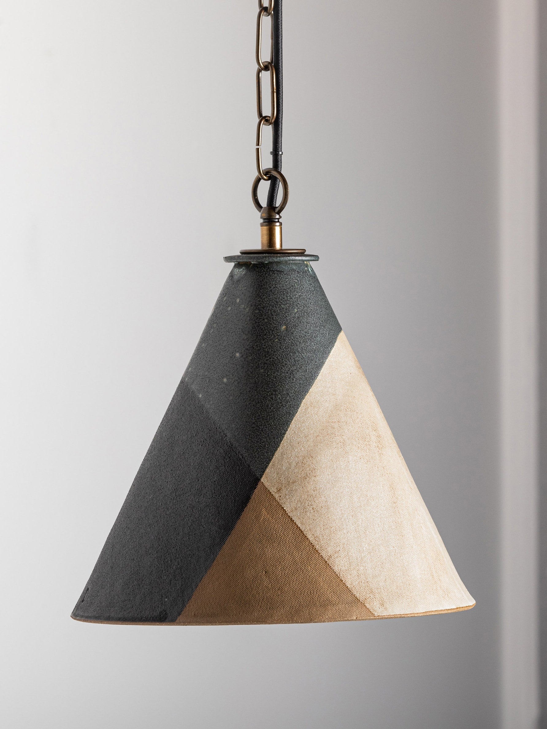 Pictured here in dipped matte-black and parchment glaze, antique brass fittings, a screwless canopy. It is supplied with a 6 foot chain & black-cloth cord.
